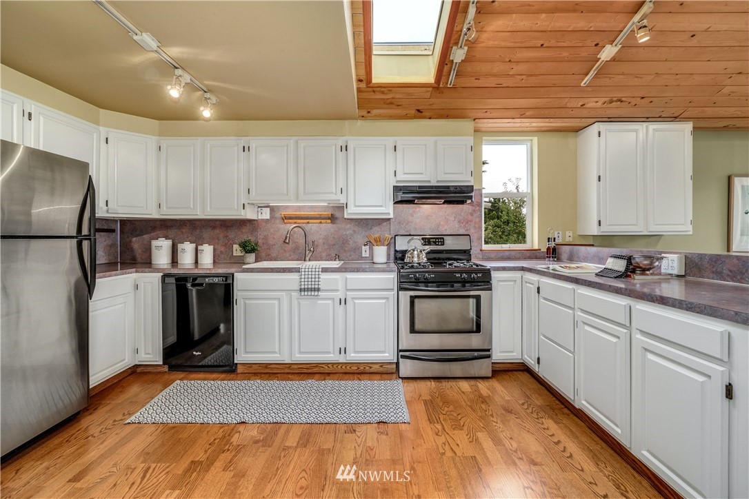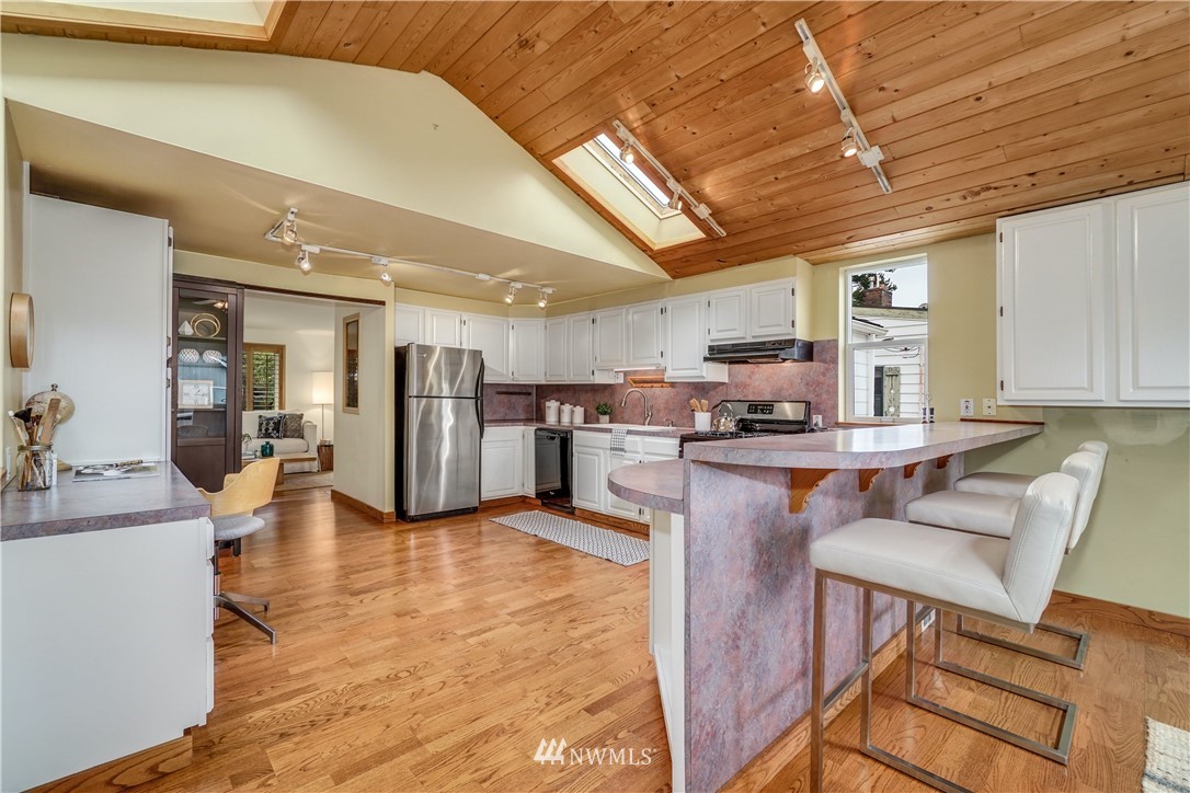 This sun-splashed, move-in ready 4BD/2BA is ideally located on the lower east side of Magnolia. Mins to Fisherman's Terminal, Discovery Park, Elliott Bay Marina and easy access to the Elliott Bay Bike Trail. 20 mins to Downtown Seattle. The main level includes living room w/ fireplace, reading nook, open kitchen w/vaulted ceilings and an oversized, bright dining room. Enjoy pristine hardwoods, abundant windows & skylights along w/ two main flr beds & a full guest bath. Below, the primary suite includes a private bathroom. A fourth bedroom, rec room, laundry, storage and kitchen complete the flexible layout. Oversized 6,000SF lot offers off-street parking, a patio & terraced gardens.