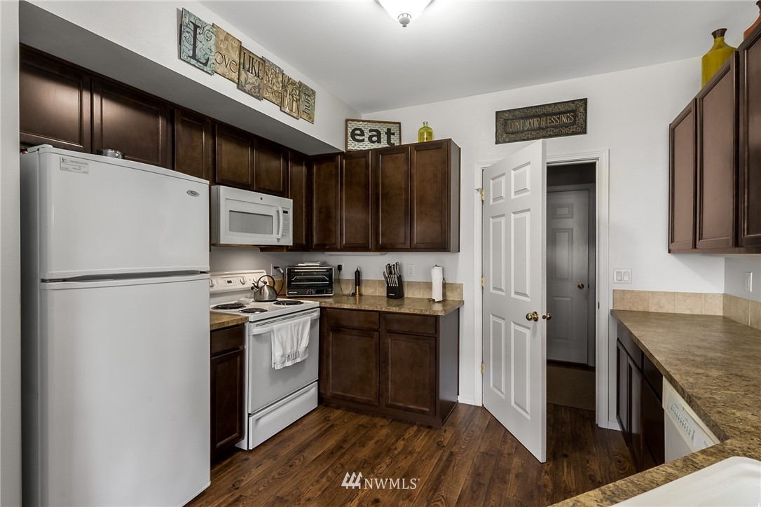 Well-maintained and desirable downtown Puyallup condo that overlooks the courtyard! Enjoy a lower level end unit that offers a spacious and easy flowing floor plan. This cozy home features white framed windows, ceiling fans, AC, 9 ft ceilings, and timeless kitchen with lots of cabinets for extra space. All appliances included. Lovely patio out front and a large garage to allow for plenty of storage. Close access to hospital, freeway, shopping, and fairgrounds... everything you need!
