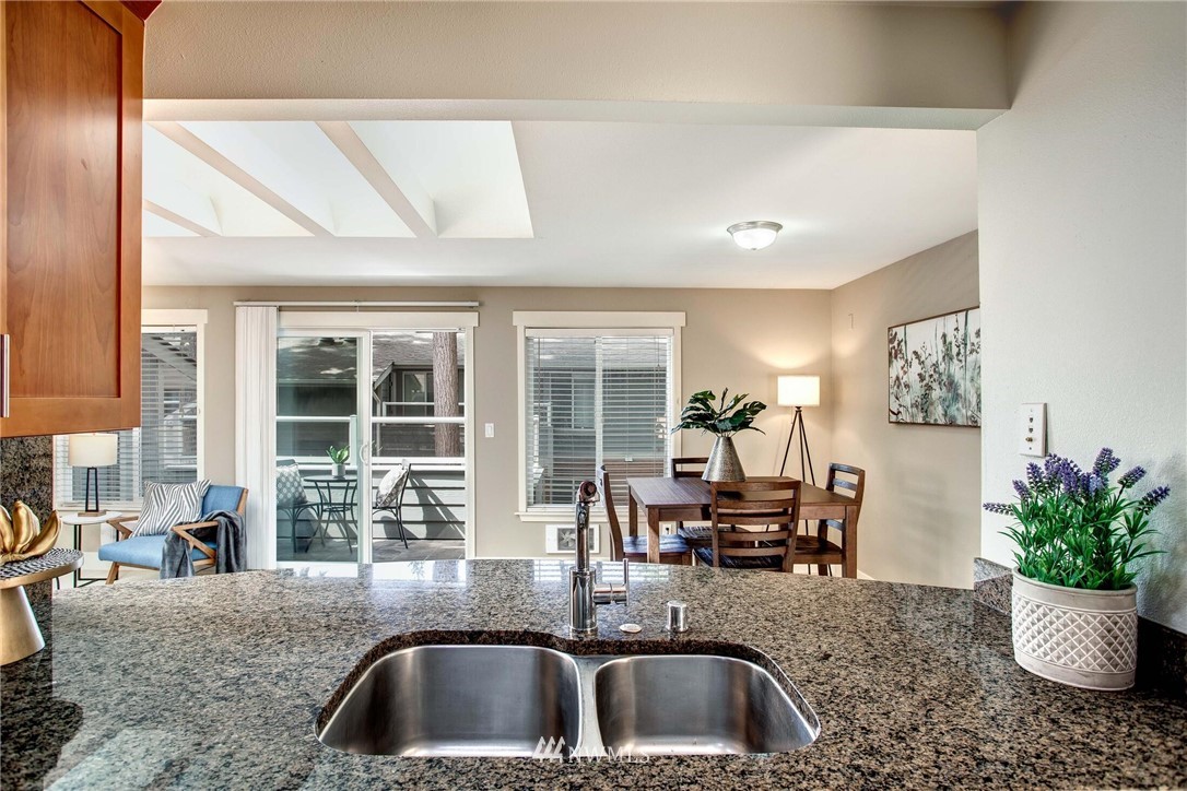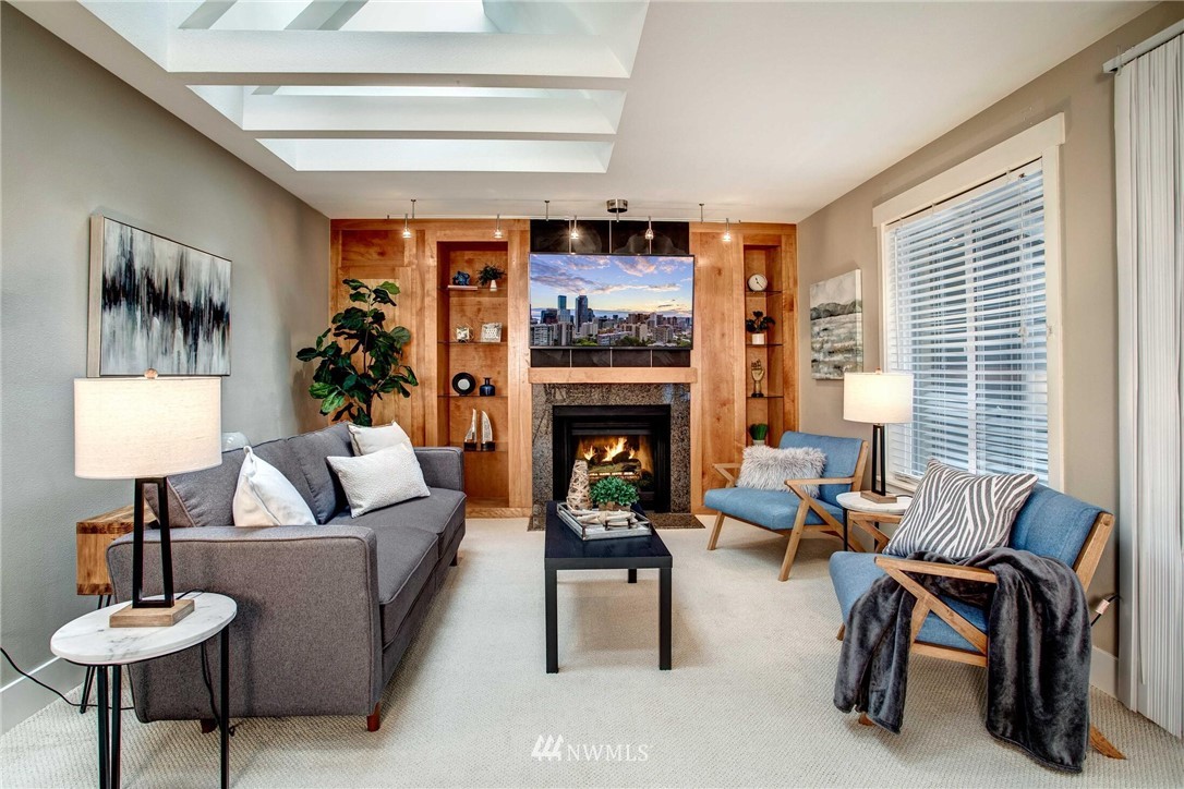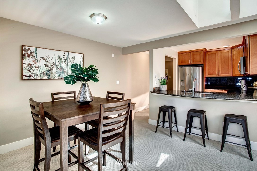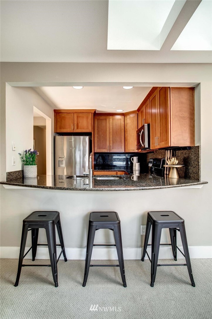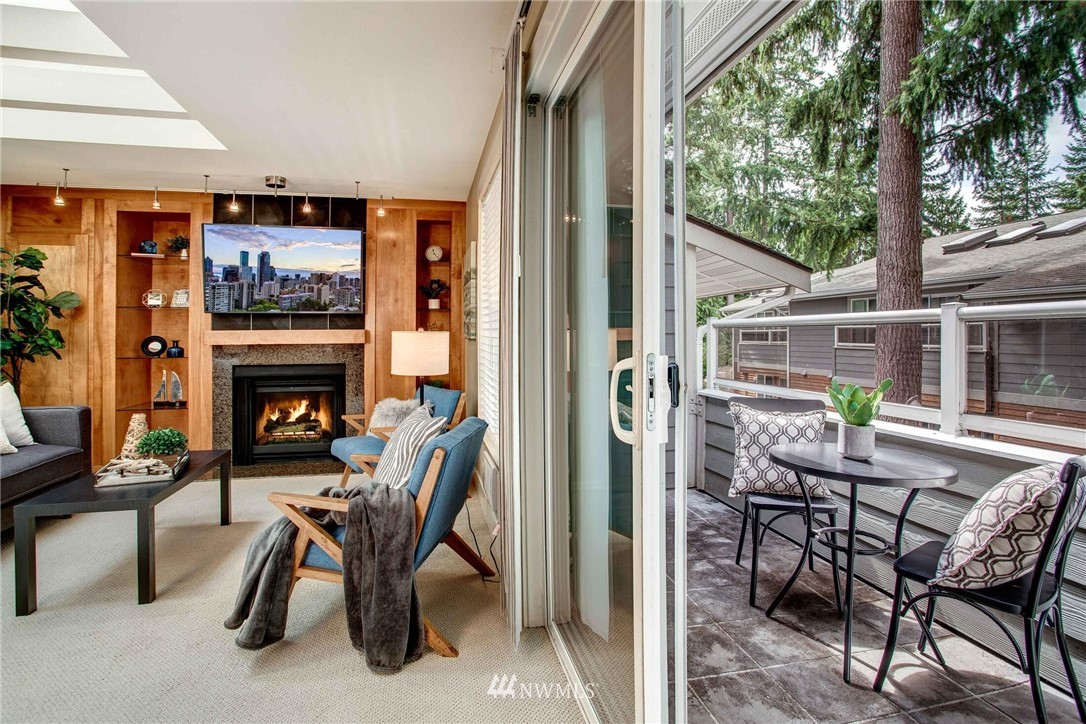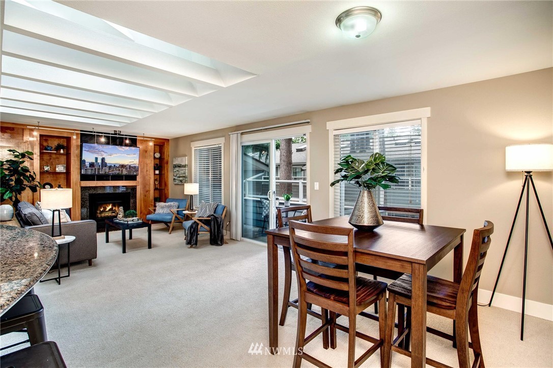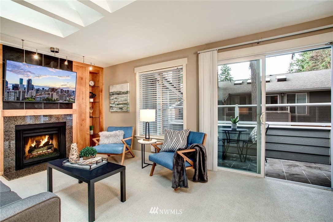 Centrally located in the heart of East Bellevue, this top floor, two-bedroom, two-bathroom condo features its own private garage, in addition to two private storage units. Gourmet kitchen with bar seating features slab granite countertops, custom wood cabinets and high-end SS appliances. Open concept floor plan offers abundant room for dining and living areas, with inspiring and architecturally intriguing skylights that overflow with natural light. Slate fireplace, custom built-ins, skylights in nearly every room and a covered private deck complete this modern home. Easy walk to shopping, bus lines and trails. Close to freeways and minutes from the Spring District. Welcome home!