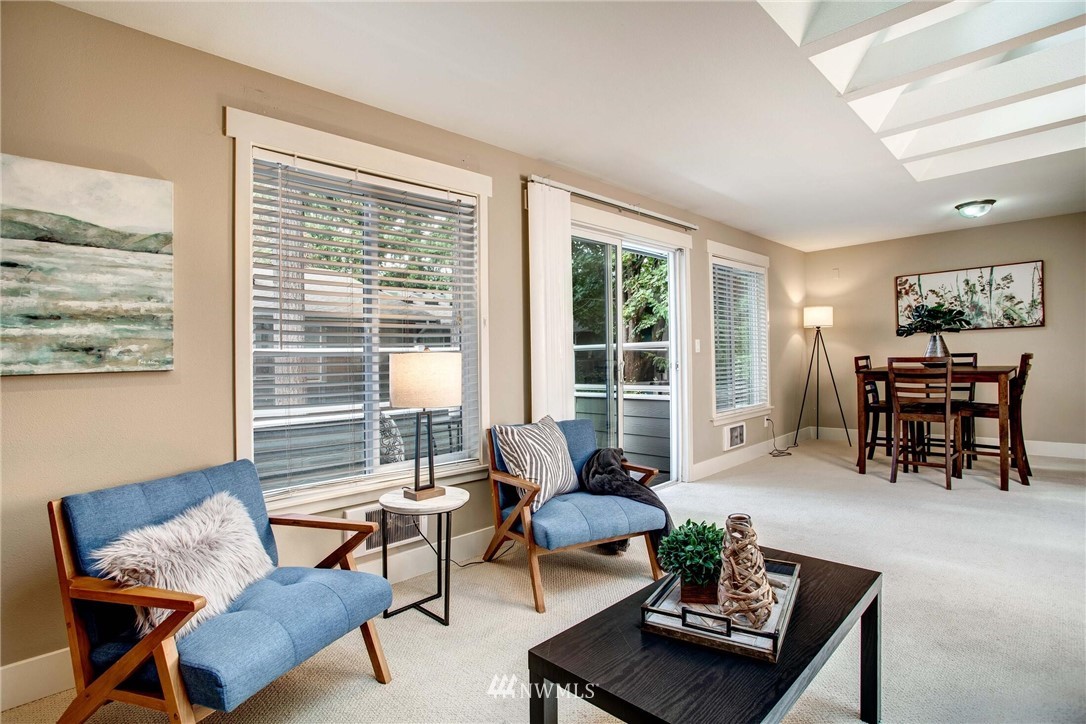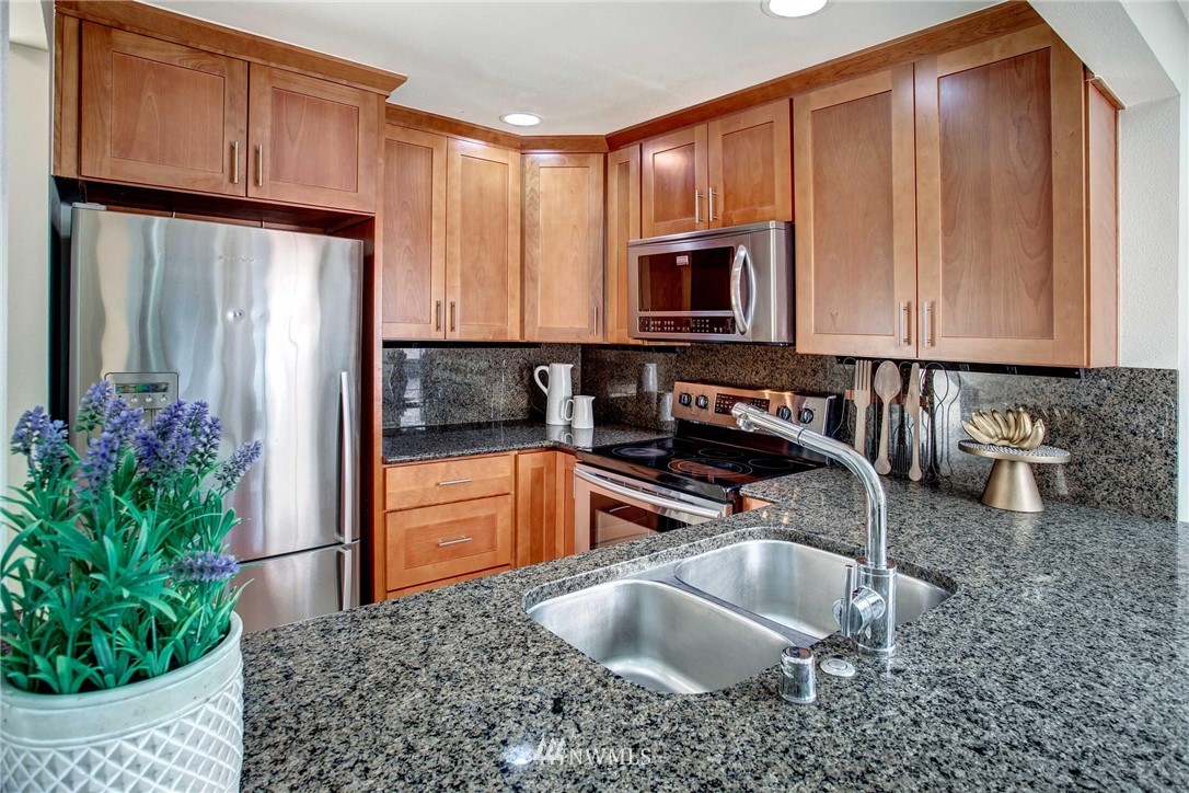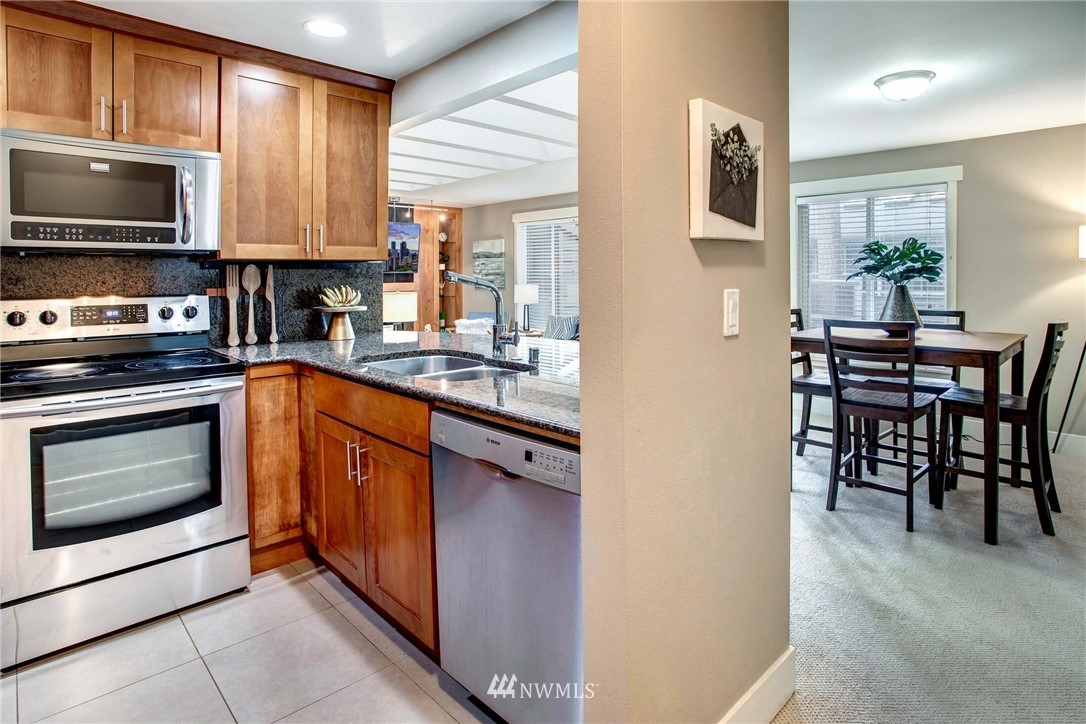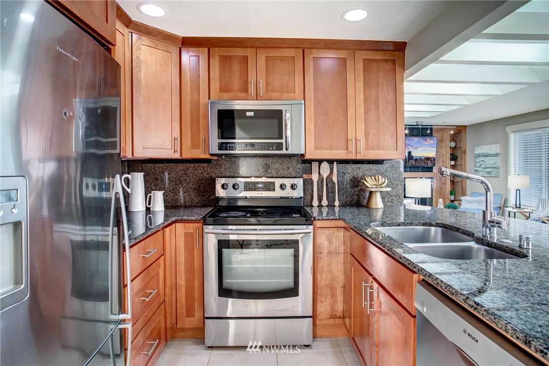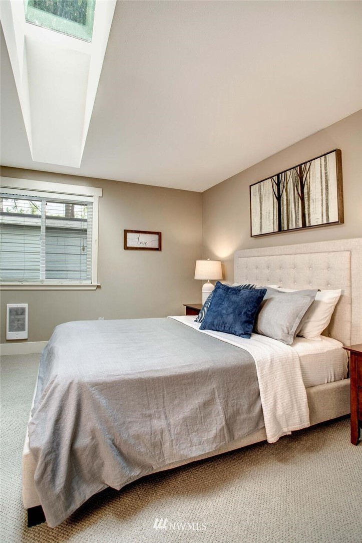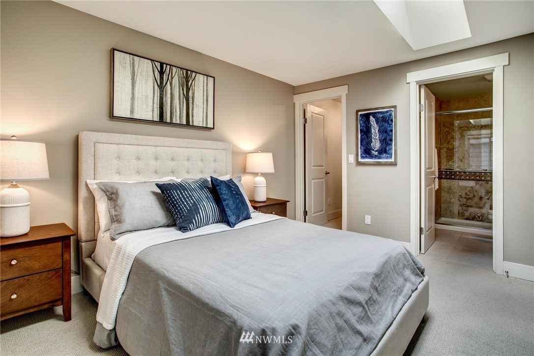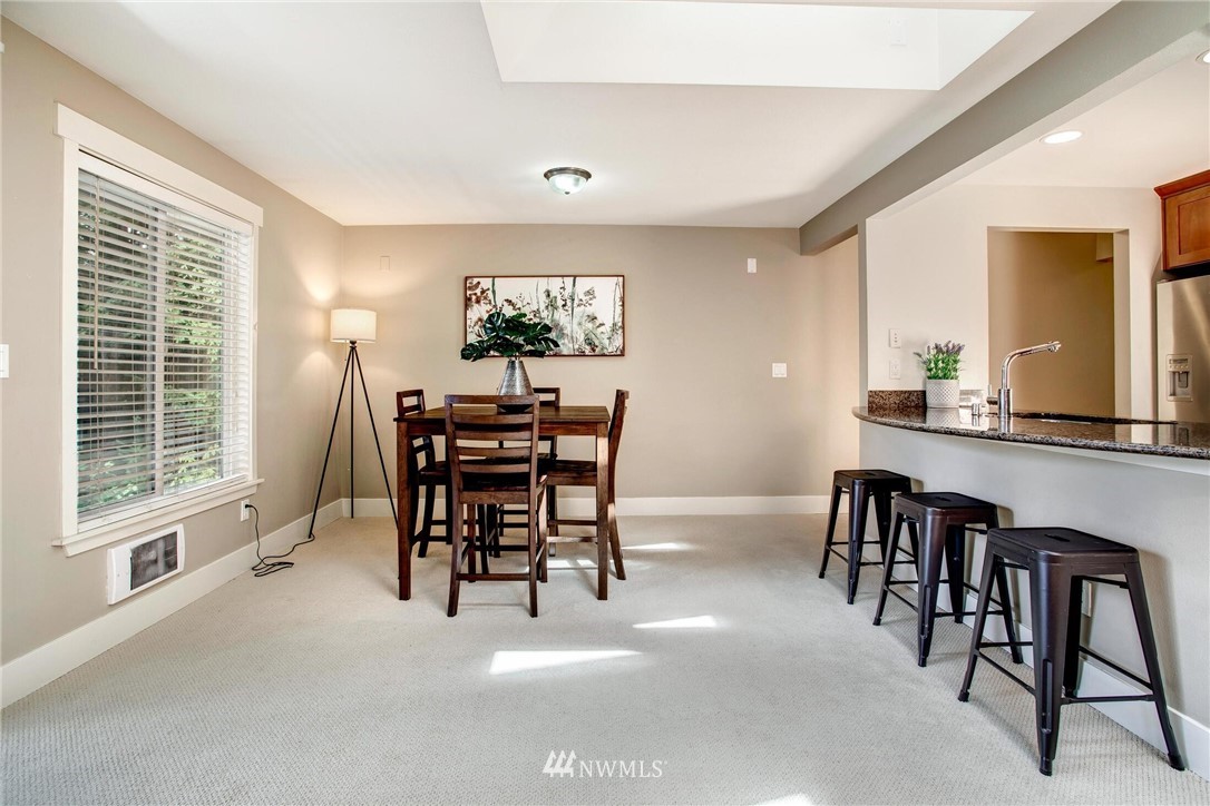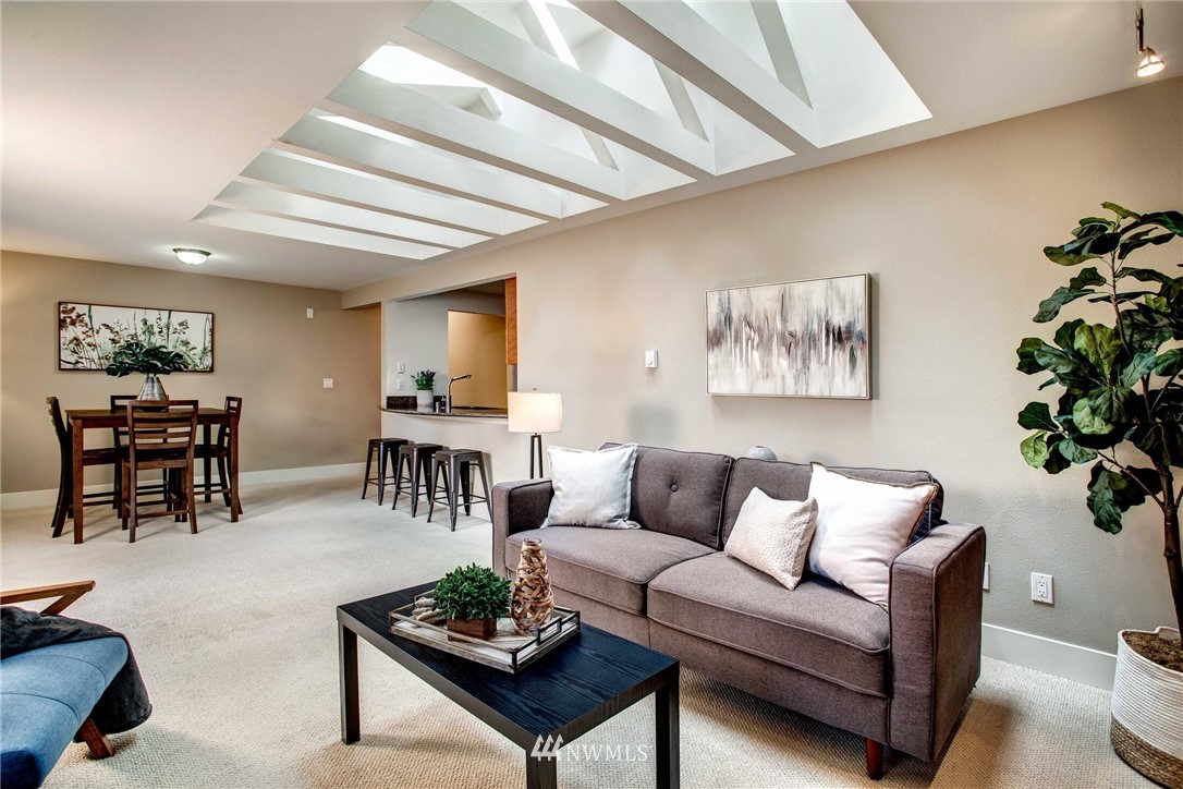 Centrally located in the heart of East Bellevue, this top floor, two-bedroom, two-bathroom condo features its own private garage, in addition to two private storage units. Gourmet kitchen with bar seating features slab granite countertops, custom wood cabinets and high-end SS appliances. Open concept floor plan offers abundant room for dining and living areas, with inspiring and architecturally intriguing skylights that overflow with natural light. Slate fireplace, custom built-ins, skylights in nearly every room and a covered private deck complete this modern home. Easy walk to shopping, bus lines and trails. Close to freeways and minutes from the Spring District. Welcome home!