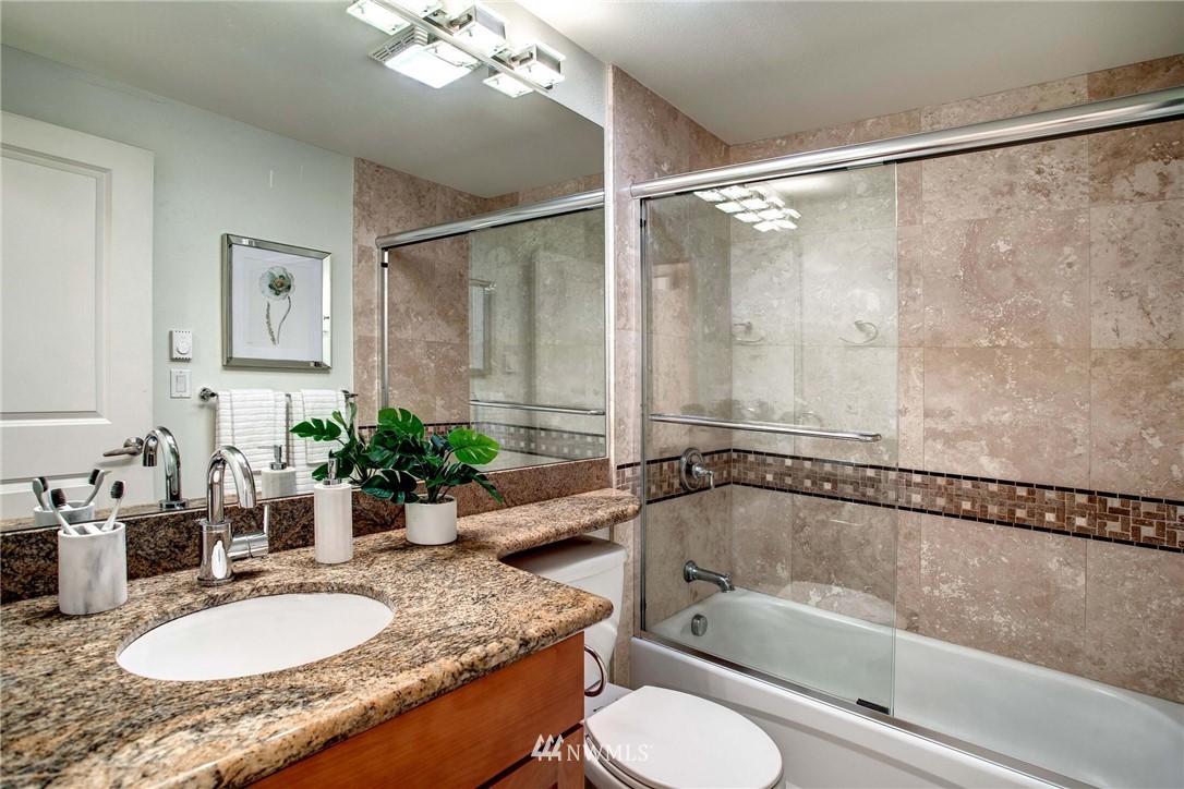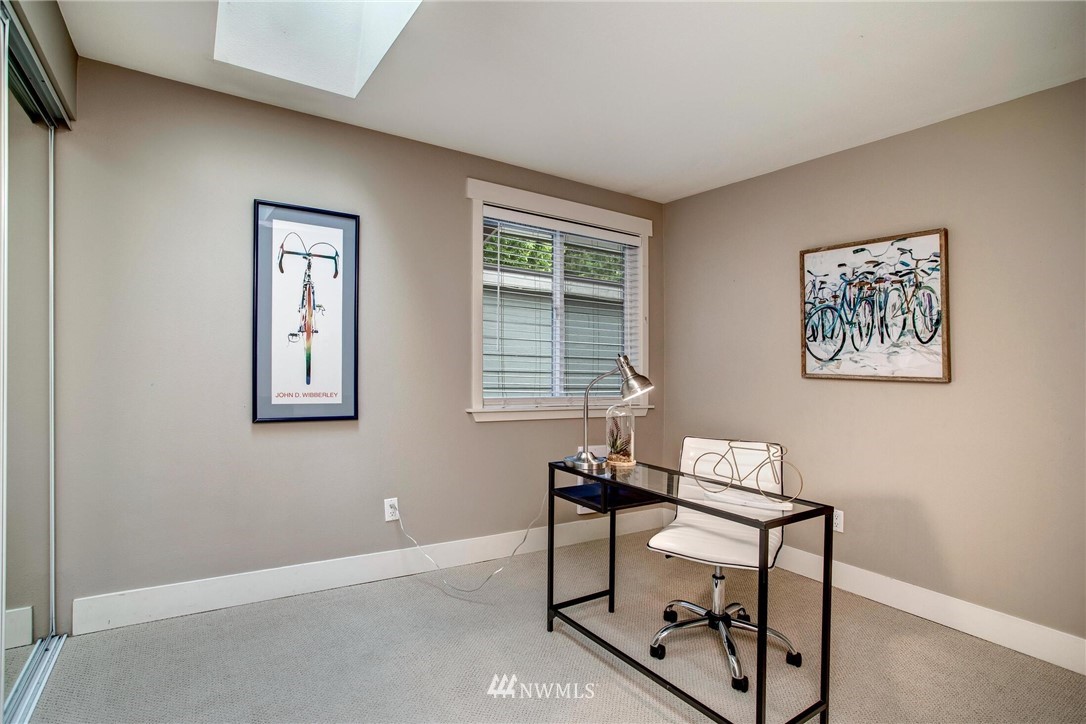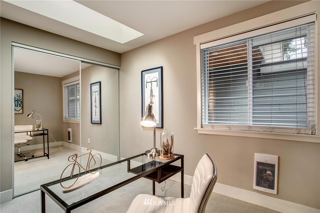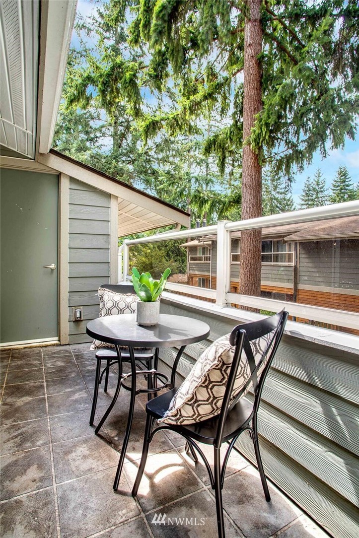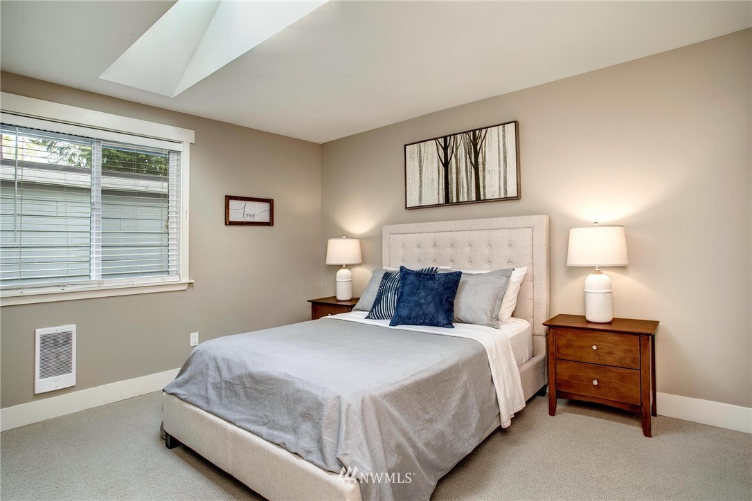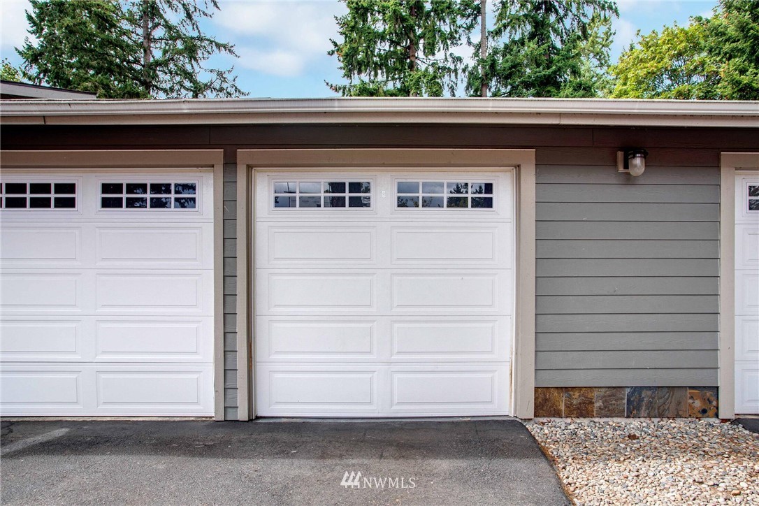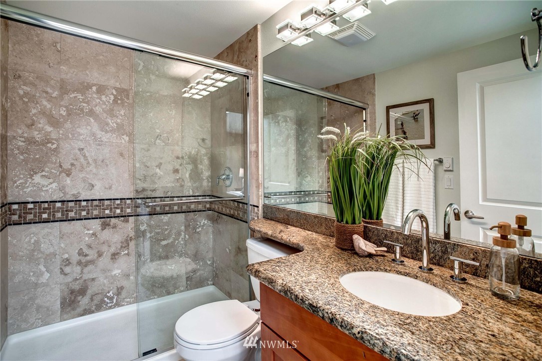 Centrally located in the heart of East Bellevue, this top floor, two-bedroom, two-bathroom condo features its own private garage, in addition to two private storage units. Gourmet kitchen with bar seating features slab granite countertops, custom wood cabinets and high-end SS appliances. Open concept floor plan offers abundant room for dining and living areas, with inspiring and architecturally intriguing skylights that overflow with natural light. Slate fireplace, custom built-ins, skylights in nearly every room and a covered private deck complete this modern home. Easy walk to shopping, bus lines and trails. Close to freeways and minutes from the Spring District. Welcome home!