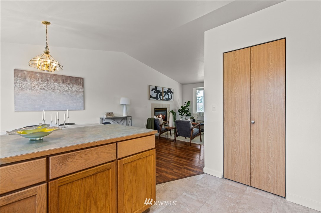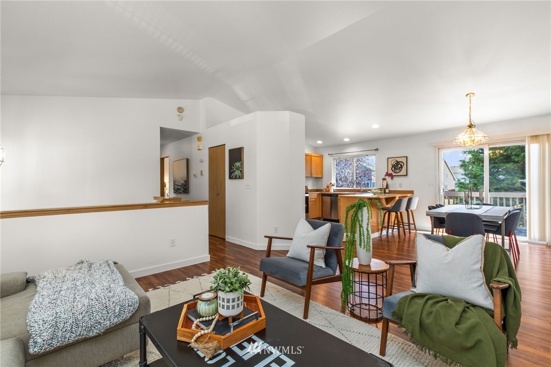 open to the dining room and expansive living space with vaulted ceilings & fireplace. Sliding glass doors allow for