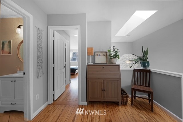 in the main. Open and airy feel with vaulted entry, skylights, versatile loft space for home office/school. Gas fireplace in