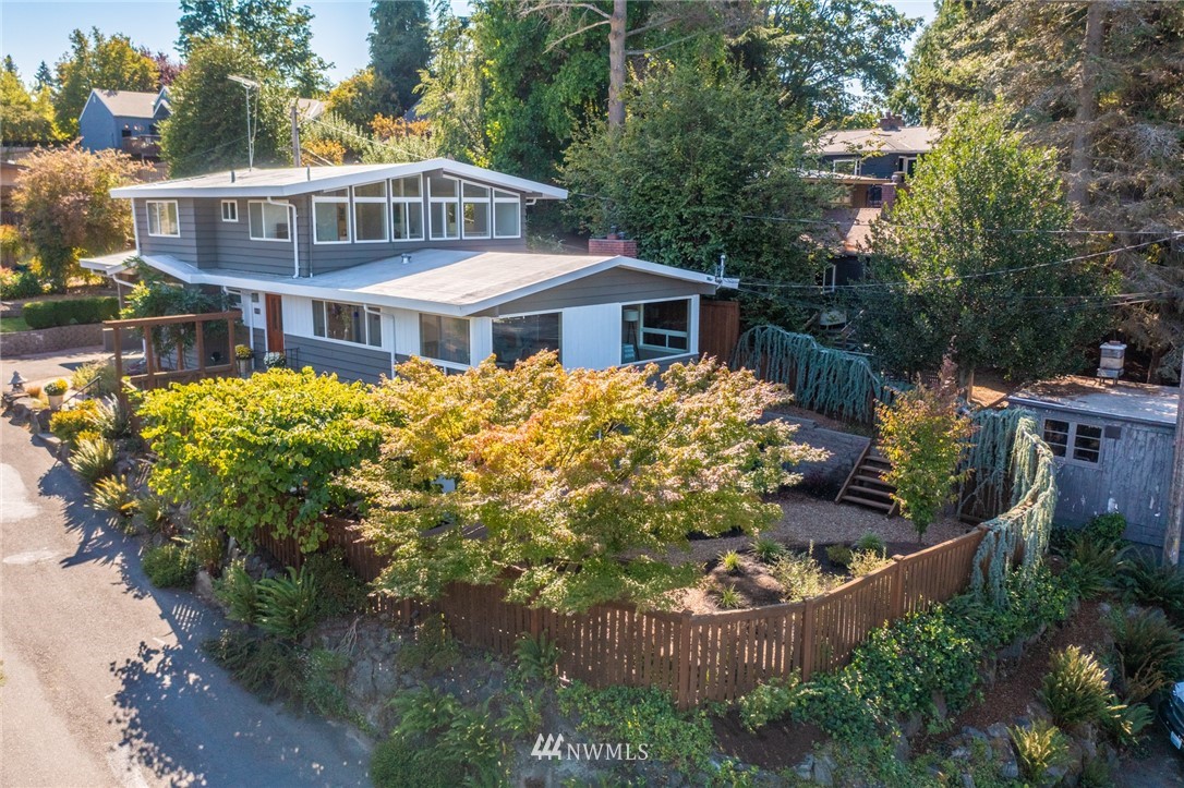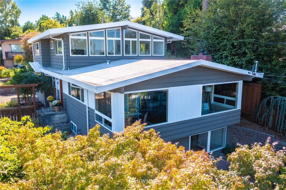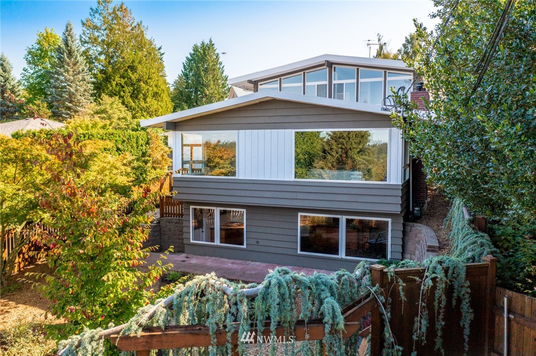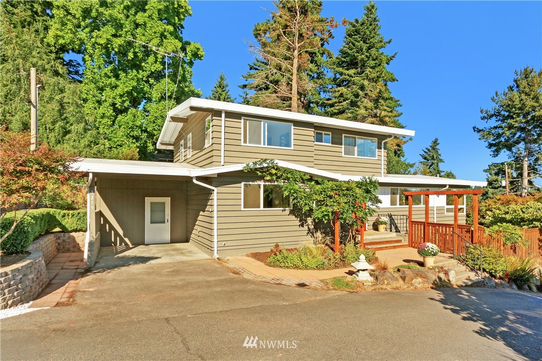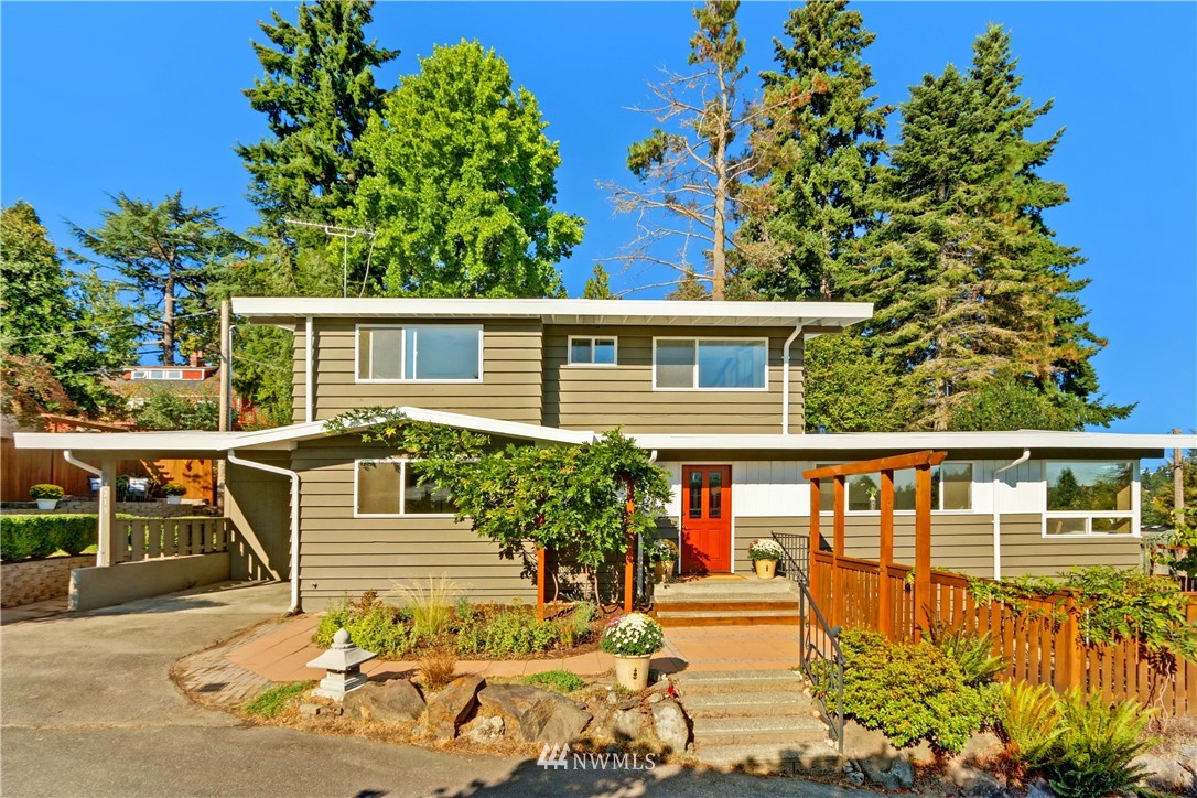 So much light from the moment you walk in! Sweeping north & east territorial views enhance all the public spaces in this well proportioned Mid-Century gem. Entertain gracefully with the circular floor plan & wall of windows through the kitchen, living & dining rooms. Multiple patios offer a variety of outdoor dining options. Recently renovated kitchen is exceptionally well appointed & has a great breakfast bar. The outlook gets even better in the light flooded 2nd story with a great room/office, bath & 2 generous bedrooms. From the lower level rec room with mini bar, refrigerator & a fireplace, enjoy more wall to wall windows & walk out to the level yard with mature plantings. Walk to park, community center, pool & tennis courts. MINT!