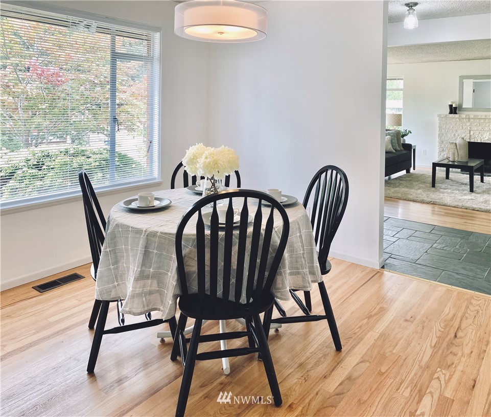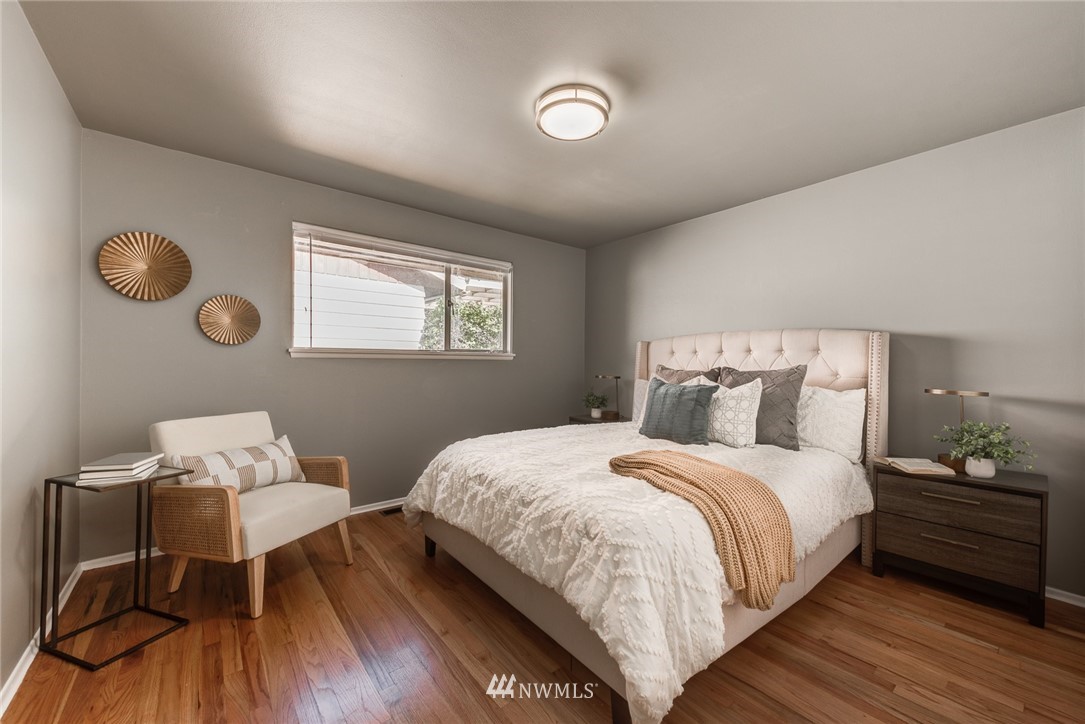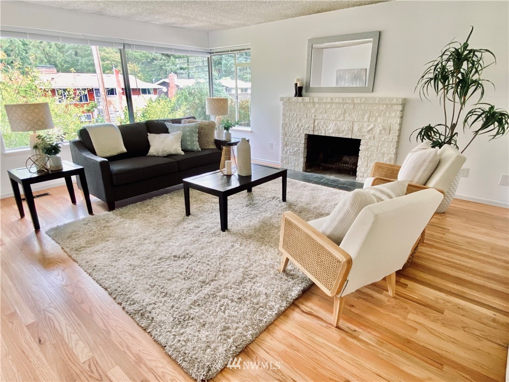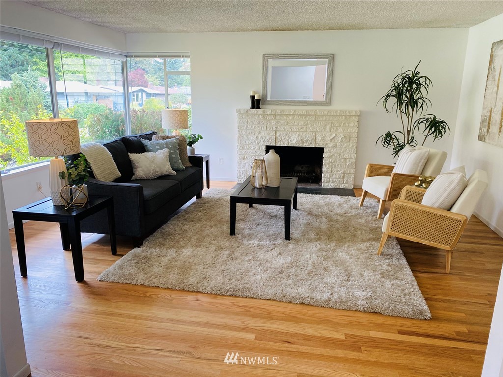 Move-in ready. This charming home in the sought-after Olympic Hills neighborhood is located on a quiet dead-end street. Main floor features a spacious living room w/ natural light & cozy wood-burning fireplace, kitchen w/ new butcher block countertops, generously-sized 2 beds, 1 full bath, family room & dining room. The daylight basement is fully-finished with a large bonus/rec room & fireplace w/ extra room space for an office, 1 bed, 3/4 bath & spacious utility/laundry room. Beautiful original oak hardwood floors on main floor, all new carpet downstairs & new light fixtures throughout! Fully fenced level backyard, private & perfect for gardening/hosting. Close to shops/restaurants/I-5/golf course/newly opened Northgate light rail & more.