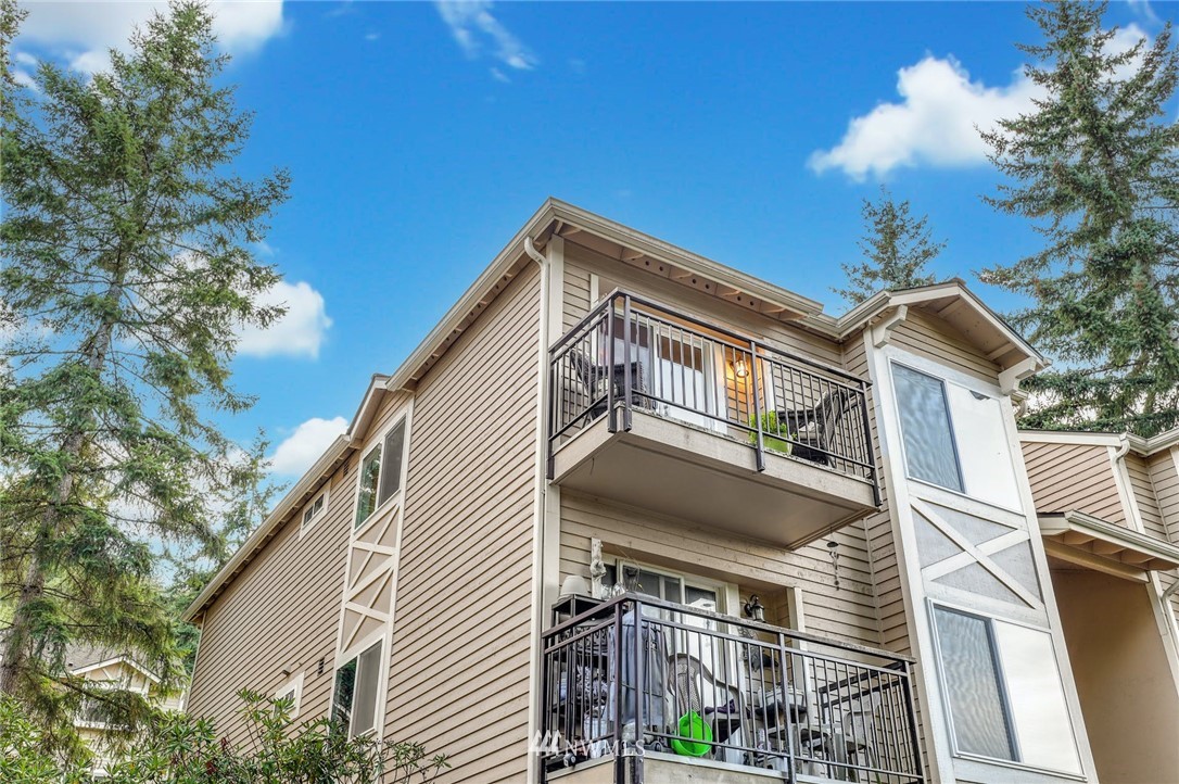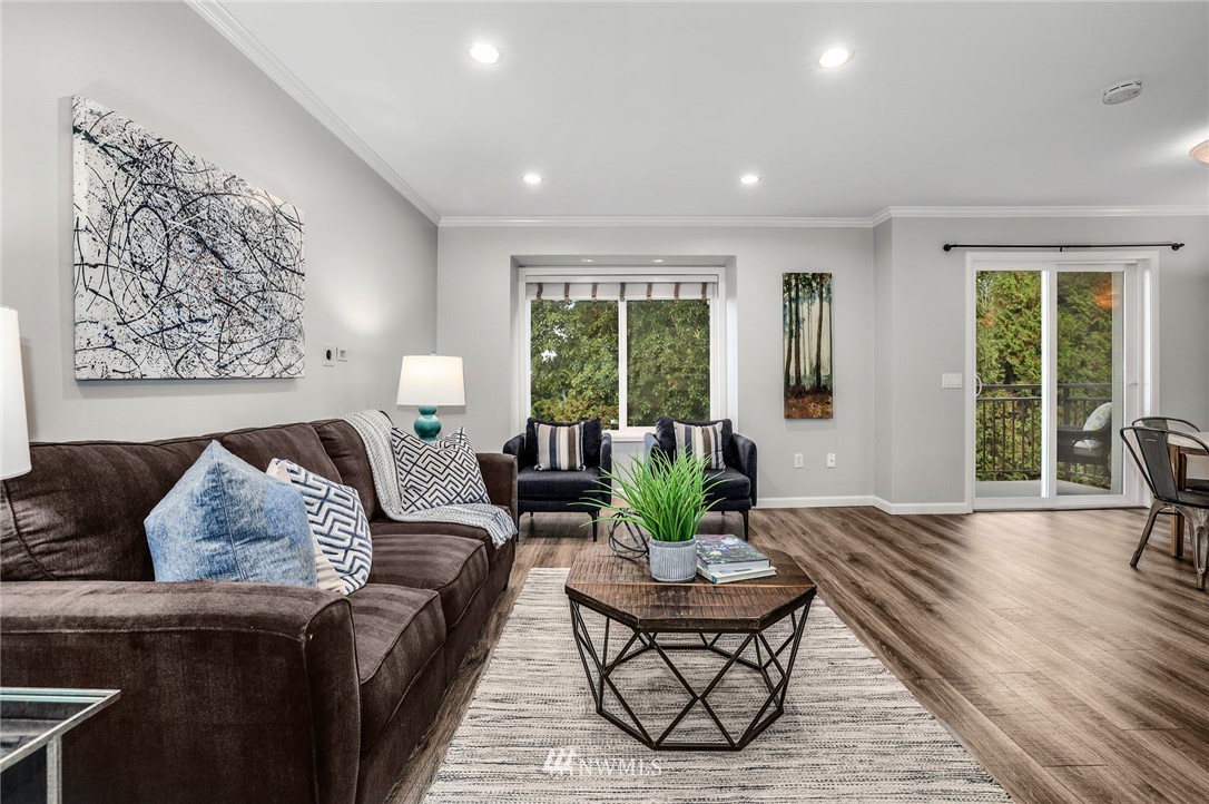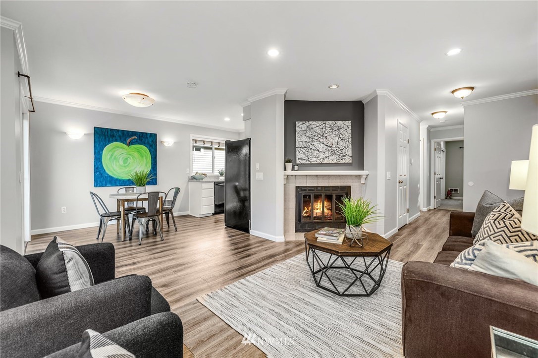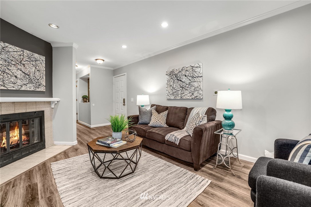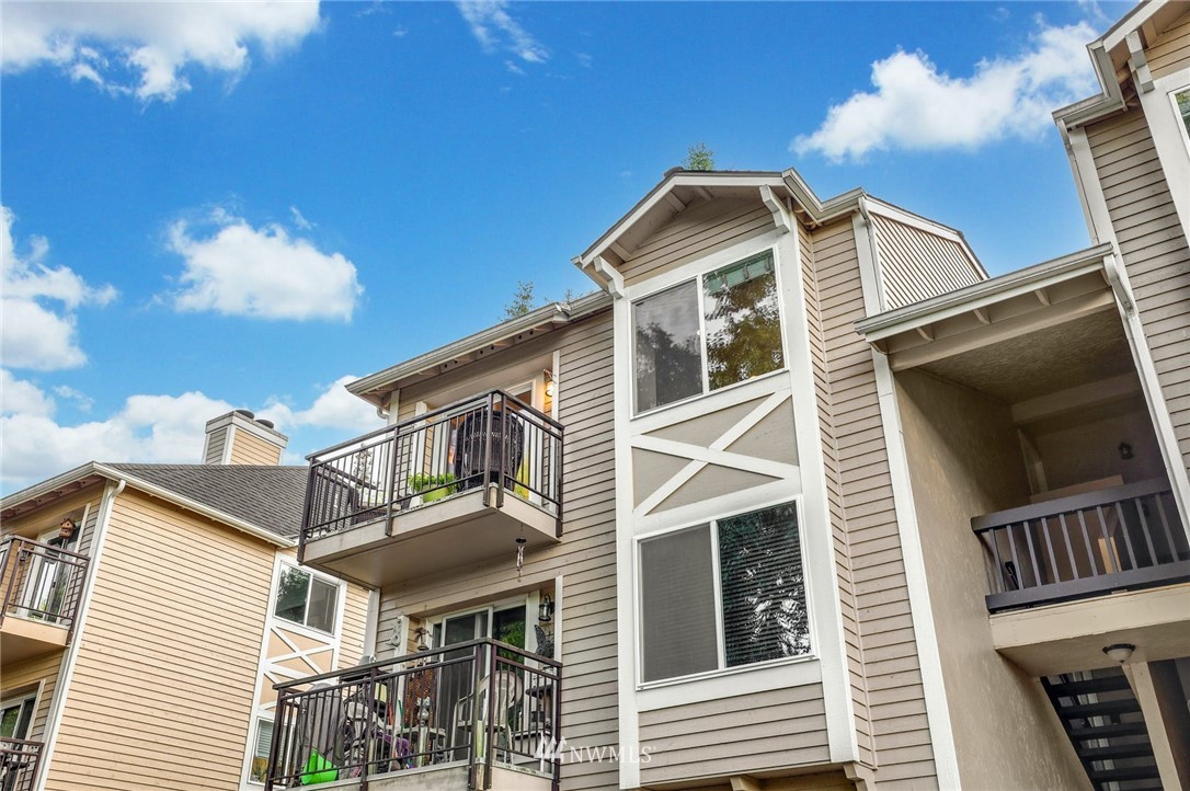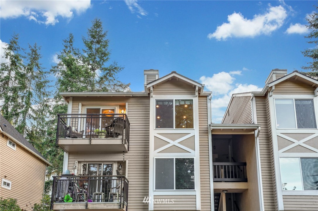 From sunrise to sunset, enjoy this beautiful top floor home! This end unit allows for multiple windows and natural light to flood each room. Large open floorplan flows from kitchen to dining to living, complete with a cozy wood burning fireplace. With tasteful updated throughout; laminate hardwood floors, new interior paint, updated bathrooms. Large primary bedroom with attached full bath, double closets. Fabulous community with clubhouse, tennis/pickle ball court and very strong HOA, pets allowed! Garage + additional parking and TONS of storage. Situated near the Burke Gilman Trail jump on and ride or just a short walk to DT Woodinville, coffee, restaurants, shopping & more! Convenient to the 405 makes this a perfect home! Pre-Inspected!
