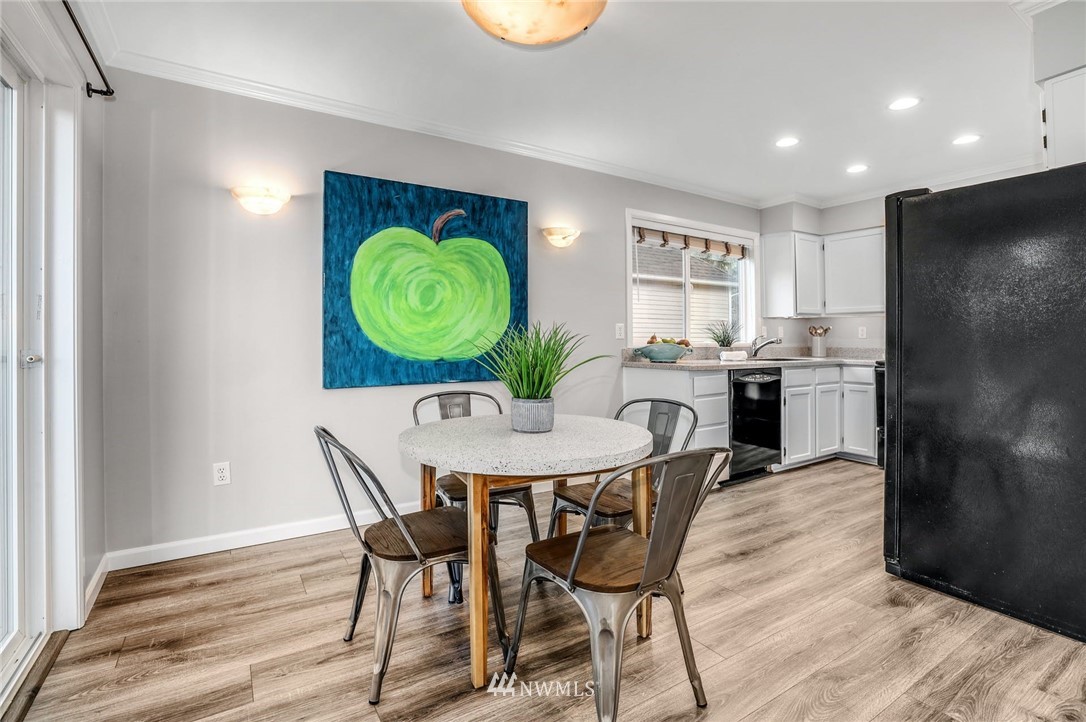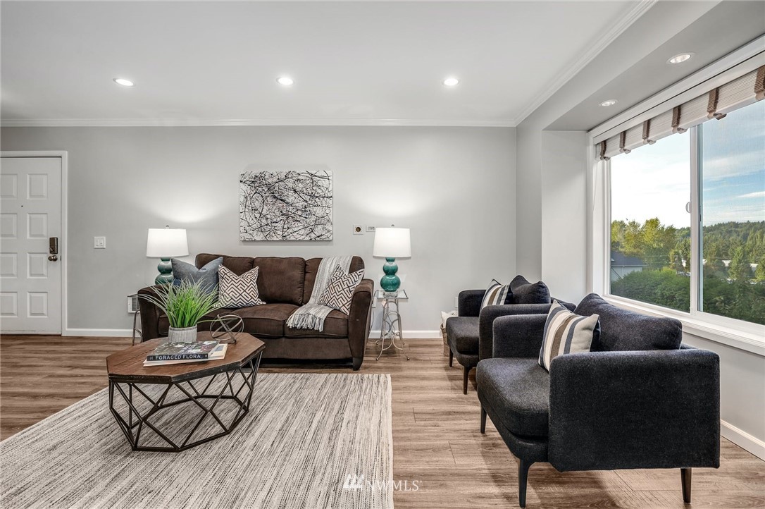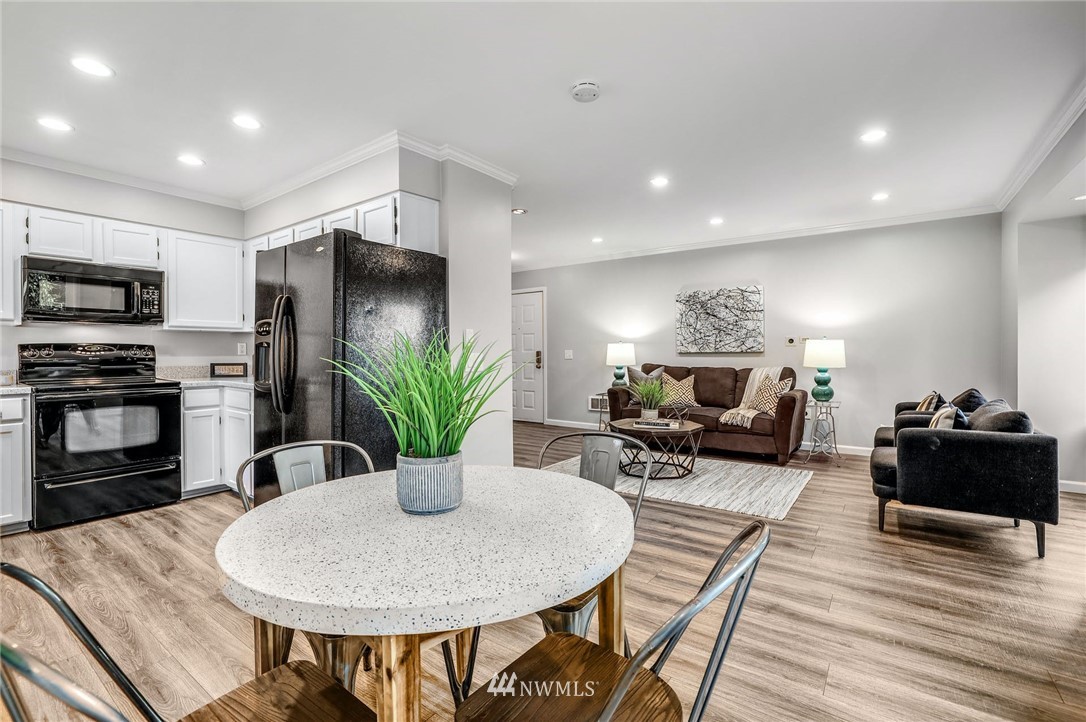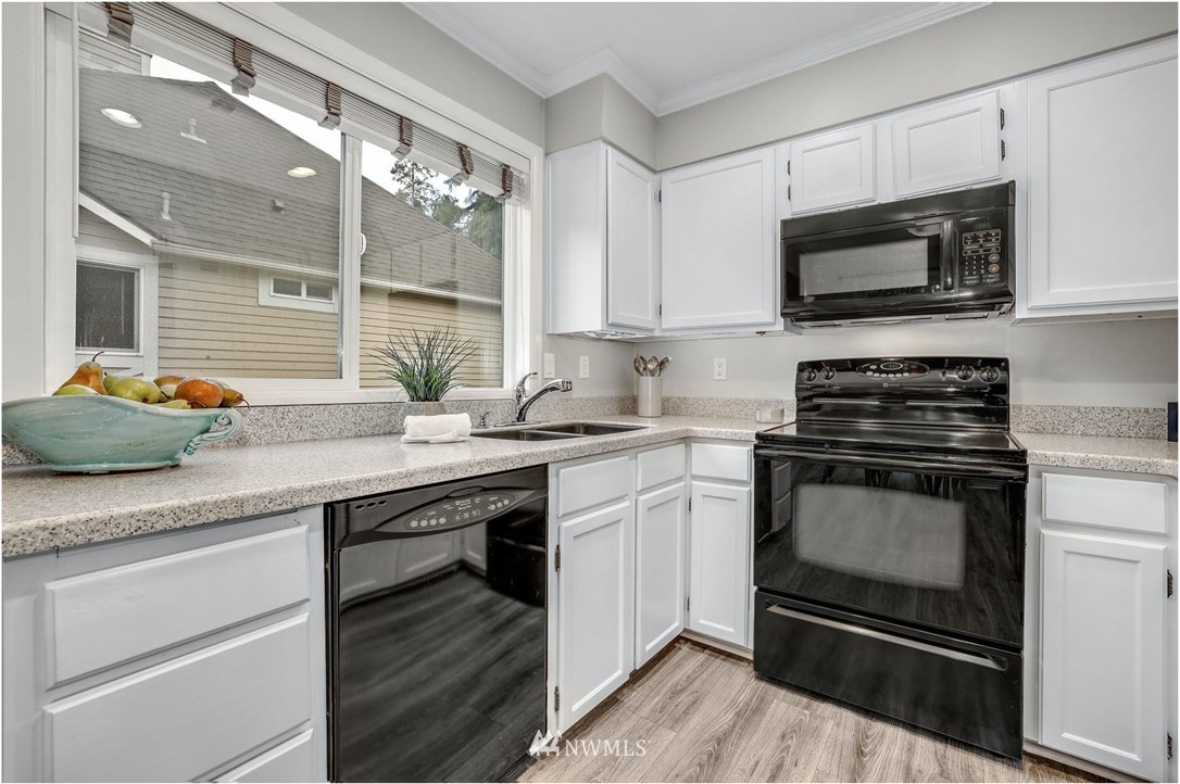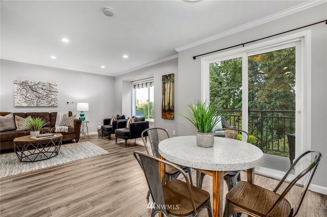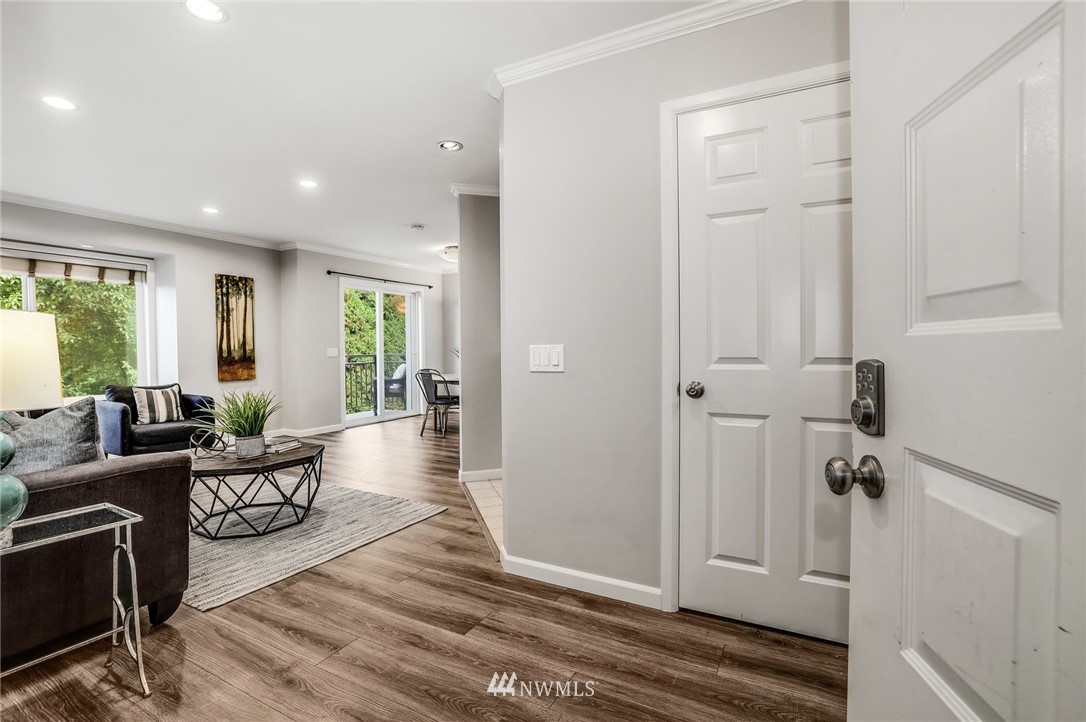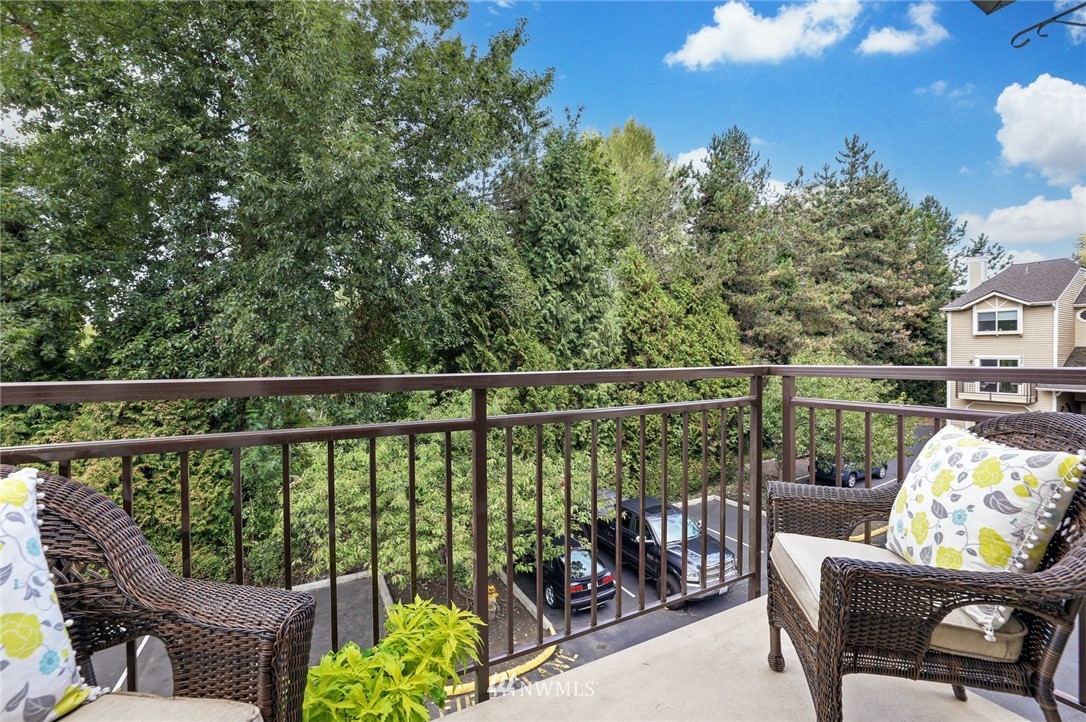 From sunrise to sunset, enjoy this beautiful top floor home! This end unit allows for multiple windows and natural light to flood each room. Large open floorplan flows from kitchen to dining to living, complete with a cozy wood burning fireplace. With tasteful updated throughout; laminate hardwood floors, new interior paint, updated bathrooms. Large primary bedroom with attached full bath, double closets. Fabulous community with clubhouse, tennis/pickle ball court and very strong HOA, pets allowed! Garage + additional parking and TONS of storage. Situated near the Burke Gilman Trail jump on and ride or just a short walk to DT Woodinville, coffee, restaurants, shopping & more! Convenient to the 405 makes this a perfect home! Pre-Inspected!