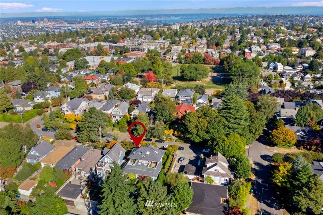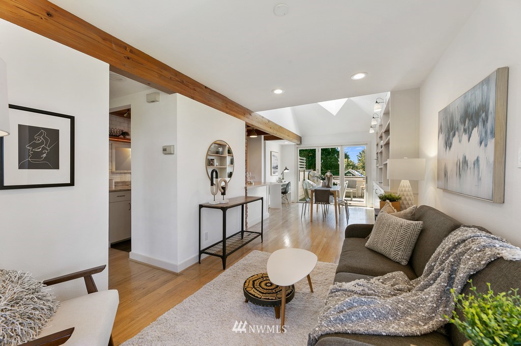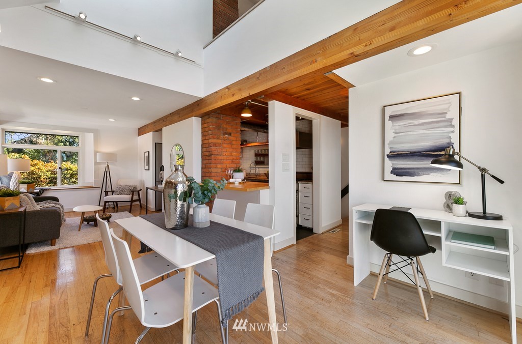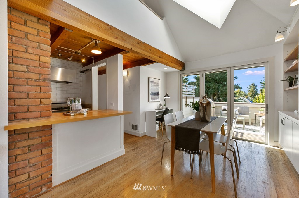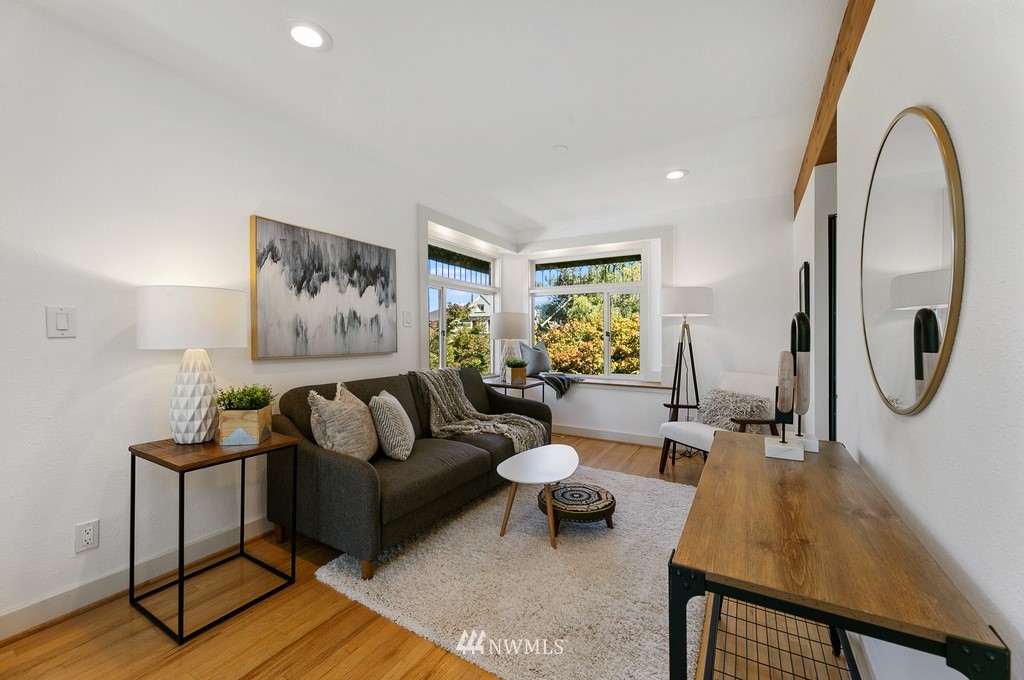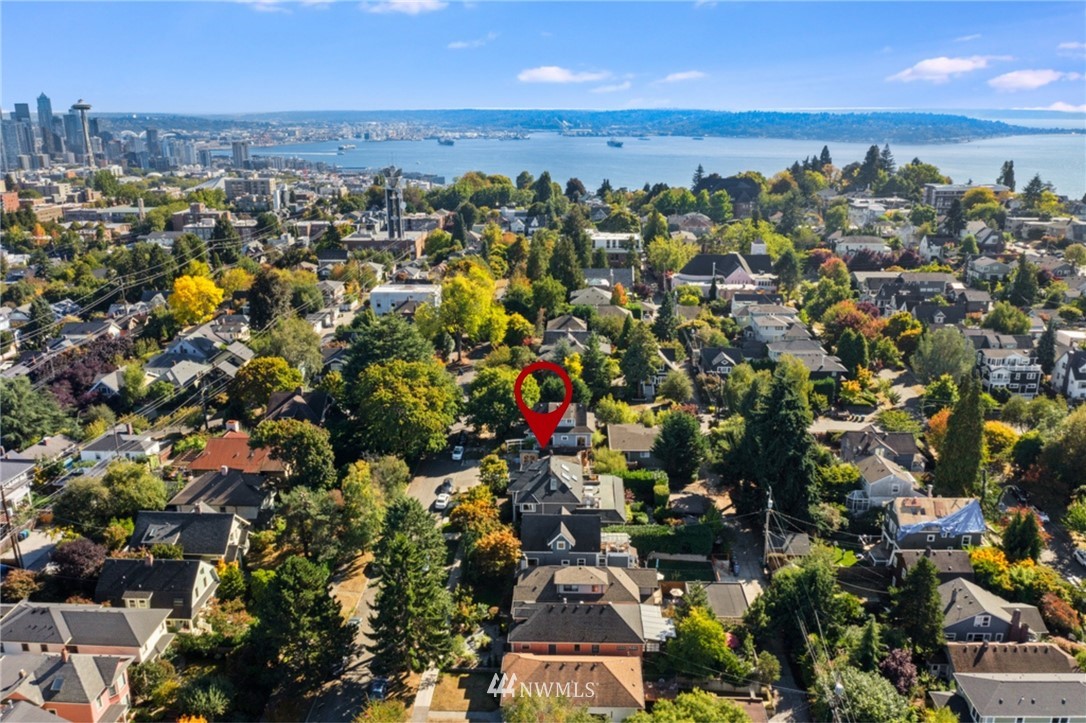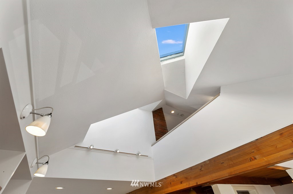 Exceptional living in Upper Queen Anne within the revered Janus House. Lives like a penthouse & SFH, on a gorgeous manicured 4th Ave W. You'll relish exposed wood-beamed ceiling & stairs, oak hardwood floors, bespoke lighting, custom built-ins, glowing with natural light. Modern updates highlight slab countertops, Miele & Liebherr stainless steel appliances, BlueStar Gas range, and dialed main en-suite. Fleetwood-style Nano wall panel draws you out to a private teak terrace to revel in Olympic western views & PNW sunsets. Supremely walkable to Kerry (Frasier view) Kinnear Parks, QAFM, Met Market, Trader Joe's, Flore & 5-Spot. Designated (covered) off-street parking (easy EV), added shop/storage space, heart of the Emerald City, Queen Anne!