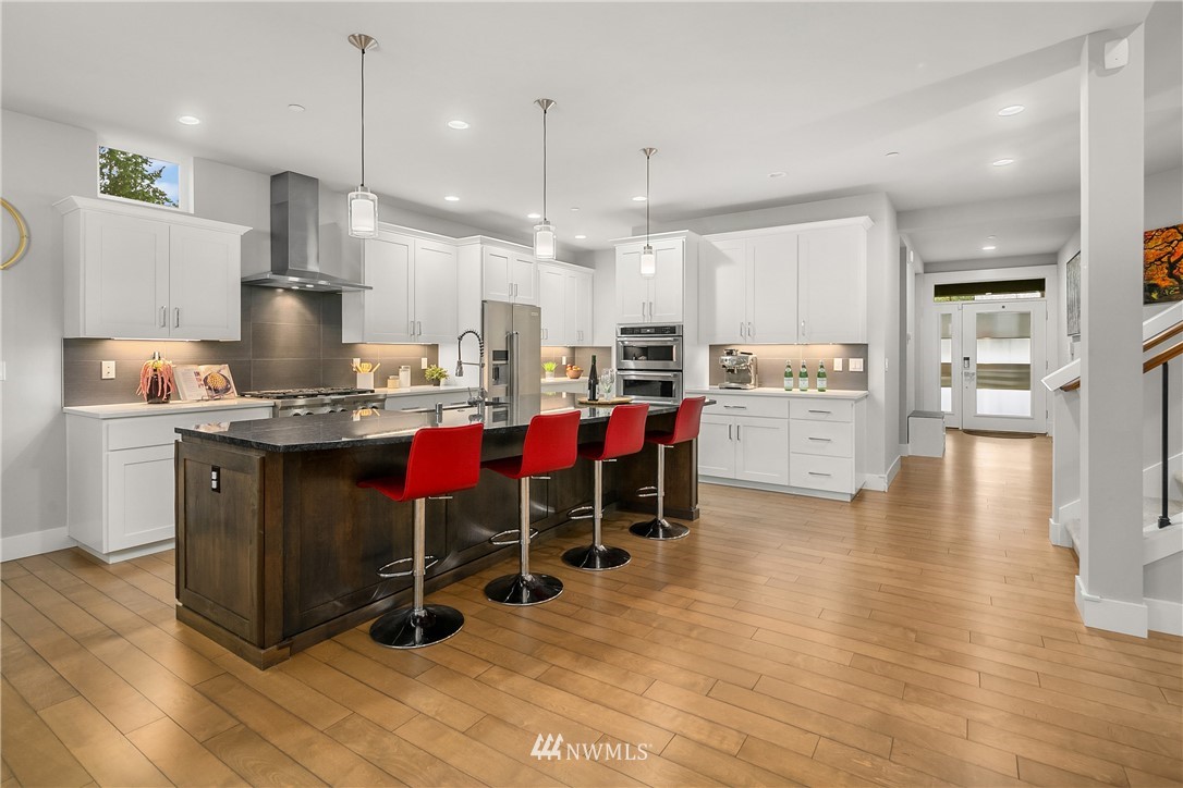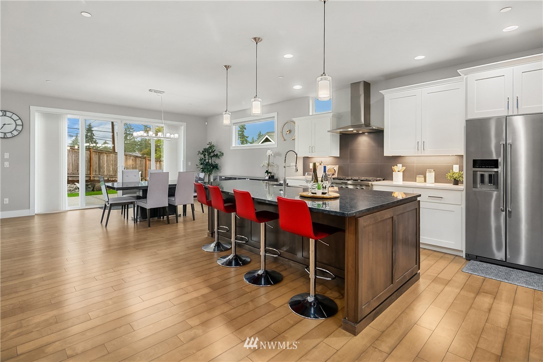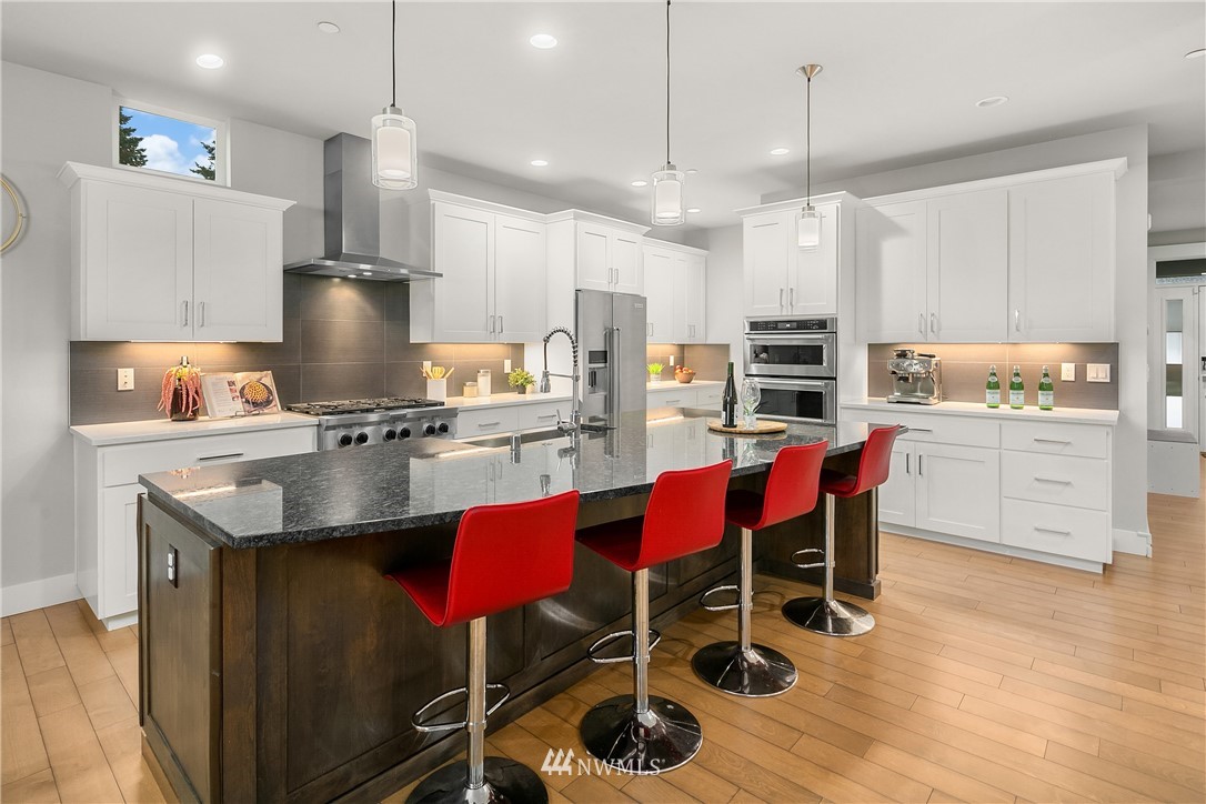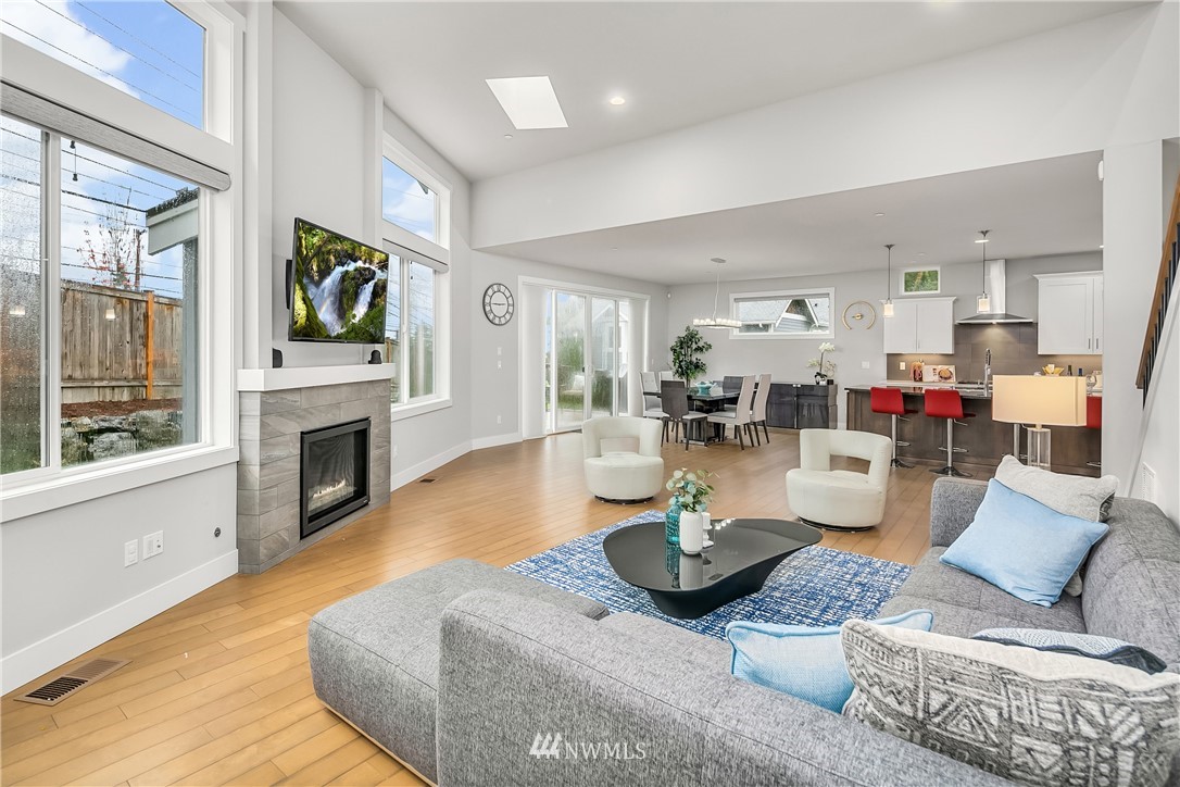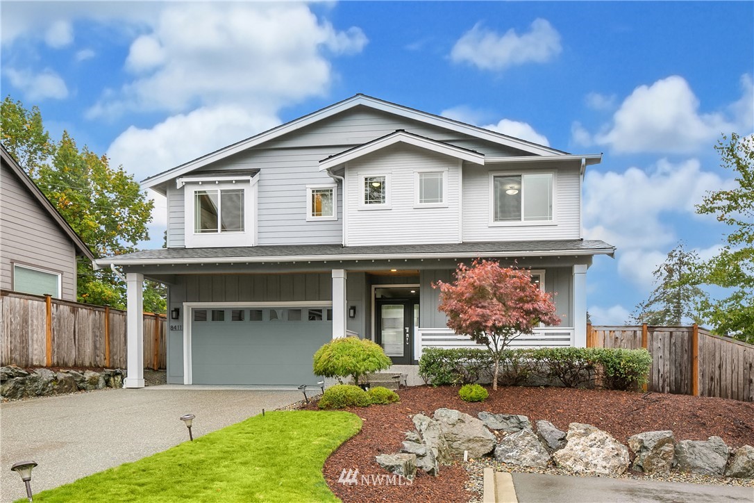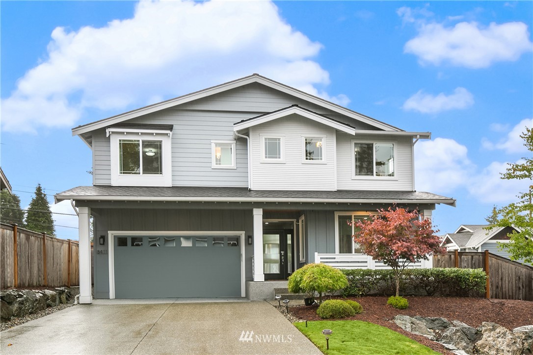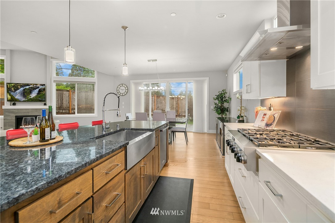 Like new, bright modern home in the heart of Kenmore! This gorgeous 2,910 sqft home features 4 beds, 3 baths & high-end finishes throughout. Chef's style kitchen w/ large slab quartz island, SS KitchenAid appliances, & open concept design. Enjoy bright natural light & sunset views from the 2-story vaulted great room. The main level offers hardwood flooring throughout & a guest suite w/ adjacent ensuite. Upper level massive primary suite w/ 5 piece ensuite & walk-in closet w/ custom built-ins. 2nd story laundry & loft for extra space! Central A/C & custom eave light system. Fully fenced yard w/ extended outdoor patio & gas hookups. Spacious garage w/ long driveway. Northshore School Dist! No HOA!
