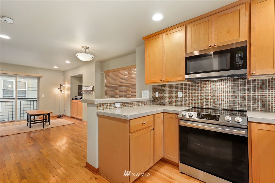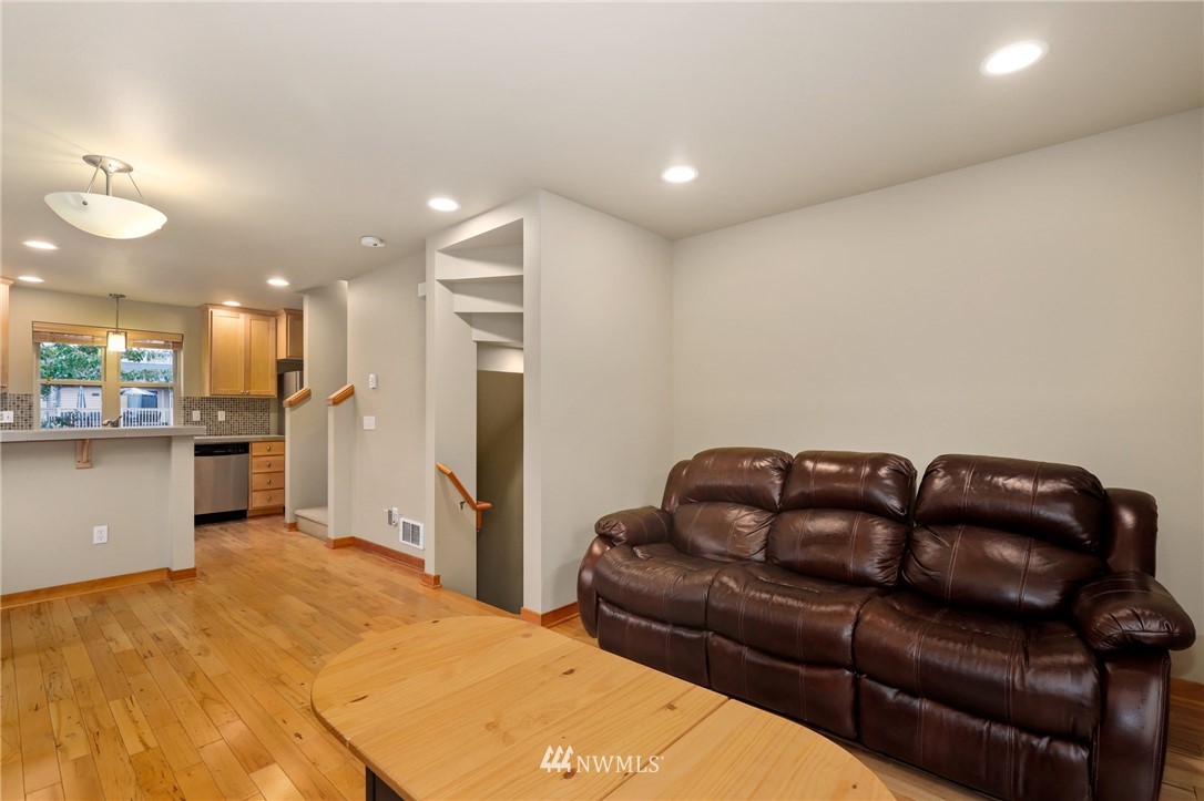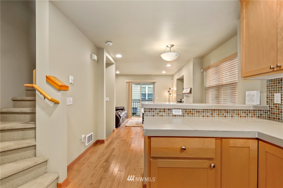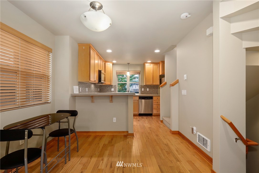 Lovely 3 bedroom townhome in Highland Park. Rare end unit that sits back off the road with a beautiful front yard, private fenced back yard & patio perfect for your furry friends. Main level open living/dining/kitchen area with beautiful maple hardwood floors, built-ins, designer tile backsplash, and breakfast bar. Two spacious upper-level bedrooms with vaulted ceilings. Lower level 3rd bedroom with full bath, and utility room. Wired for audio, security& CAT-5. Dedicated off-street parking. No HOA. Close to shops & dining at Westwood Village, parks, transit, and easy freeway access.