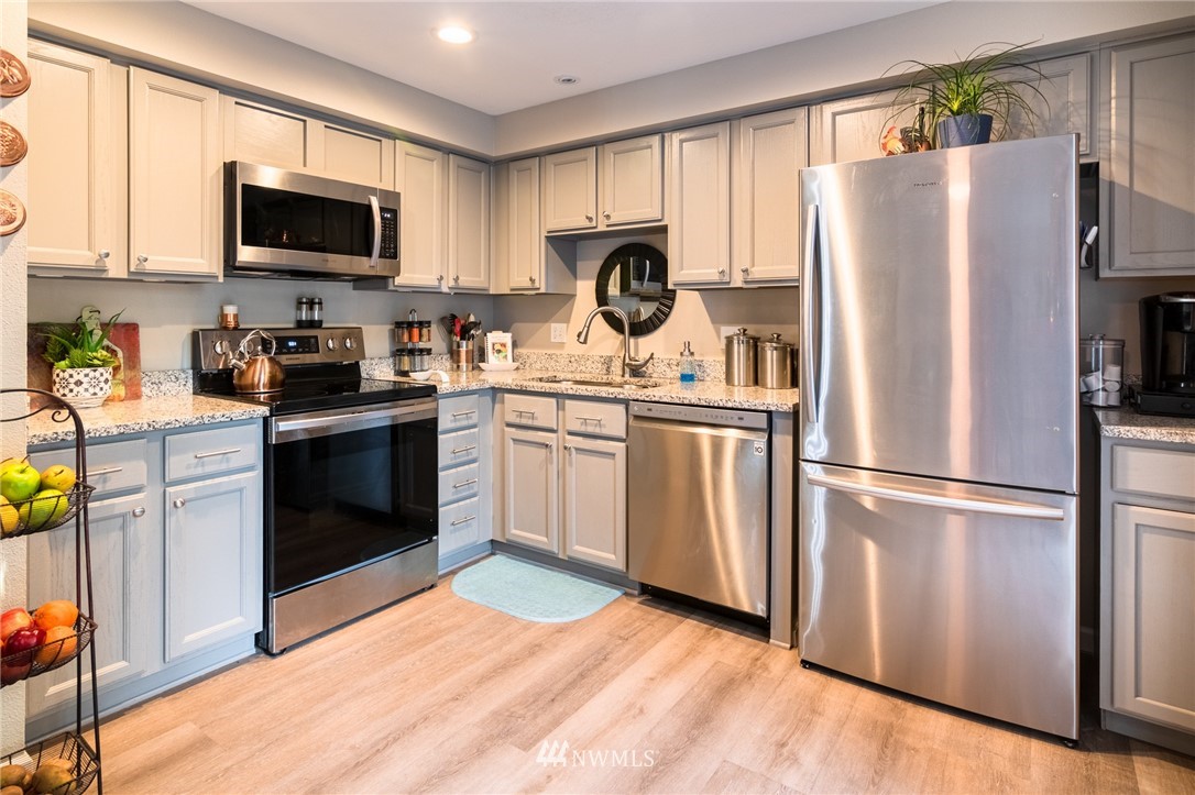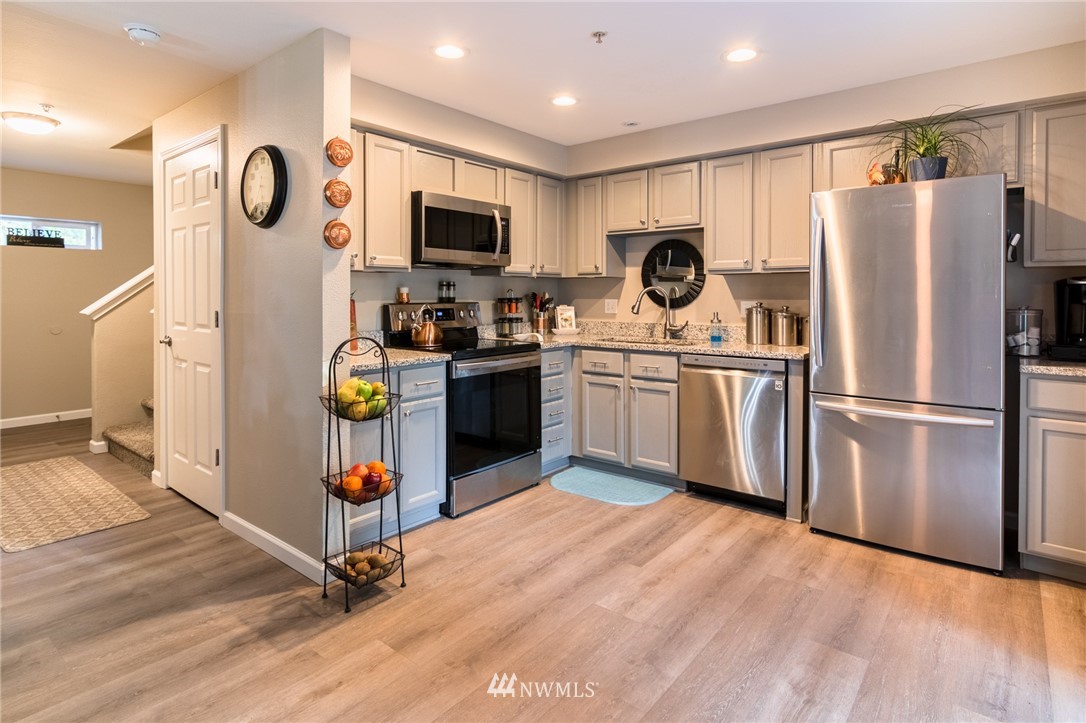 Beautifully remodeled 3 bed 2 1/2 bath condo in excellent location close to freeway, shopping( South Hill Mall), dining, Pierce College and more.. just minutes from everything and anything you need! Enjoy new vinyl plank flooring and new carpet throughout. Updated Kitchen and bathrooms complete with granite stone counters and Stainless steel appliances. All appliances do stay including washer and dryer! The layout is fantastic with Great Room and 1/2 bath on main and all three bedrooms including a good size master with private ensuite on upper level. This turn-key delight is ready for you to just move in and enjoy.