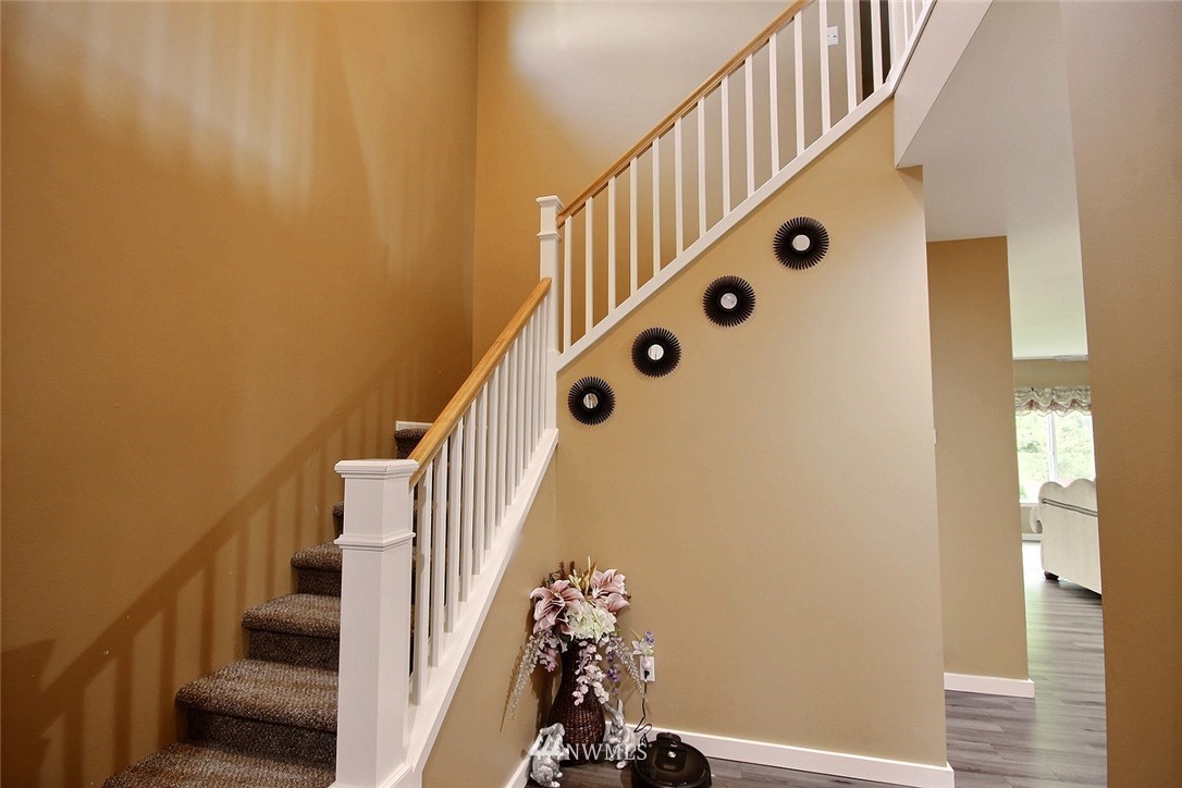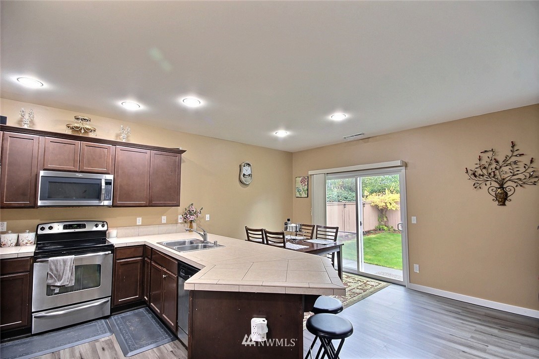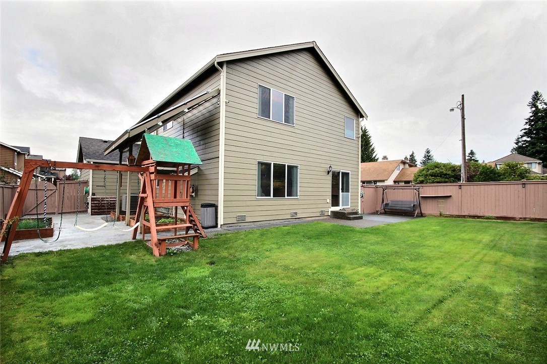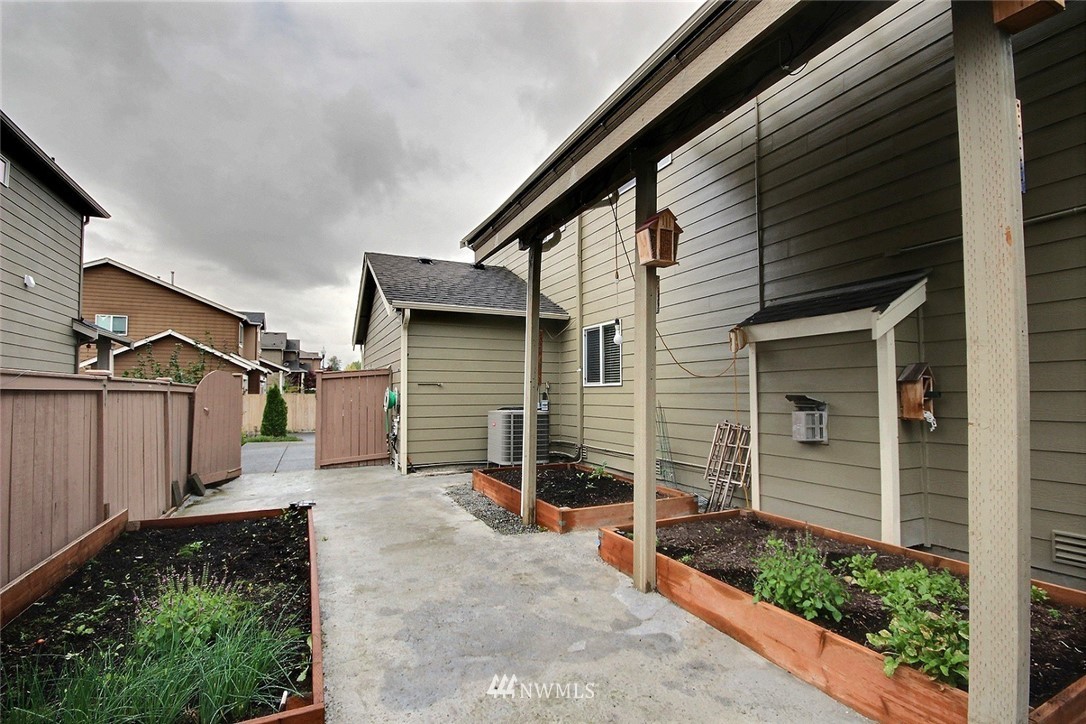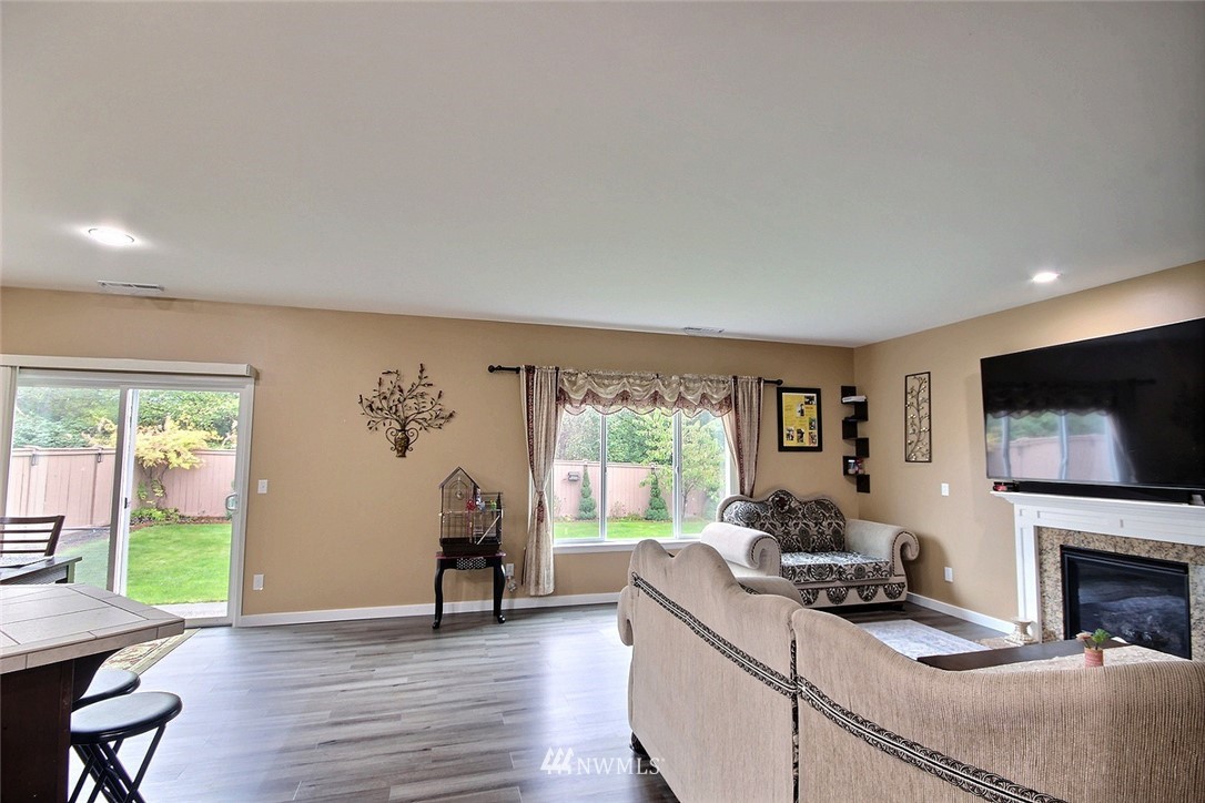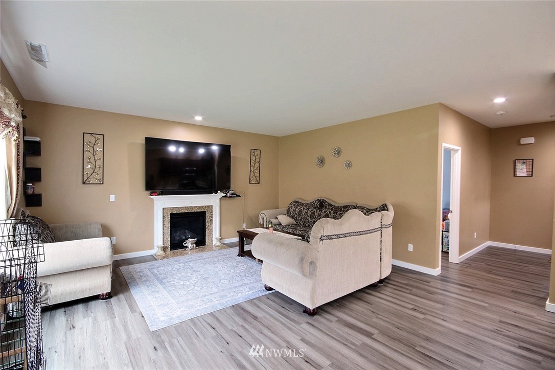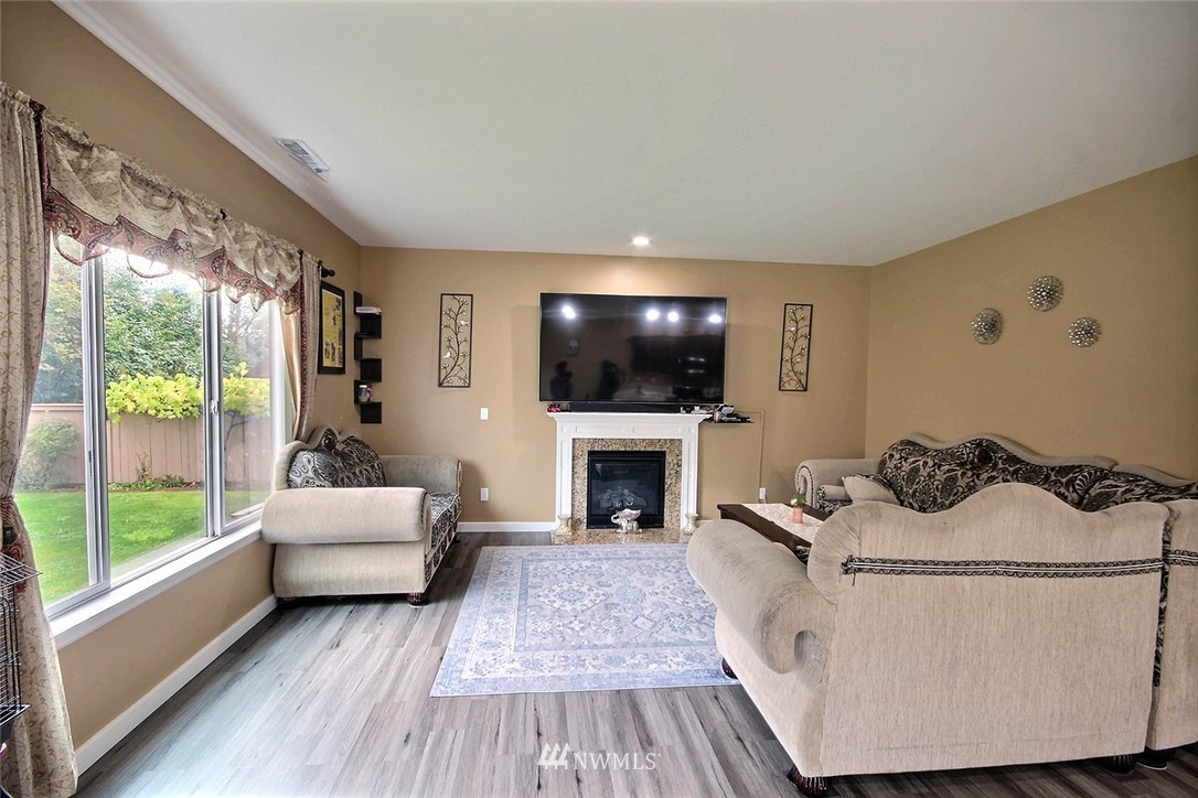 Crafted by DR Horton and designed for today's living! Ever-popular open concept floor plan features extensive wood-style flooring thruout, new paint in 2019, classy frplc with granite tile surround, white millwork, heat pump/AC, solar 2KW, fashionable finishes, all vent fans on timers (attic fan has WI-FI app), second kitchen in garage and more. Island kitchen offers plentiful cbntry, all applcs stay (incld W&D). Spindled staircase up to primary suite with five-pc bath, sizable bdrms, full main bath; bonus rm, half bath on main. Extended patio, raised veggie beds (durable treated wood), fenced backyard. Three car garage, extra driveway prkg. Cul-de-sac homesite convenient to popular amenities, main commutes, Sounder Train, schools, parks.