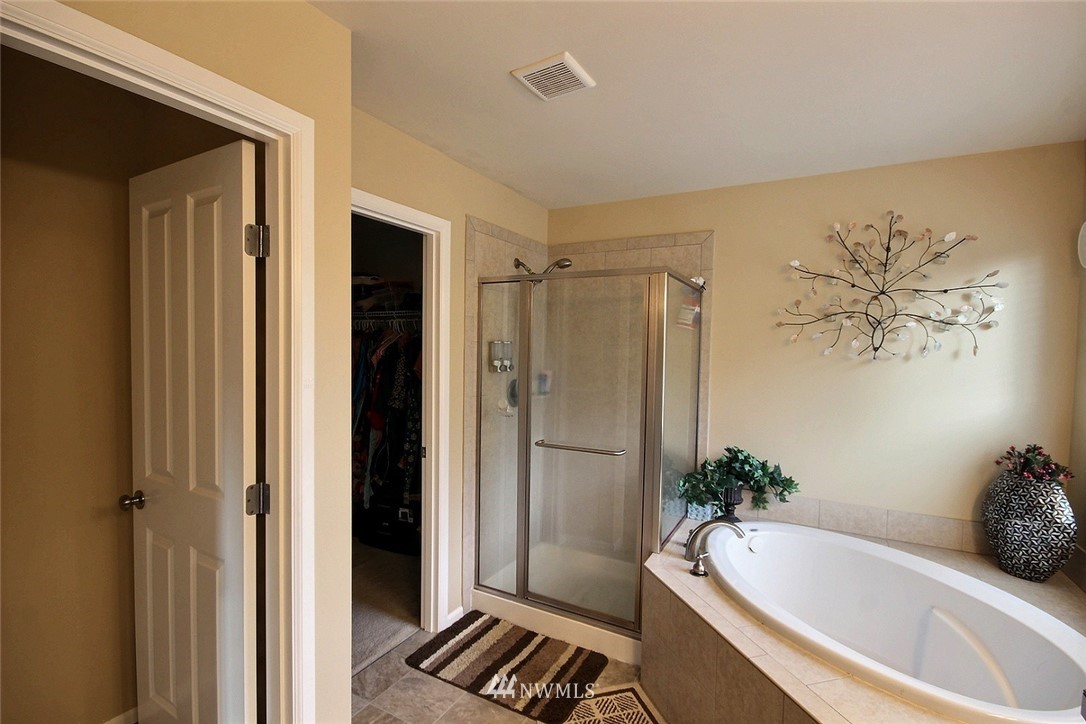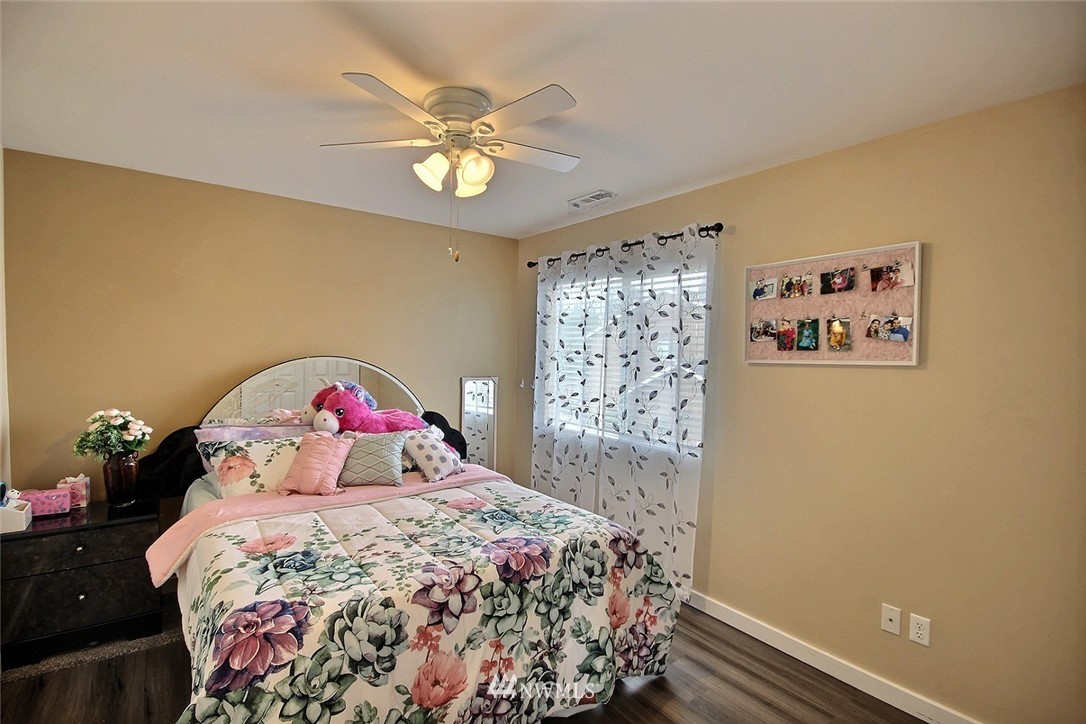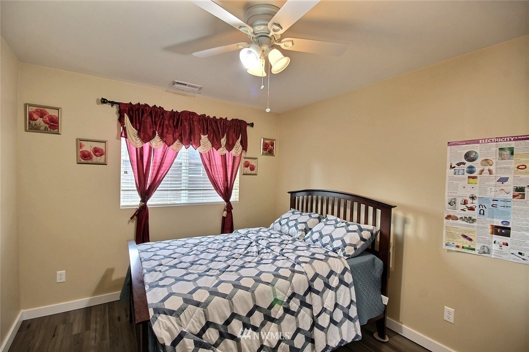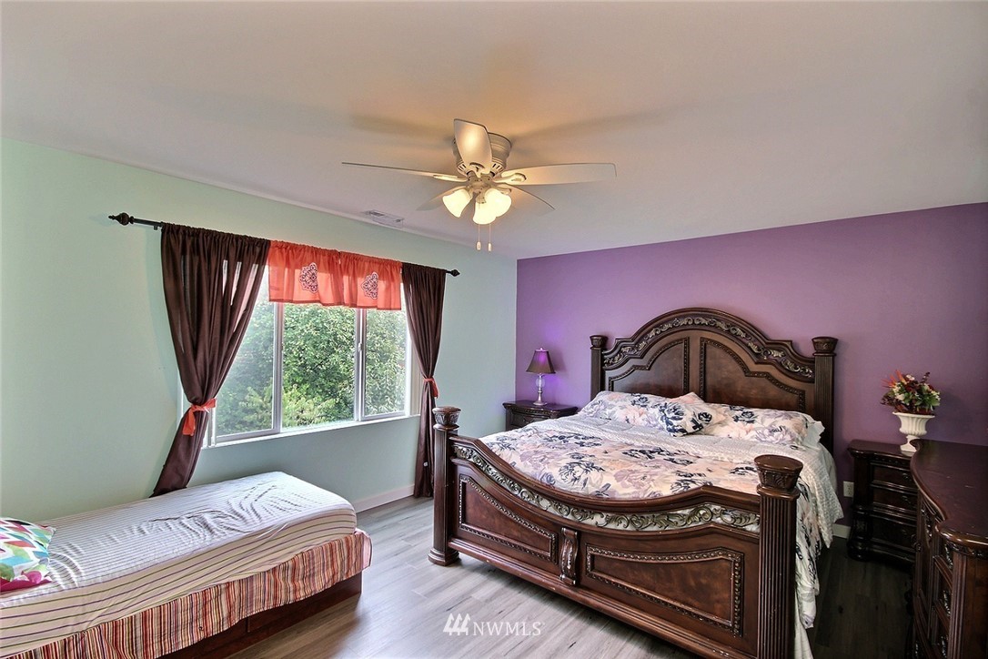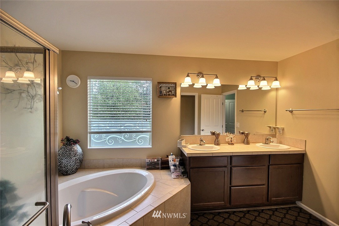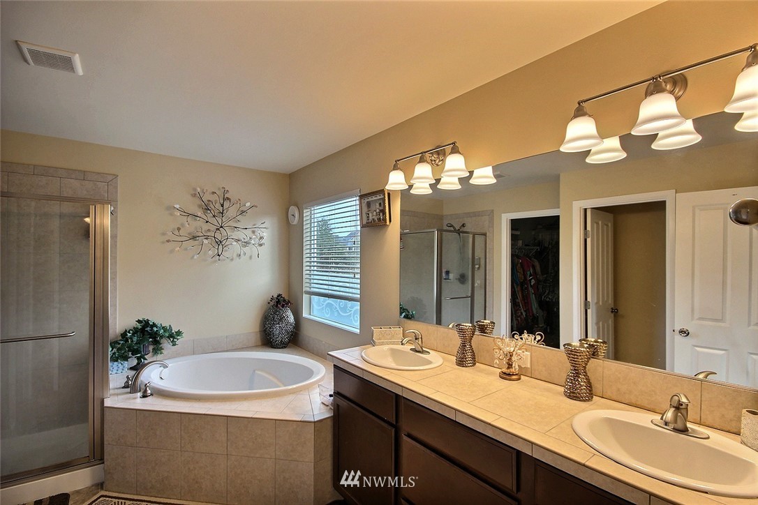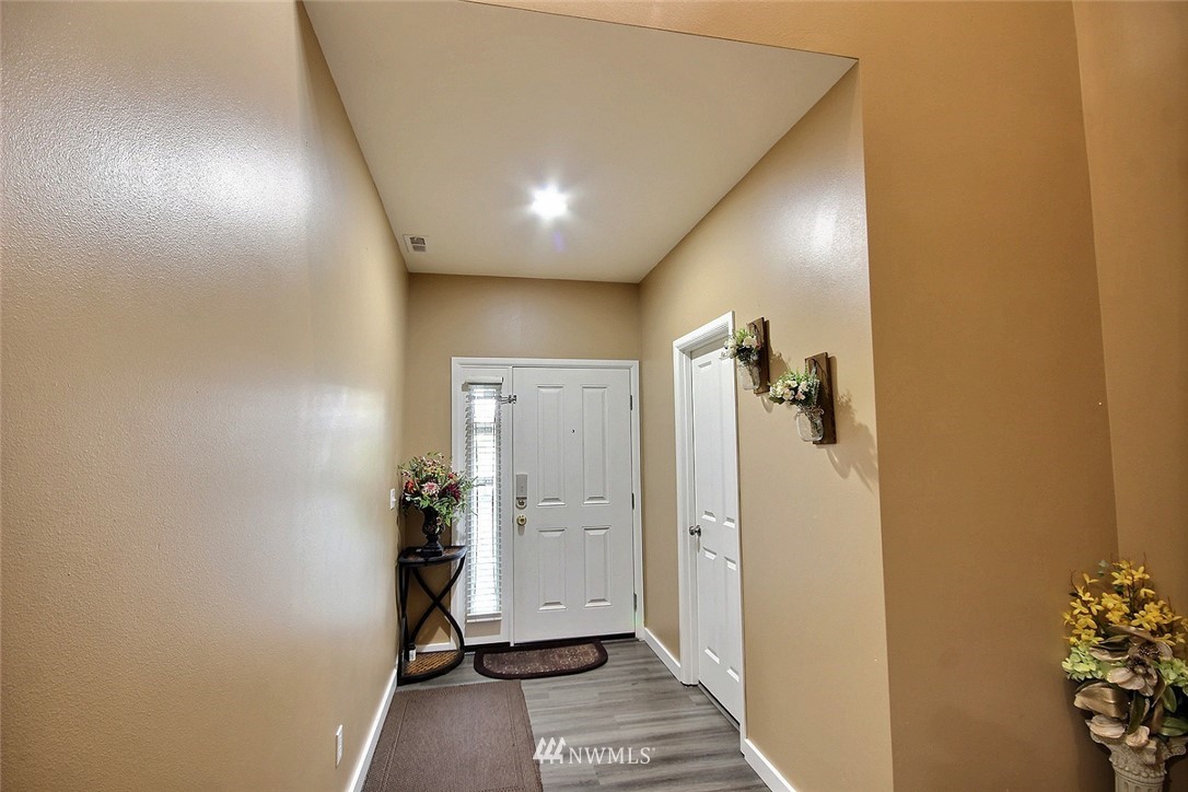 Crafted by DR Horton and designed for today's living! Ever-popular open concept floor plan features extensive wood-style flooring thruout, new paint in 2019, classy frplc with granite tile surround, white millwork, heat pump/AC, solar 2KW, fashionable finishes, all vent fans on timers (attic fan has WI-FI app), second kitchen in garage and more. Island kitchen offers plentiful cbntry, all applcs stay (incld W&D). Spindled staircase up to primary suite with five-pc bath, sizable bdrms, full main bath; bonus rm, half bath on main. Extended patio, raised veggie beds (durable treated wood), fenced backyard. Three car garage, extra driveway prkg. Cul-de-sac homesite convenient to popular amenities, main commutes, Sounder Train, schools, parks.