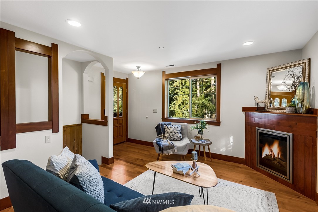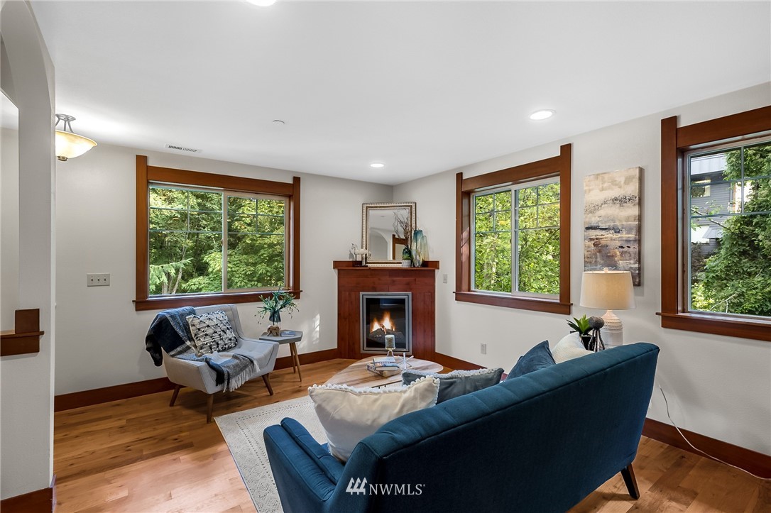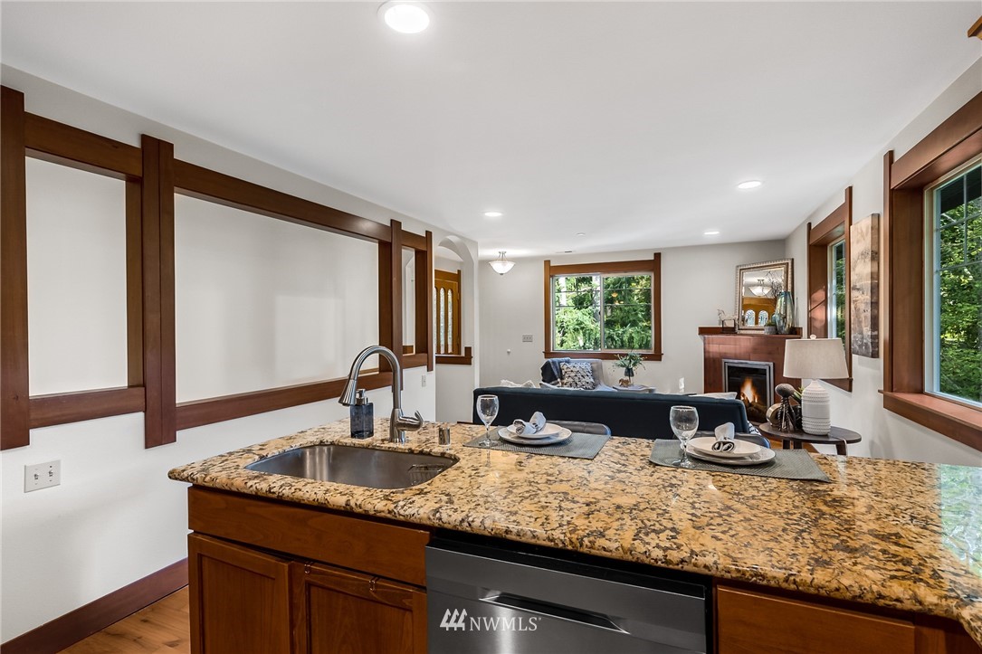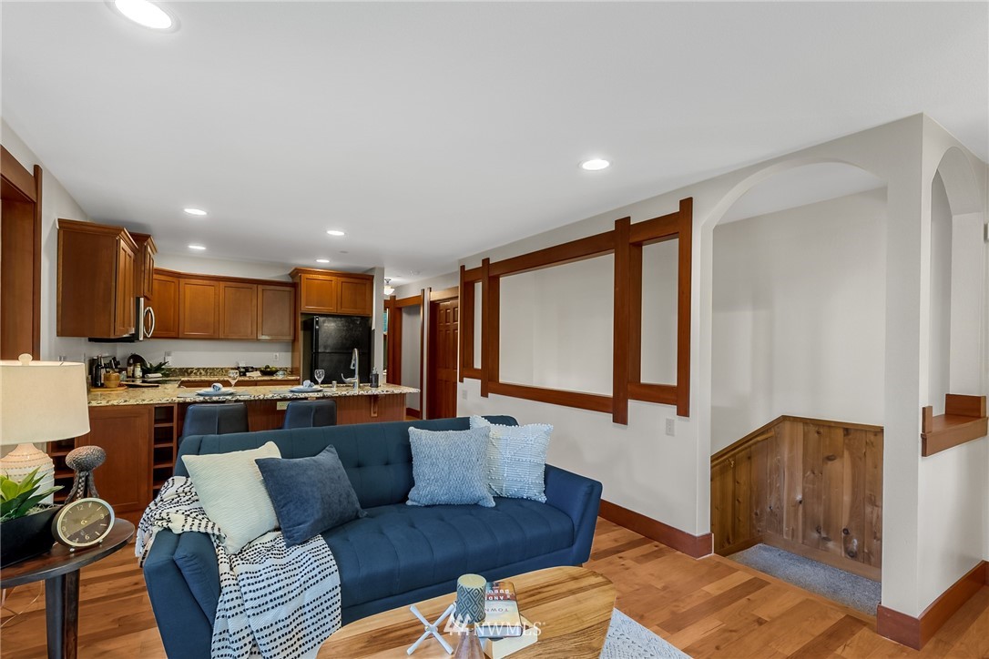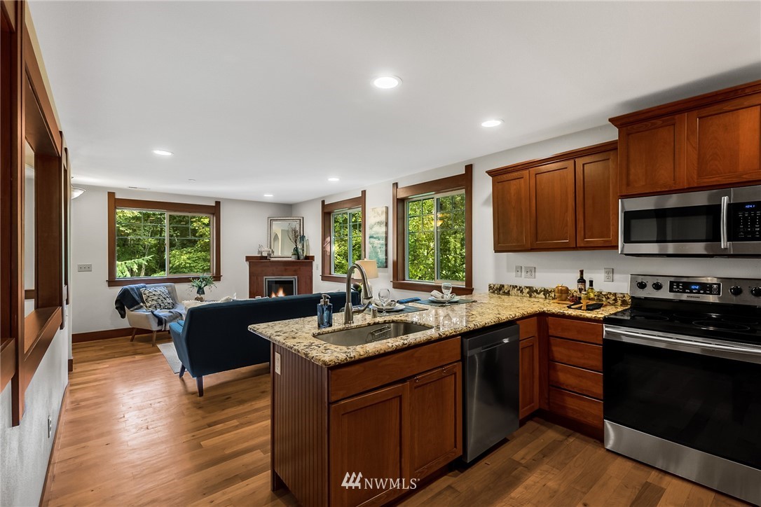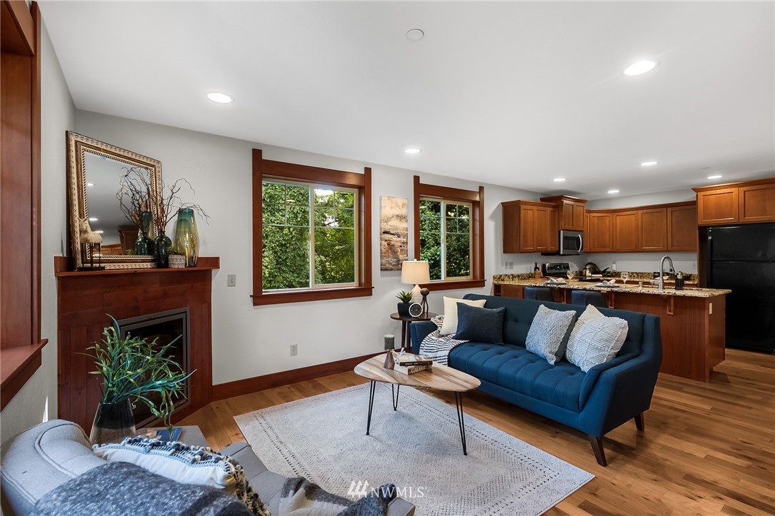Welcome to this well cared for Condo in Tacoma's Three Bridges District! Northwest Style with extensive use of wood inside & out. Step onto hardwood floors on the main level, real wood window casing, trim & doors throughout. Open kitchen with granite counters, under mount sink & stainless appliances overlooks living room with electric fireplace. Plenty of rooms here for bedrooms or office space as desired. End unit with many windows for natural light, this is the largest unit in the building. Great location in the North End, while feeling private with the territorial view tucked in the woods. Walkability with 1 mile radius to Proctor, Stadium, Old Town, UPS neighborhoods. Low HOA dues & near Lowell Elementary.