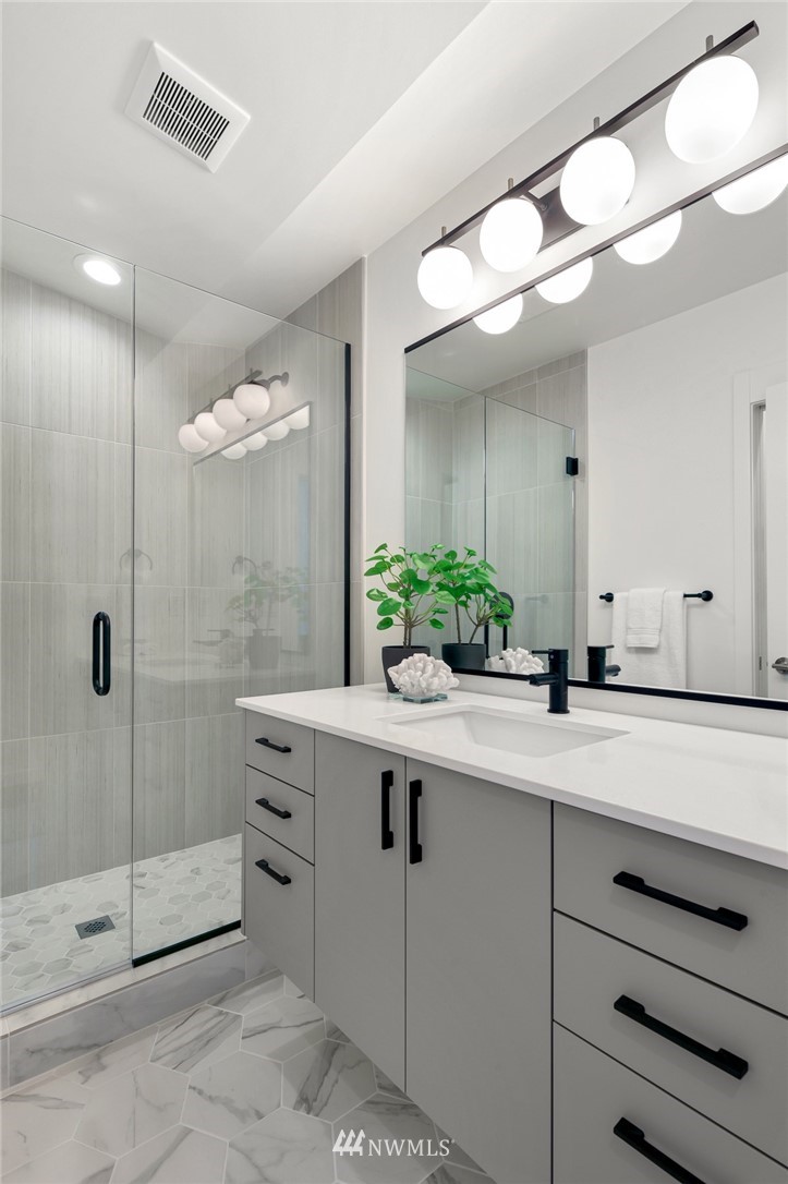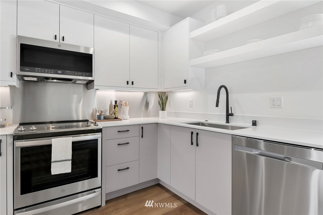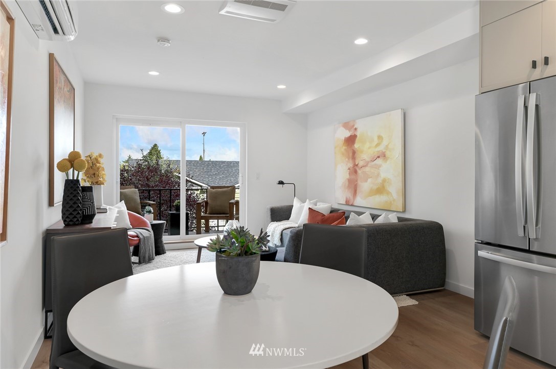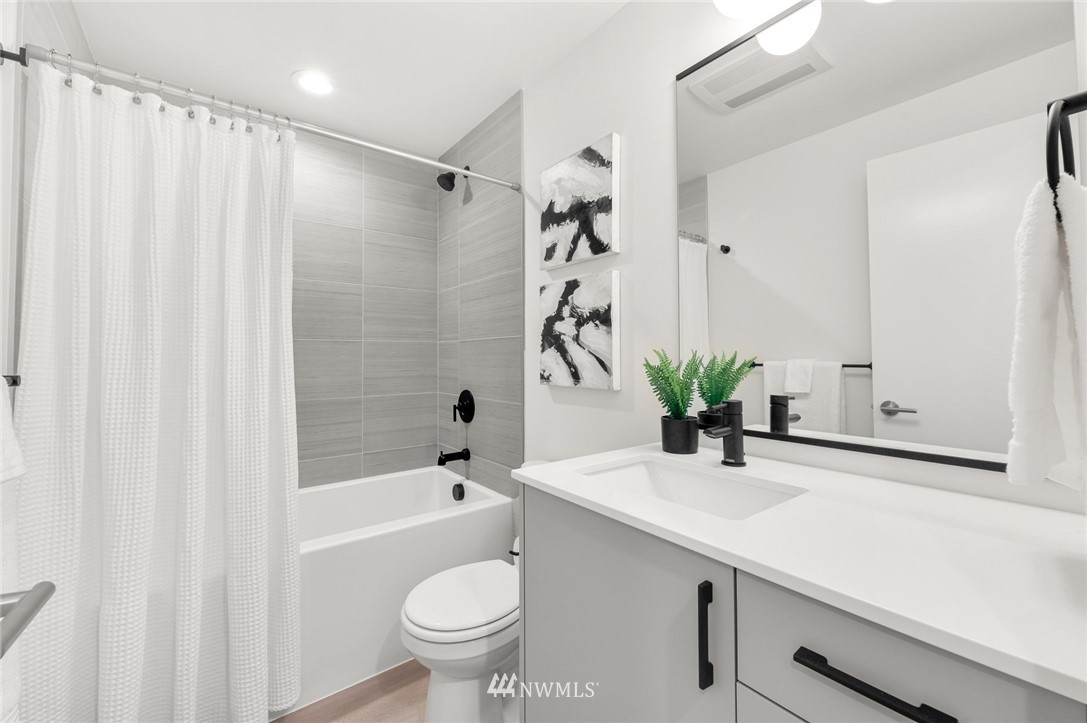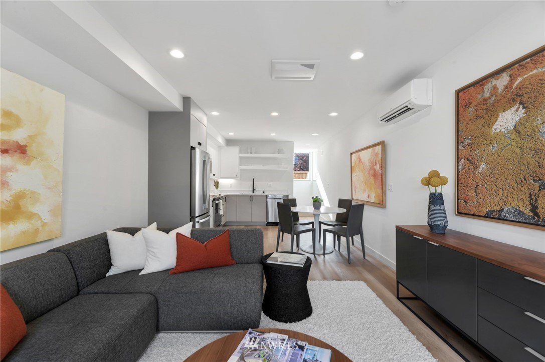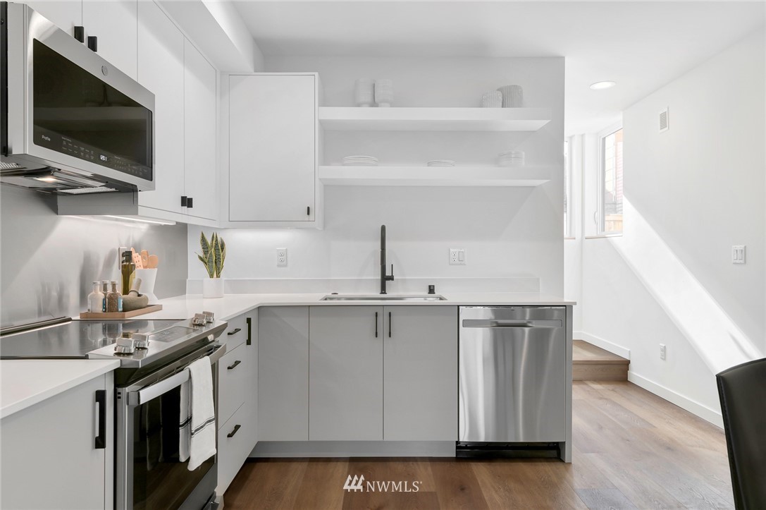A short week from completion - here’s the sneak preview. Perfect for the owner looking to offset a mortgage, use for multigenerational living, or have a true home office/business experience...you’ve got options. The first floor is designed w/ separate entrance and kitchenette for use as a MIL unit - just lock a deadbolt between the 1st and 2nd floor to create a separate dwelling/working space. Or, leave it open and enjoy the entire two bed two bath townhouse. Wide planked engineered hardwoods w/ Oak finish. Glass-doored showers, tiled baths, quartz counters. Stainless kitchen appliances. Larger units have decks off living. TWO blocks from the Light Rail, which now goes all the way up to Northgate- soon Bellevue, Redmond, and Lynnwood.