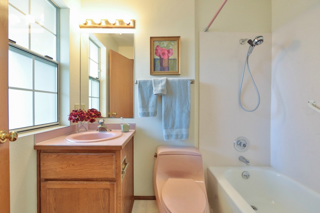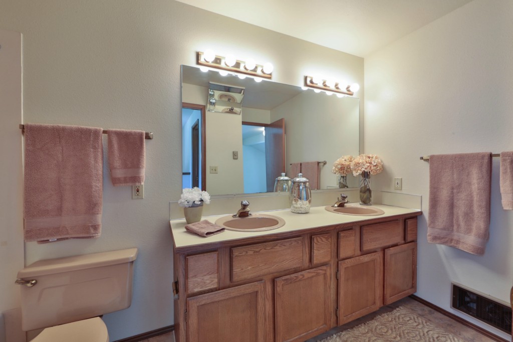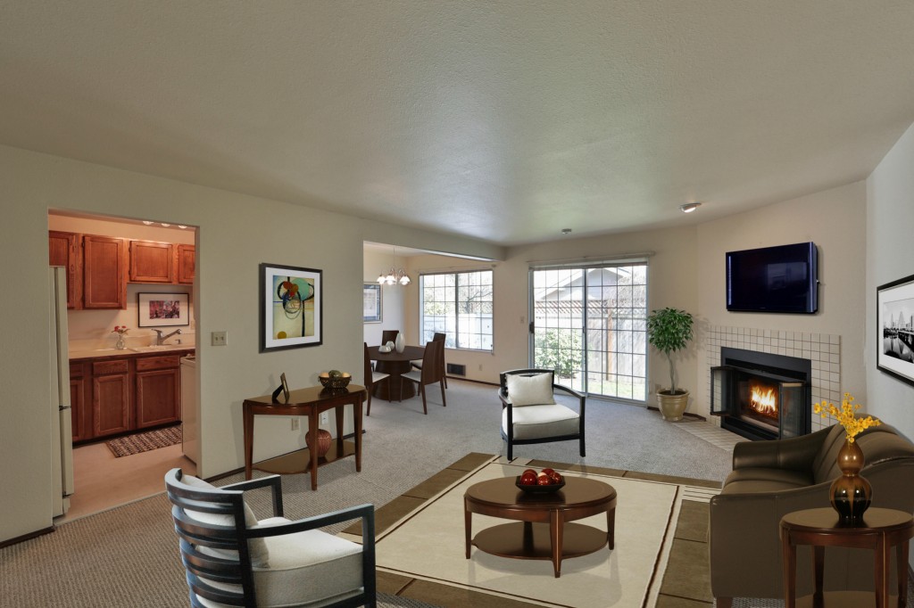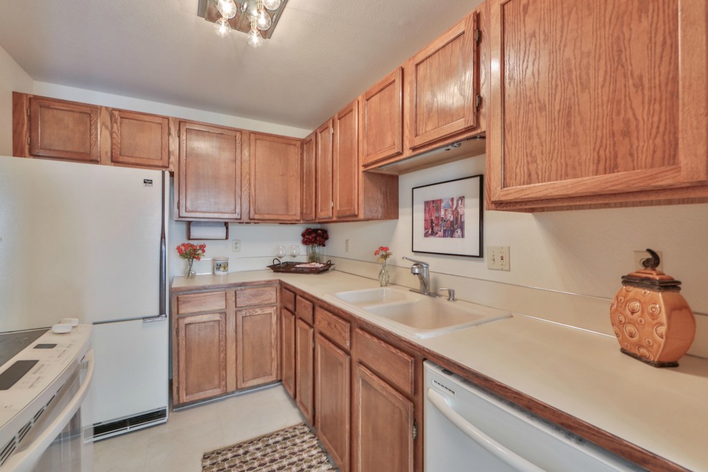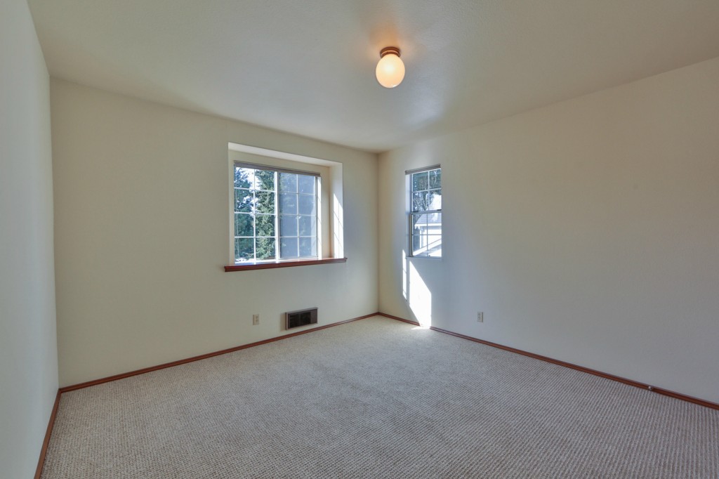 This spacious town home has a great floor plan. The main floor has a full bath & bedroom, living room with fireplace, dining area with access to patio & fenced yard, utility room with full sized W/D and kitchen with newer laminate flooring. Upstairs find 2 more generous bedrooms, a big walk in closet, and a large bath with dual vanity. You have your own garage with an additional open parking space. Close to bus lines, schools, freeway, shops & dining. Quiet & Private...so much for so little!
