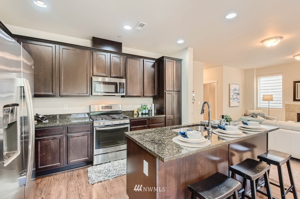 Just like new, this 2018 built home has it all! Over 2700sqft of spaciousness featuring 4 bedrooms and 3.5 bathrooms spread out over 3 floors with a sizable living area on each floor. Open floor plan kitchen area features granite counters, stainless steel appliances, high quality cabinets, and access to balcony. Newly landscaped backyard with 25-Year patio warranty and pet-resistant turf that requires almost zero maintenance. Looking for privacy? Backyard is adjacent to green belt area and playground plus the entire community is gated. Fantastic location for commuters being so close to arterials, freeways, park & rides, plus public transit. Add your own flavor to this vibrant community!