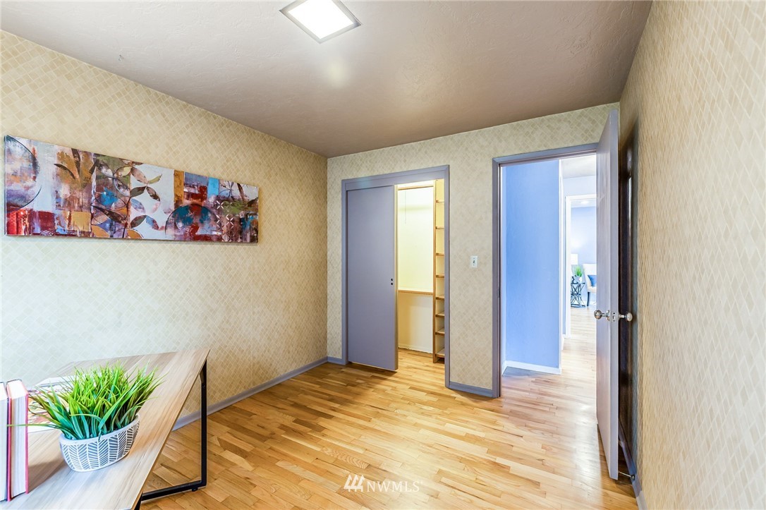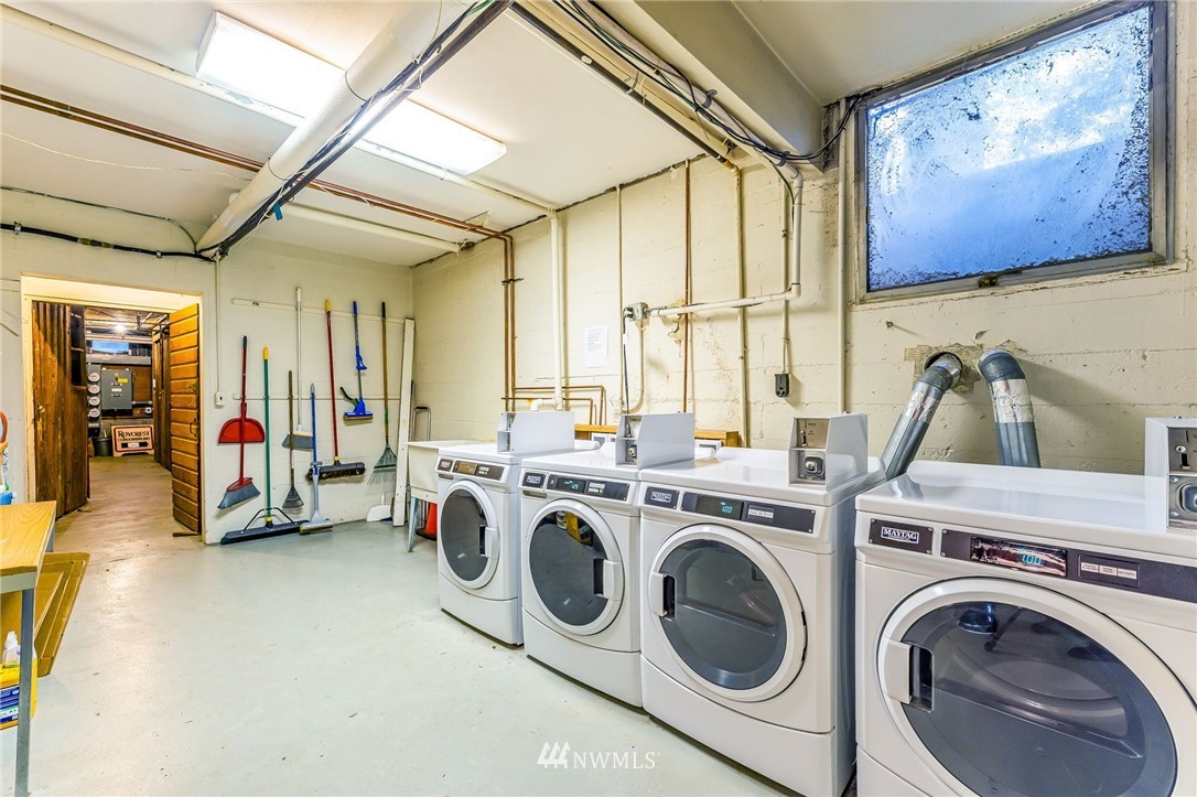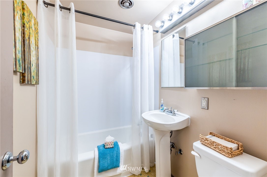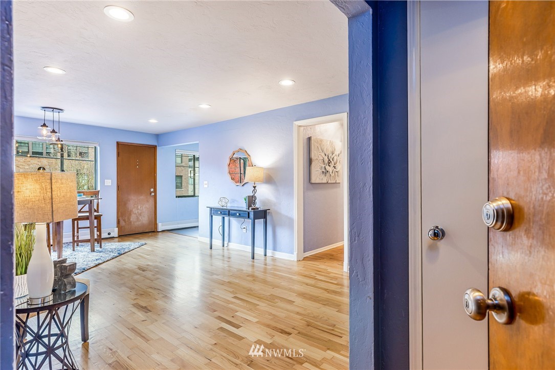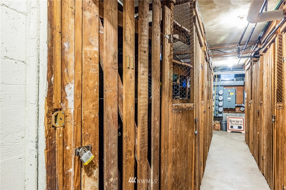 Classic Mid-Century Details in RoyCrest Condos! Lovely Corner Unit w/Oversized Windows & Tons of Natural Light. Patio Space, Views of Space Needle + Private Oversized Garage. Central Courtyard with Lush Landscaping & Towering Evergreen Trees. Small Quaint Building & Tight-Knit Community. Laundry Room, Secure Storage Space & Close to Everything with WalkScore of 90! Generous Sized Bedrooms w/Closet Lights & Organizers, Good Storage Thru-out, Original Hardwood Floors & Updated Lighting. Kitchen w/White Cabinets, Butcherblock Counters, Subway Tile Backsplash, Tile Floor & Stainless-Steel Appliances. Two Entrances to Unit for Cross Ventilation! Updated Exterior w/Fresh Paint & Proactive HOA. No Rental Cap & Very Pet Friendly.