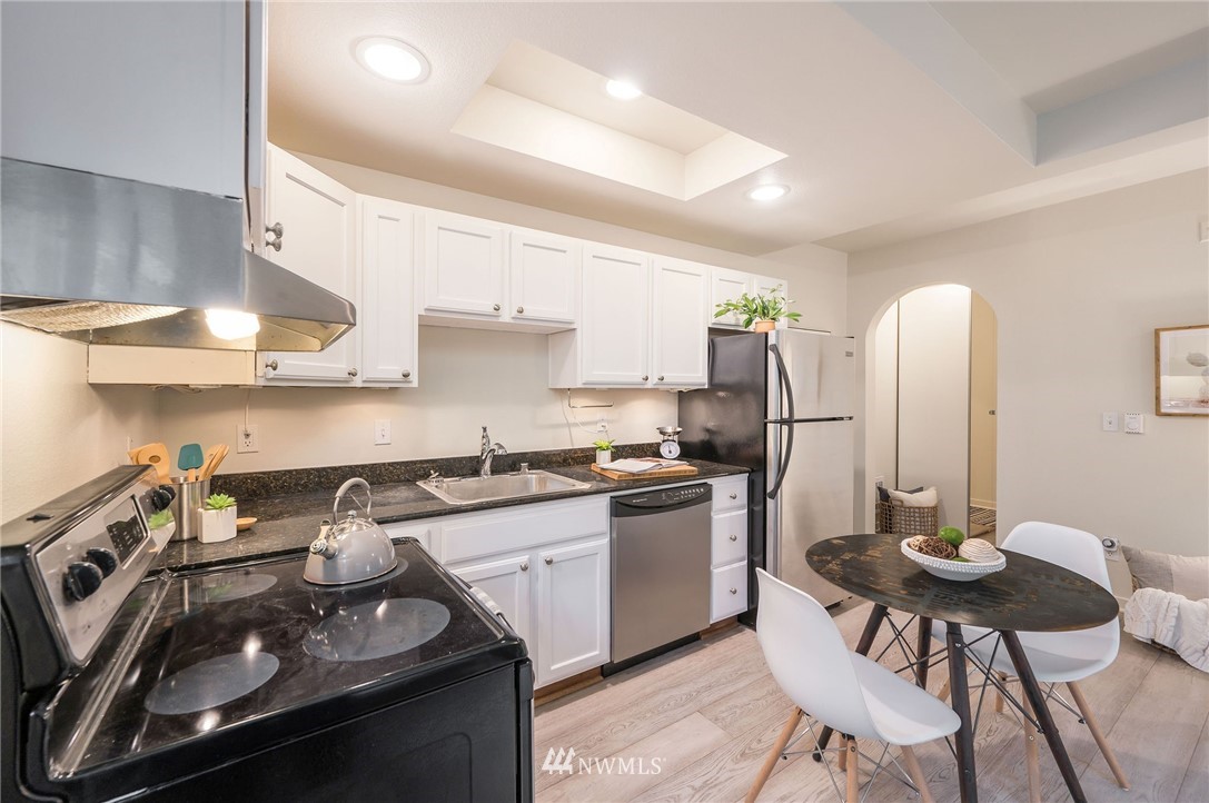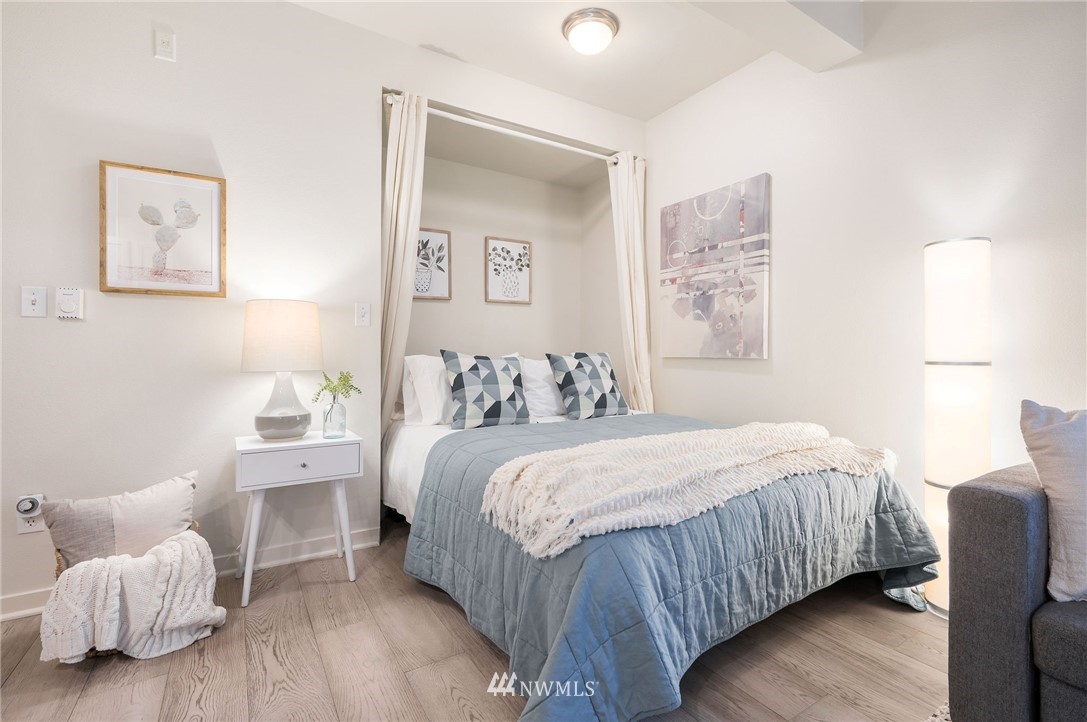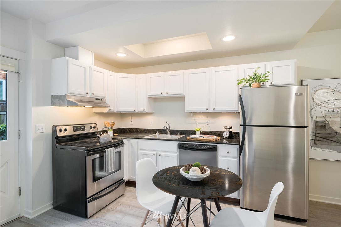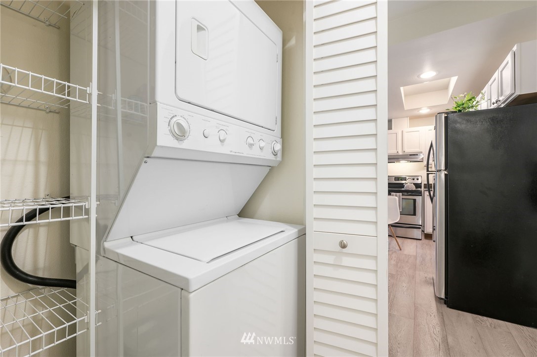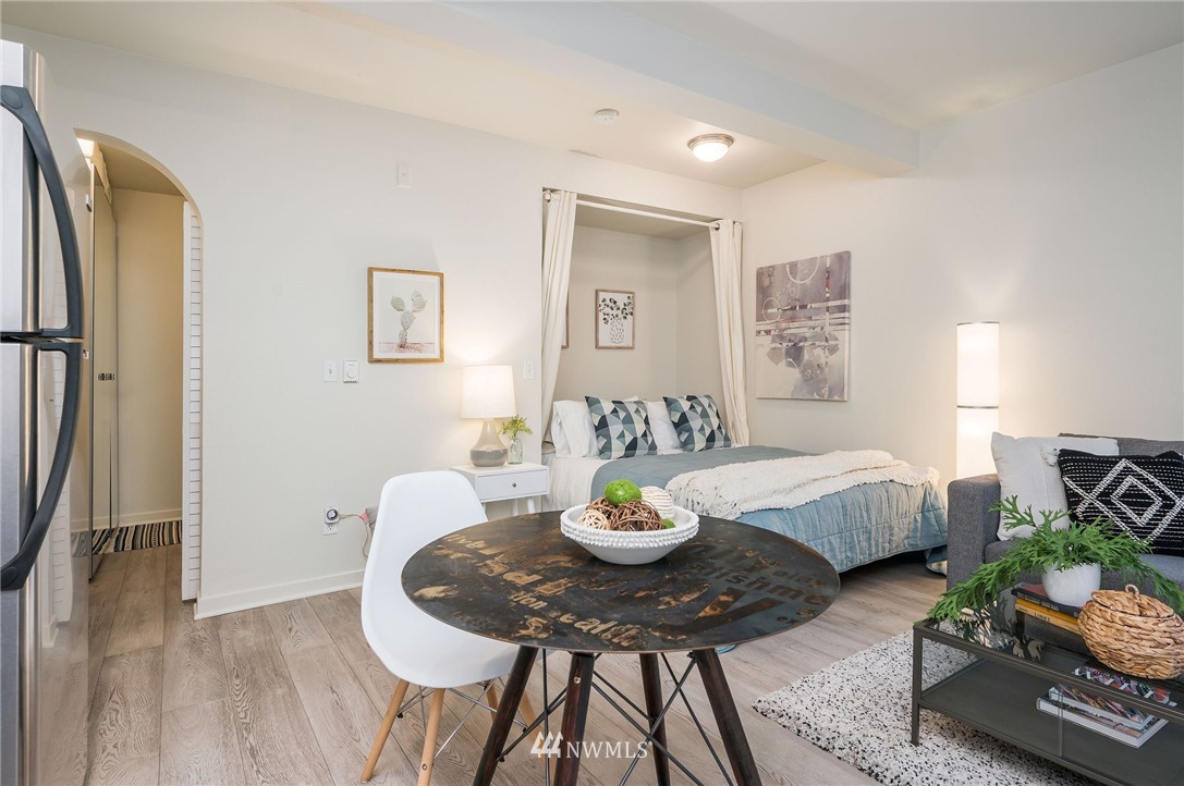 This sweet gem offers the opportunity to have your very own Seattle pied-Ã -terre. Charming ground floor unit with it's own separate entrance and private yard. Everything you need, including a built in murphy bed, washer and dryer in unit, full kitchen with newer counters and flooring and fresh interior paint. Private yard is fully fenced and perfect for a furry friend or outdoor enjoyment. No stairs required and a dedicated parking space in covered garage for easy unit access. FHA approved building is well-managed and dues include water/sewer/garbage. Enjoy in-city amenities, easy commuter access, and the new nearby light rail station.