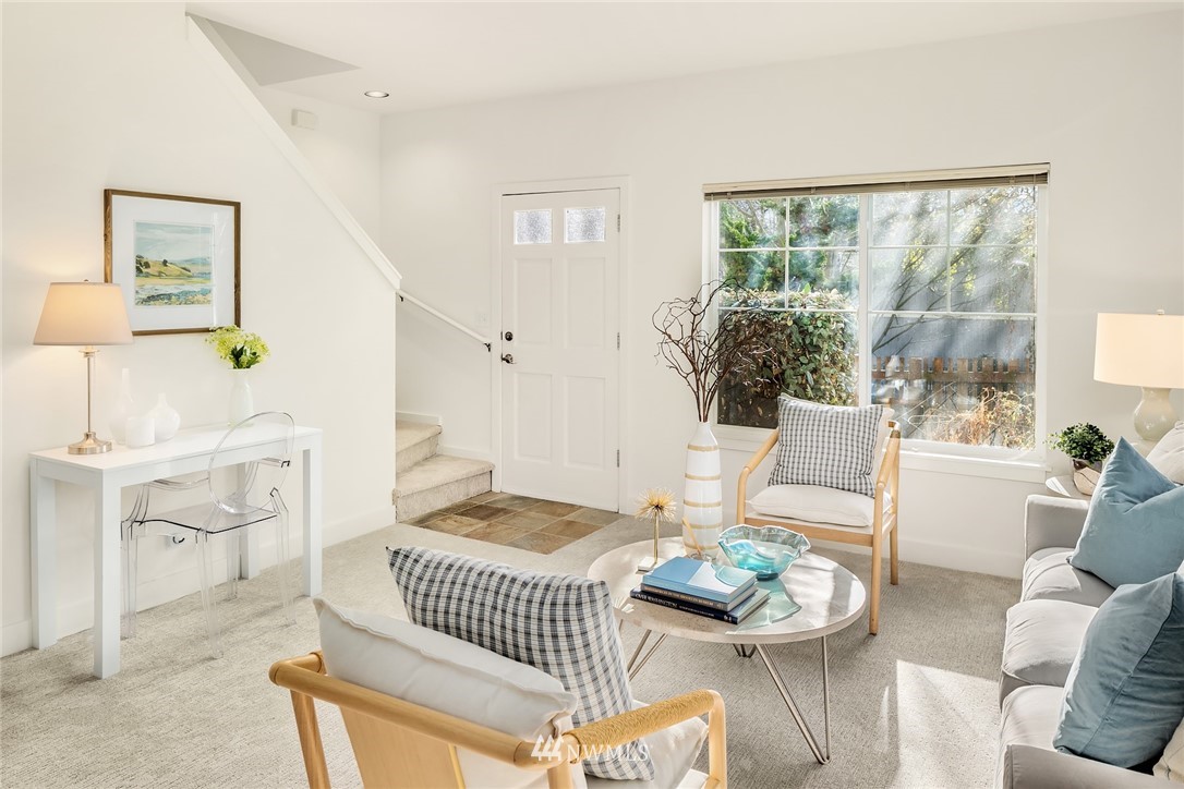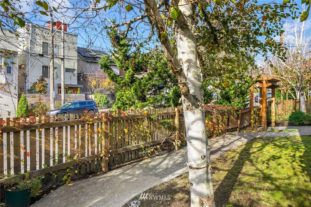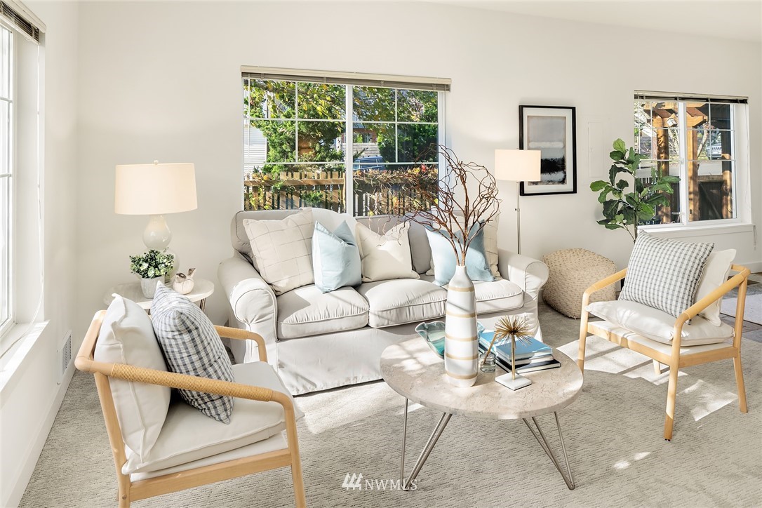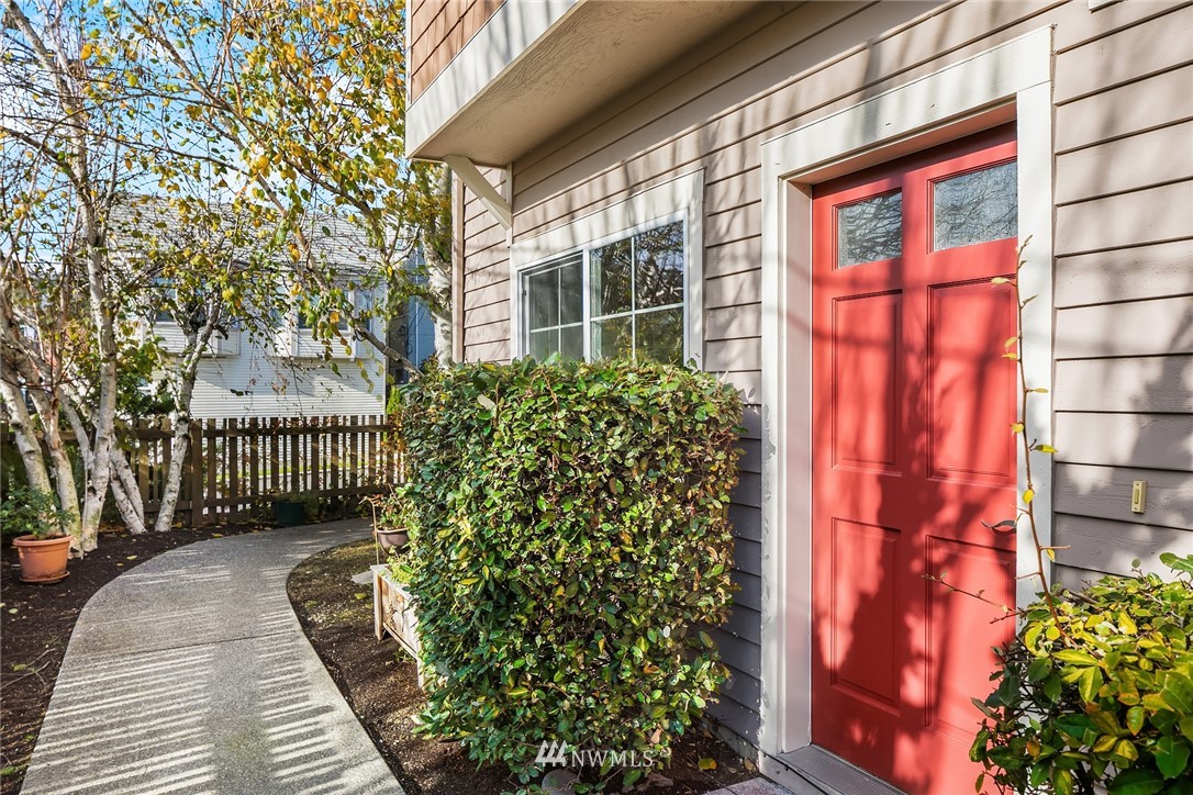 Spacious & sunny townhouse style condo in perfect location! Friendly 5 unit complex surrounds lovely fenced landscaped courtyard. Corner end unit enjoys tons of light, privacy + beautiful outlook to yard & trees. Front entry to lg living room, opens to tiled dining area & open kitchen w/back entry + powder room on main. Freshly painted & carpeted throughout. Upstairs has 2 spacious BRs w/vaulted ceilings + full BA with tons of cabinetry, laundry. Off street assigned parking space + zone permit. Strong self-managed HOA & high quality building. Pets ok w/conditions. Seller inspection avail. Great transit options, nearby amenities incl popular restaurants, Amazon Fresh, PCC, Trader Joes, parks, tennis, recreation- the best in Seattle living!