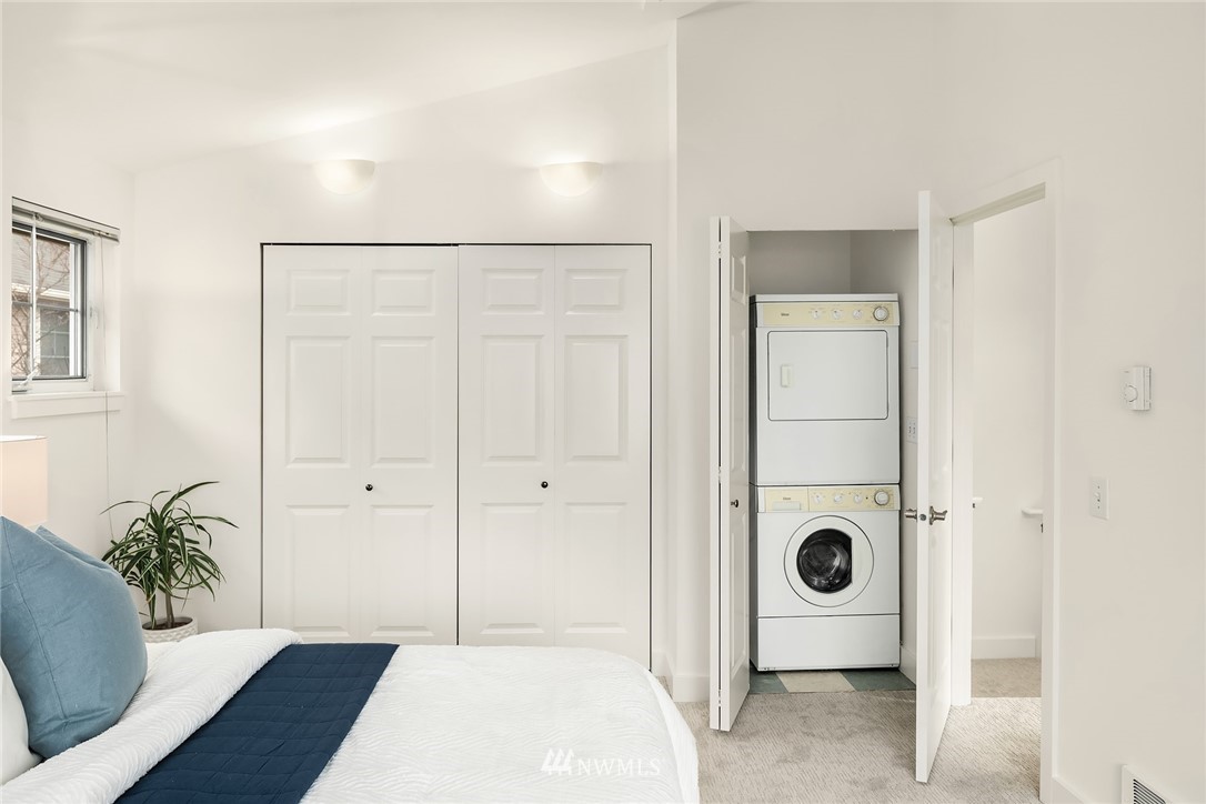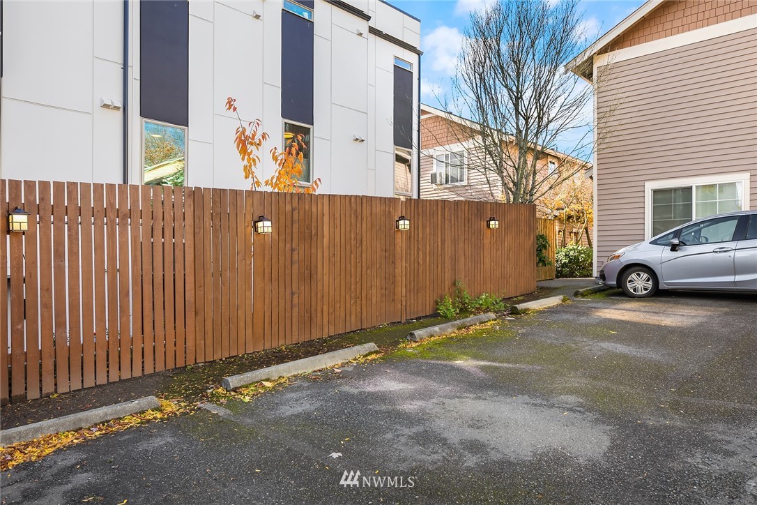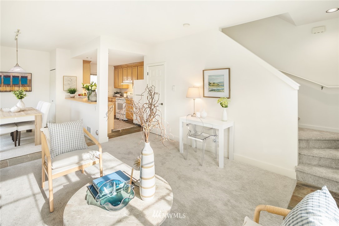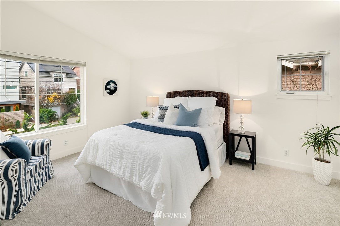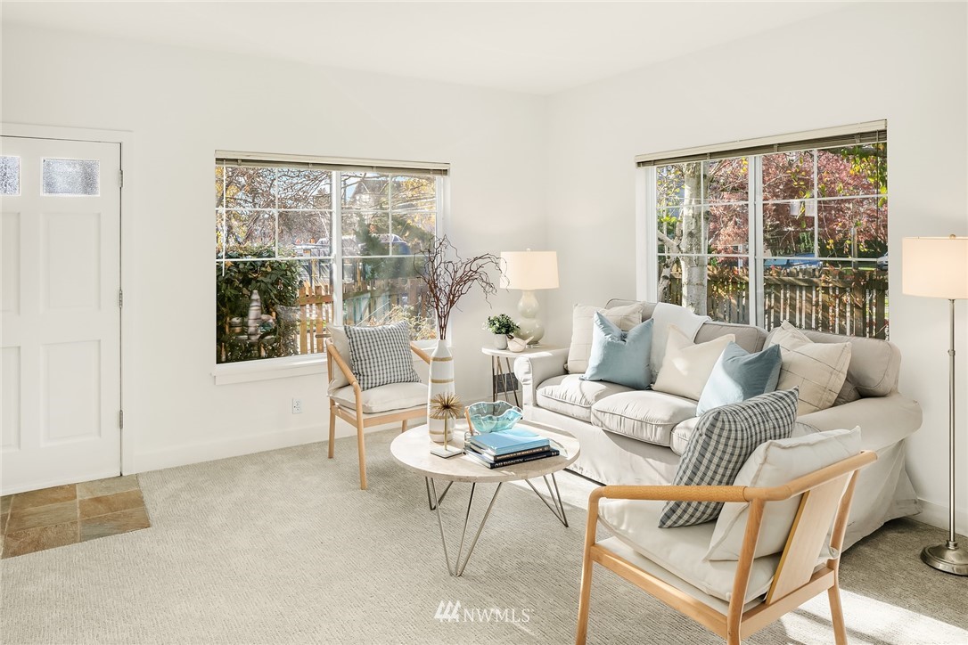 Spacious & sunny townhouse style condo in perfect location! Friendly 5 unit complex surrounds lovely fenced landscaped courtyard. Corner end unit enjoys tons of light, privacy + beautiful outlook to yard & trees. Front entry to lg living room, opens to tiled dining area & open kitchen w/back entry + powder room on main. Freshly painted & carpeted throughout. Upstairs has 2 spacious BRs w/vaulted ceilings + full BA with tons of cabinetry, laundry. Off street assigned parking space + zone permit. Strong self-managed HOA & high quality building. Pets ok w/conditions. Seller inspection avail. Great transit options, nearby amenities incl popular restaurants, Amazon Fresh, PCC, Trader Joes, parks, tennis, recreation- the best in Seattle living!