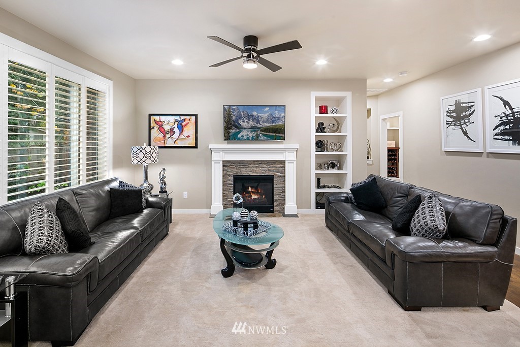 This one is a CREAM PUFF! Just in time for the holidays- Comfort & modern elegance in this immaculate setting for relaxing & entertaining. Host in style in the elegant formal dining & living rooms. Chef’s kitchen with Thermador stove, granite counters, unique center island, large pantry, wide plank hardwoods & luxury carpets, The Family room boasts gas fireplace & built-ins. Guest bed & ¾ bath on main. Dramatic staircase to private bedroom suite & extra finished rm. The primary bed is the ultimate retreat with a spa-like bath. Covered outdoor NW living space with an orb chandelier; stone patio, built-in firepit, & professionally landscaped. Shutter window treatments, AC, generator hook-up, designer front door, & large. 3-car tandem garage.