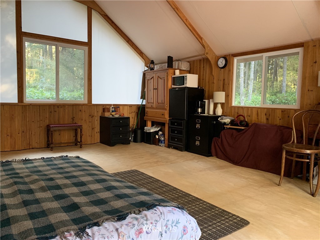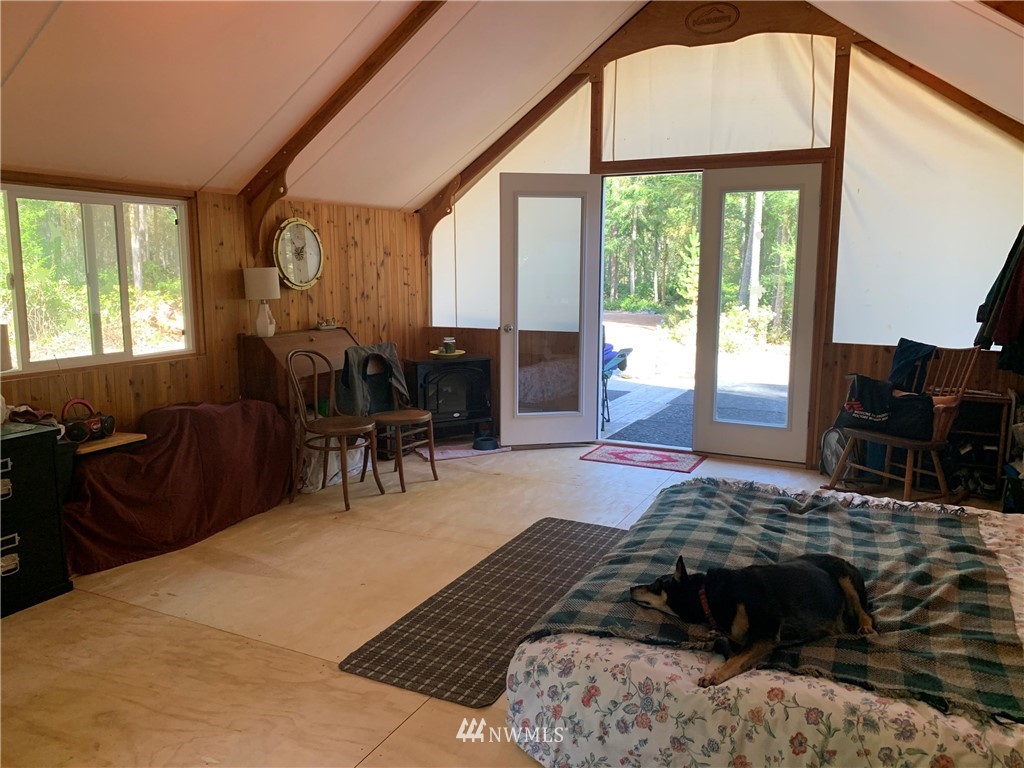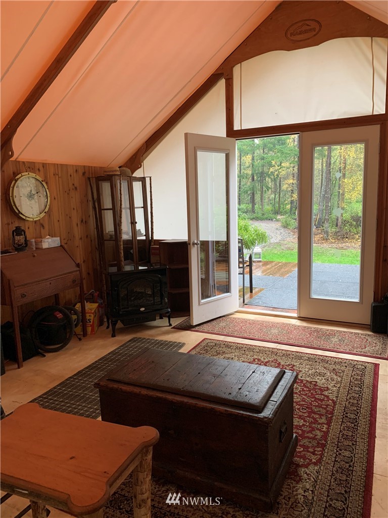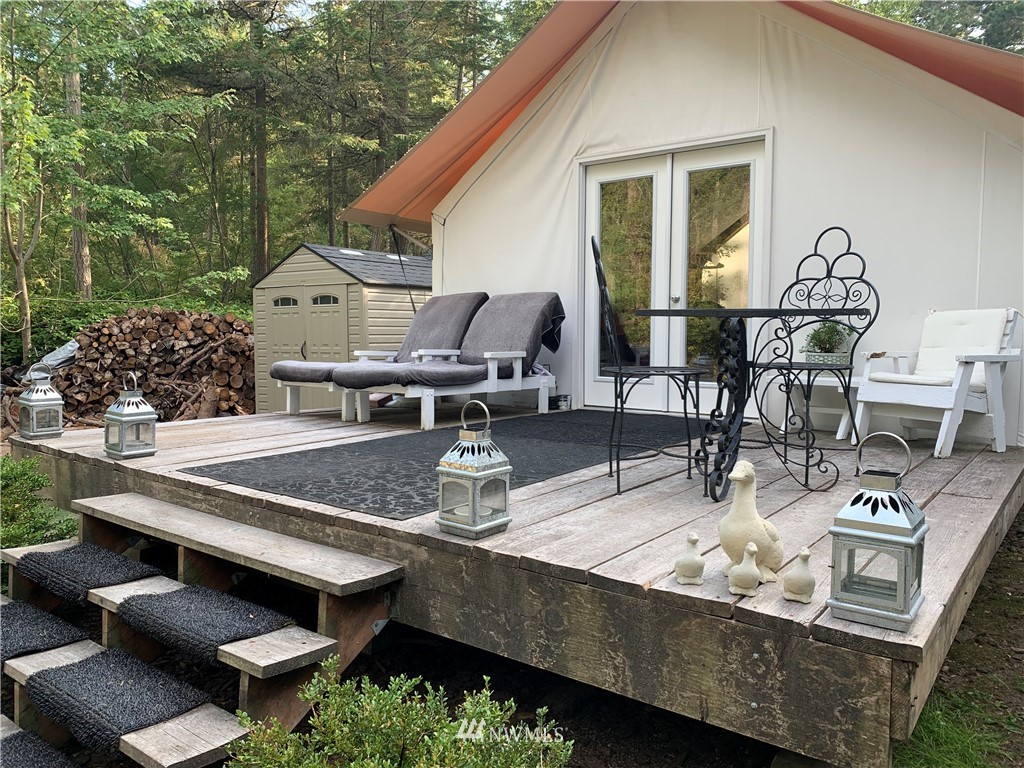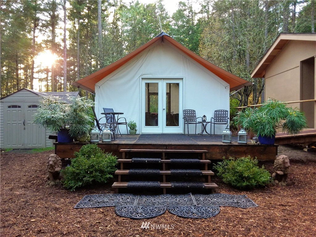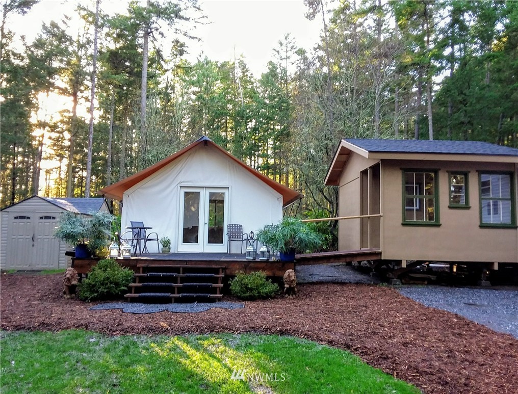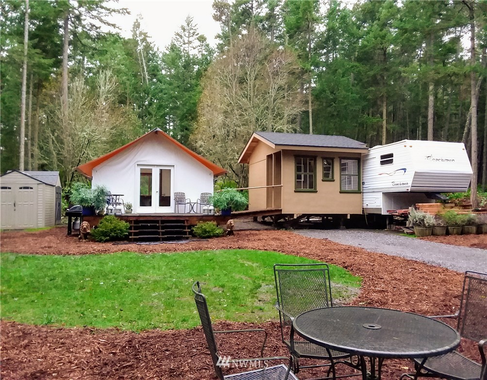 Rare opportunity to own acreage on Lopez Island. Just shy of ten acres, the gated entrance and rock-lined roads lead into a beautiful meadow and two building sites (one with an active building permit). Three bedroom septic installed and individual well (6 GPM) plus three sides of this private acreage is fully deer fenced with utilities brought into the property (400 AMP panel). The land includes a 2012 Rainier tent with cedar walls, French doors, and dual paned windows; internet; 26 ft. 2004 Coachmen 5th wheel with kitchen nook/couch slide out; adjacent covered deck. Approved garage/studio plans included. The current improvements allow for comfortable living or a vacation get-away.