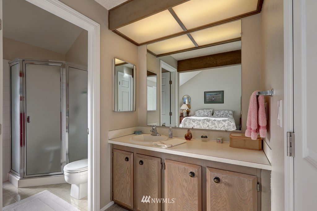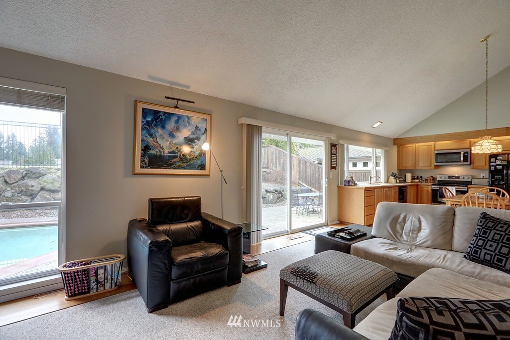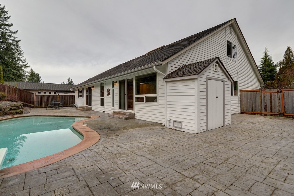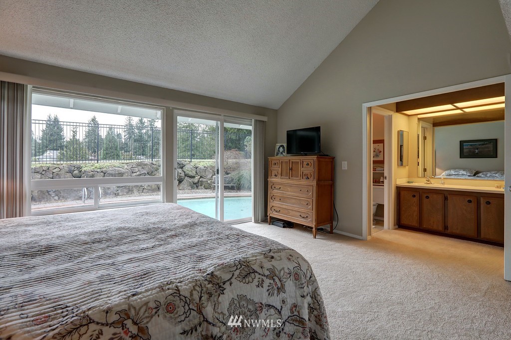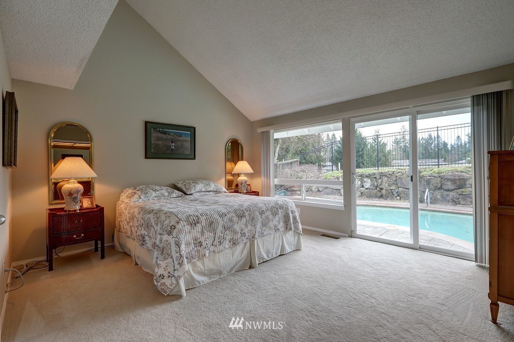 Nestled on the 6th fairway of the Fairwood Golf & Country Club, this exquisite home with soaring ceilings, walls of windows & a living room with a floor to ceiling brick fireplace. The formal dining room sits adjacent to the kitchen accented with beautiful wood cabinetry and lined with windows leading to the family room. Retreat to the main floor primary suite highlighted with vaulted ceilings and private access to the pool. Two more spacious bedrooms complete the main floor. Upstairs are two bedrooms. The one large bedroom with private deck could be a bonus room or home office. Outdoors relax on the expansive patio and cool off in the private pool. Close to all that the Pacific Northwest West has to offer!