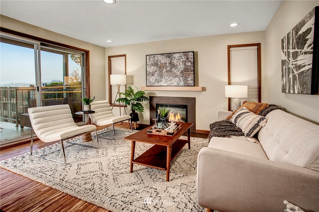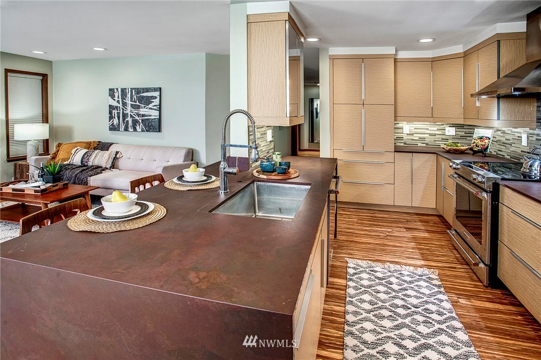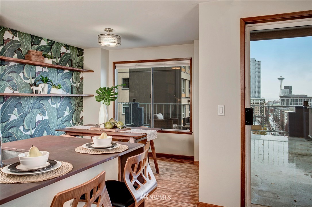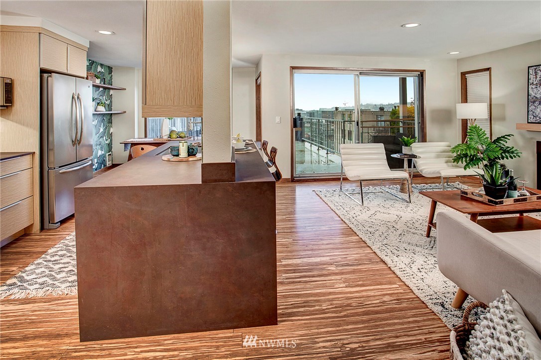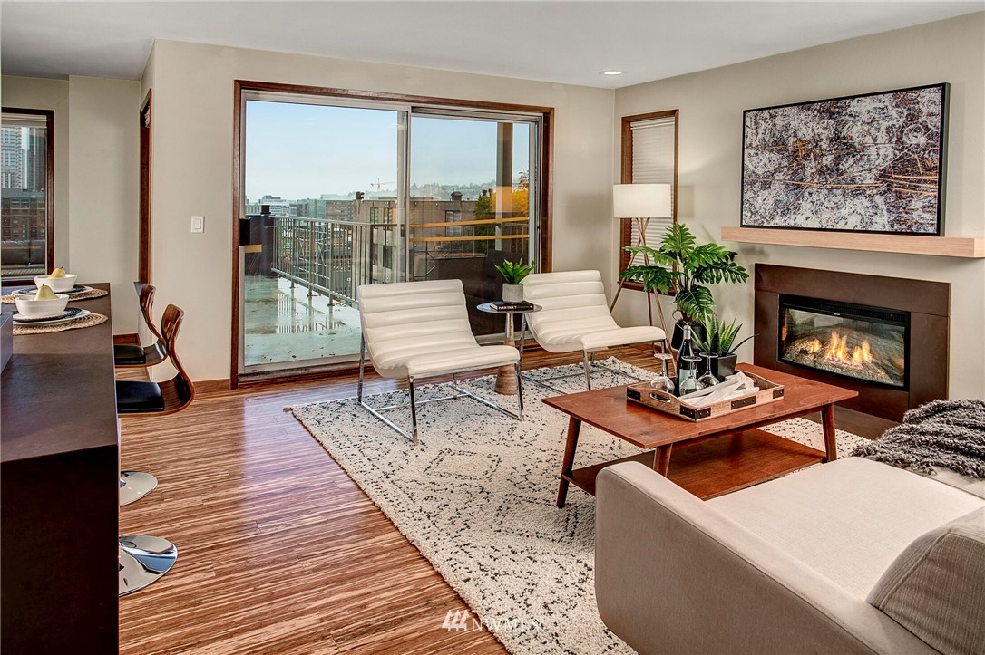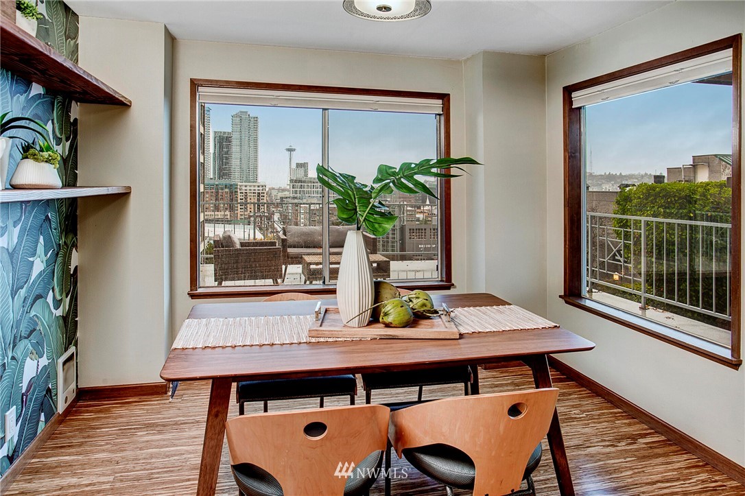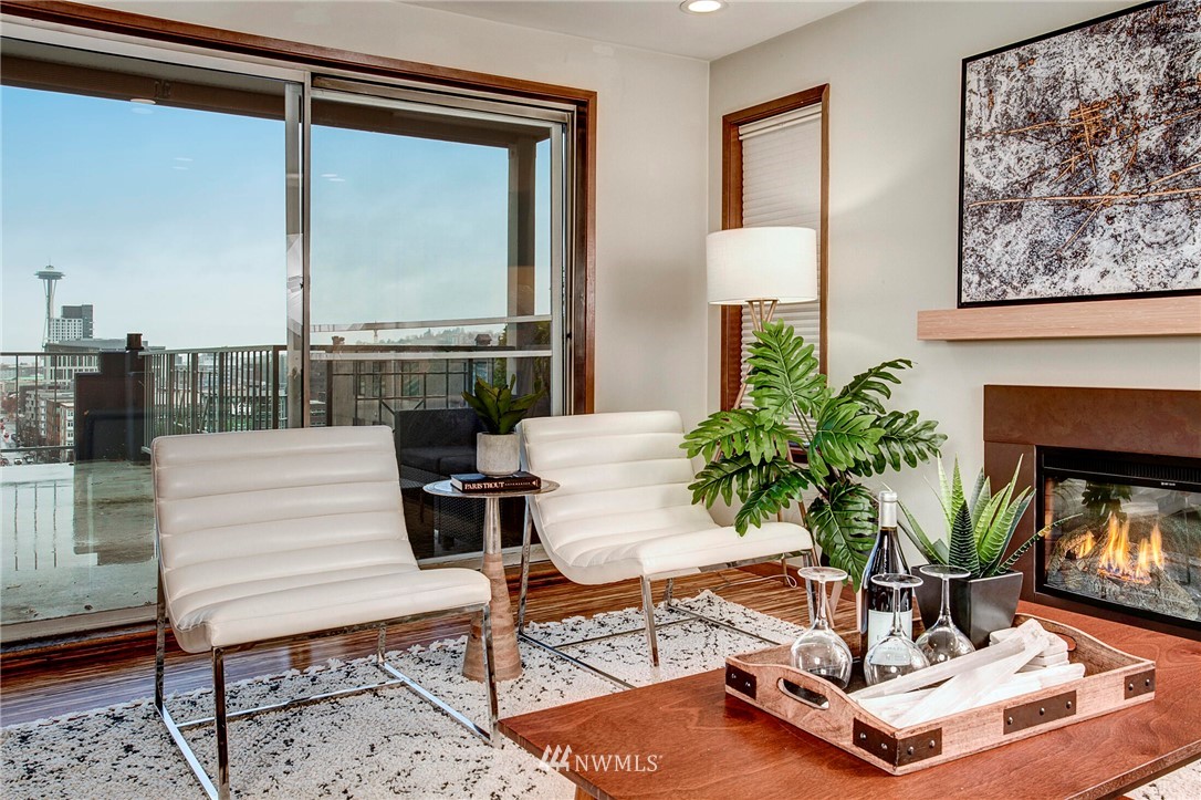 Get out of the cold in the warmth of your new home with a front row seat to the Space Needle. The spacious deck is perfect for 4th of July fireworks with friends and is a wonderful expansion of the living space. Located in the Corniche, a boutique building of just 18 homes, this beautifully remodeled end unit is outfitted with luxury features such as; bamboo "whisper quiet wool" flooring, freshly updated walk in 3/4 bath with waterfall shower and built in speaker, ss appliances, soft-close cabinetry, custom waterfall countertops and motion sensor lighting. Washer and dryer are located within the unit. Ditch the car...everything you need is within walking distance including bus and light rail transit. Welcome home!