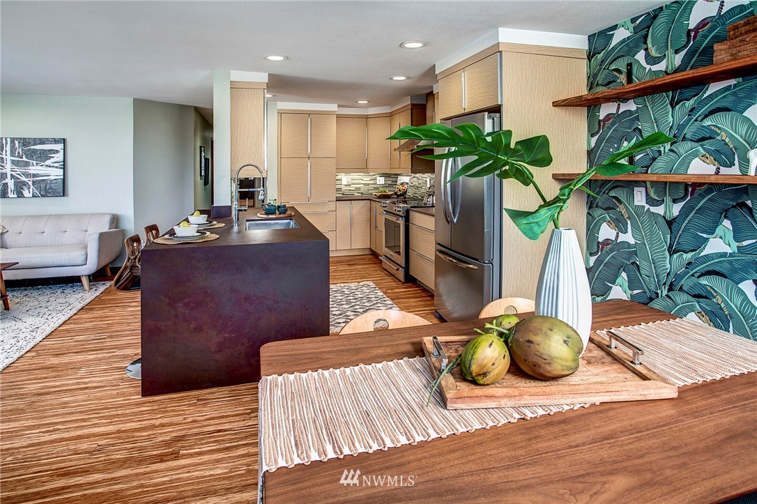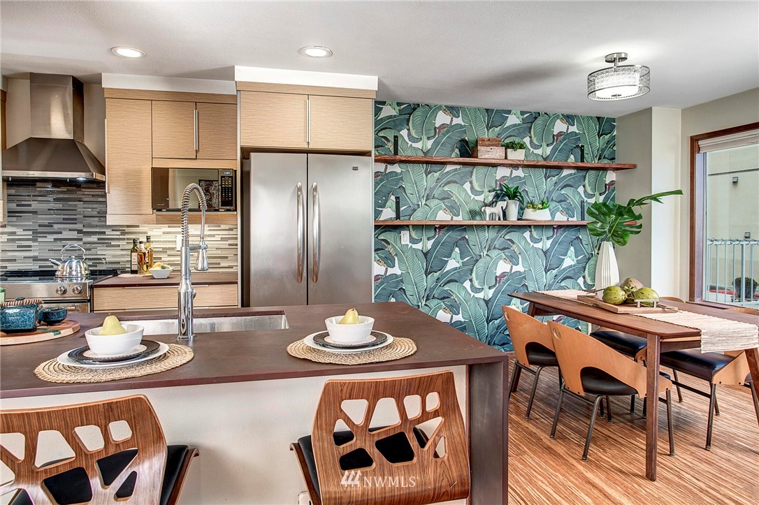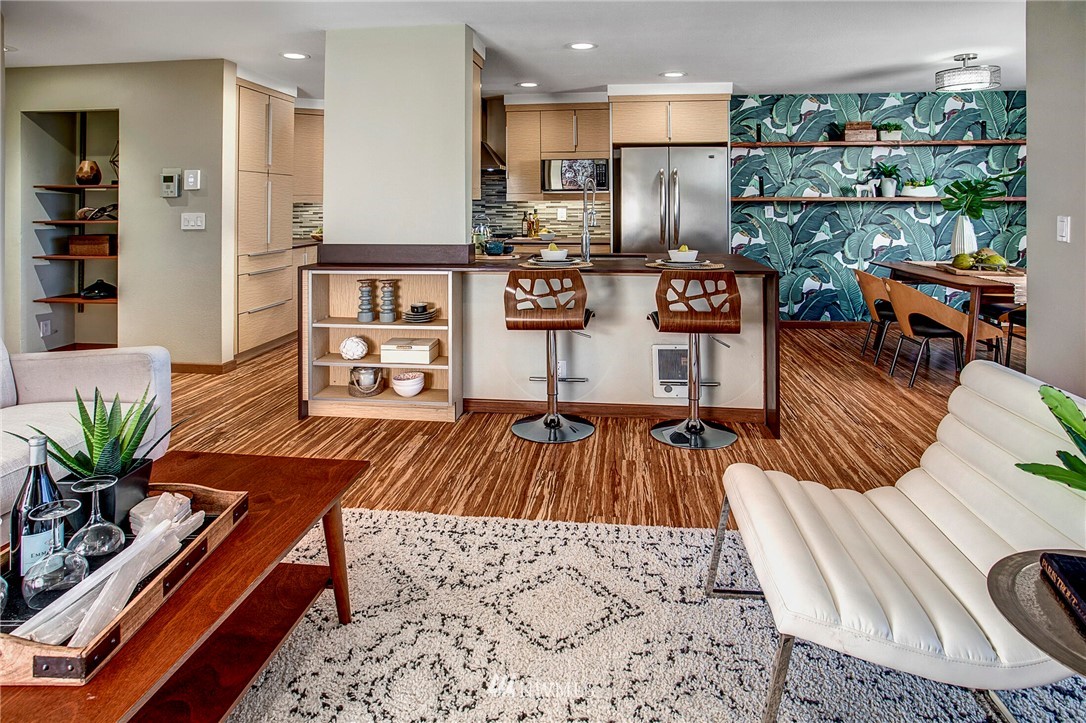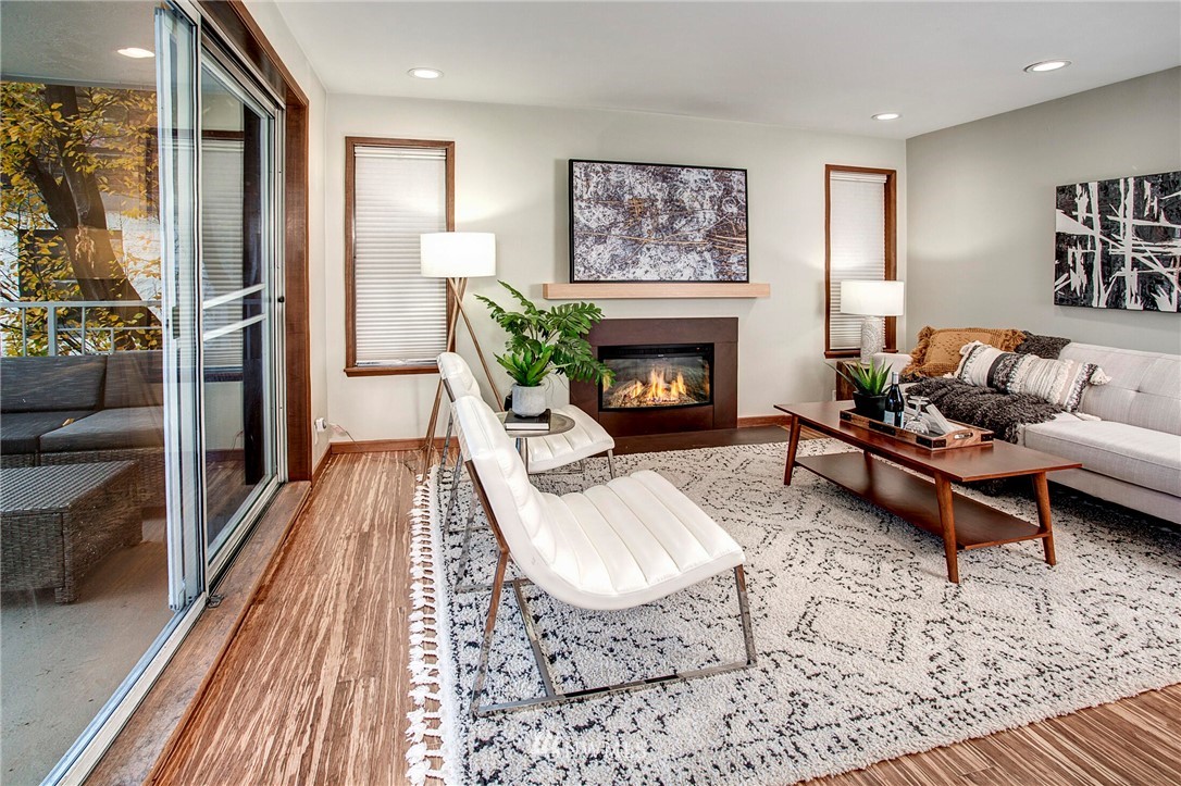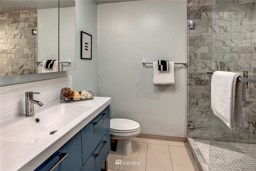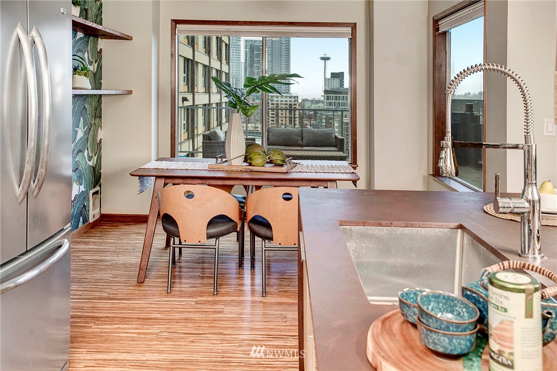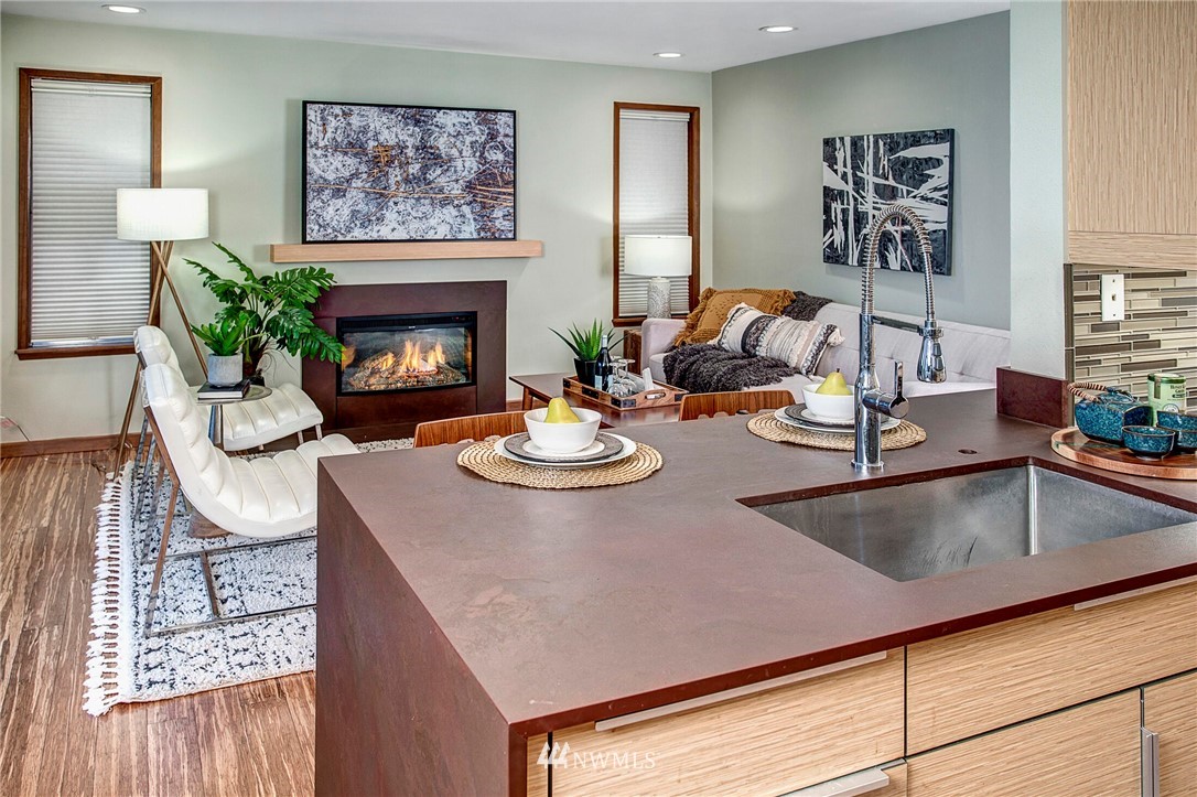 Get out of the cold in the warmth of your new home with a front row seat to the Space Needle. The spacious deck is perfect for 4th of July fireworks with friends and is a wonderful expansion of the living space. Located in the Corniche, a boutique building of just 18 homes, this beautifully remodeled end unit is outfitted with luxury features such as; bamboo "whisper quiet wool" flooring, freshly updated walk in 3/4 bath with waterfall shower and built in speaker, ss appliances, soft-close cabinetry, custom waterfall countertops and motion sensor lighting. Washer and dryer are located within the unit. Ditch the car...everything you need is within walking distance including bus and light rail transit. Welcome home!