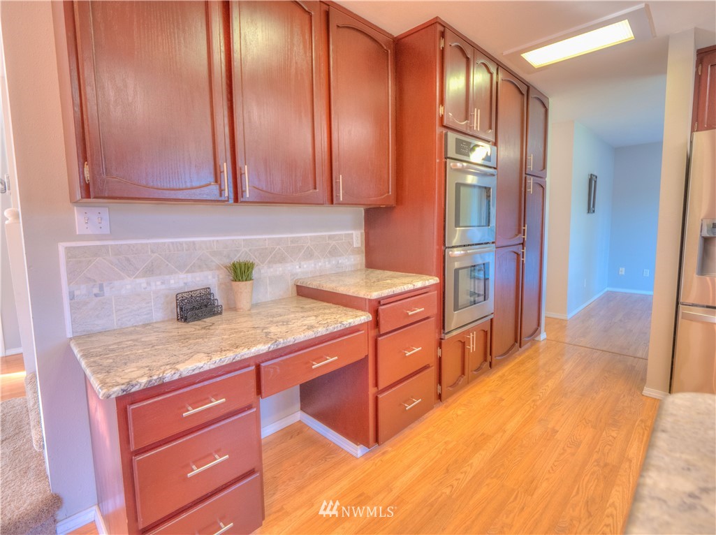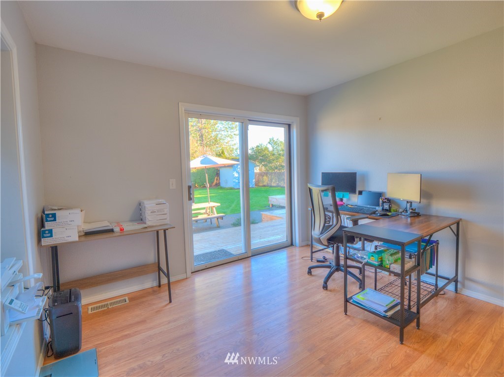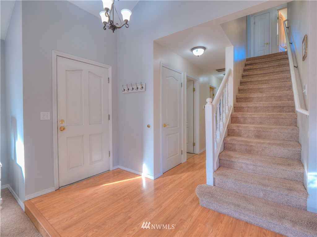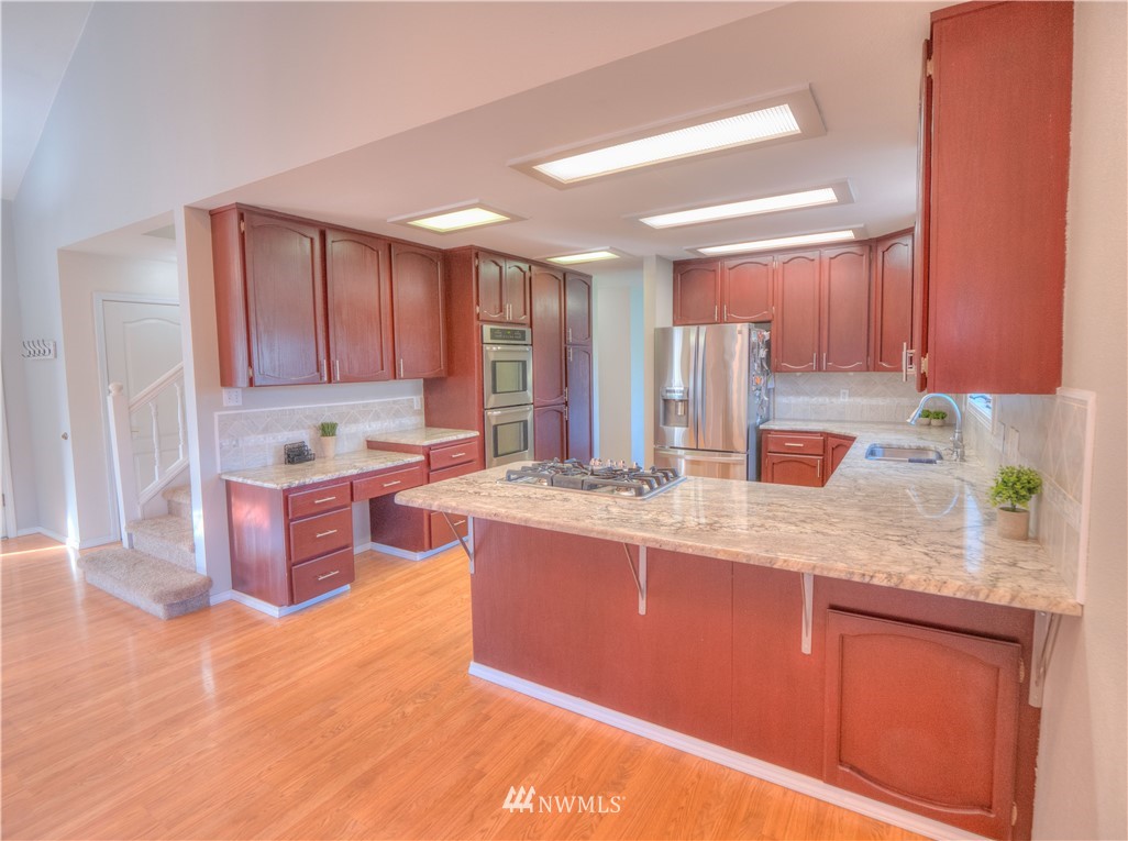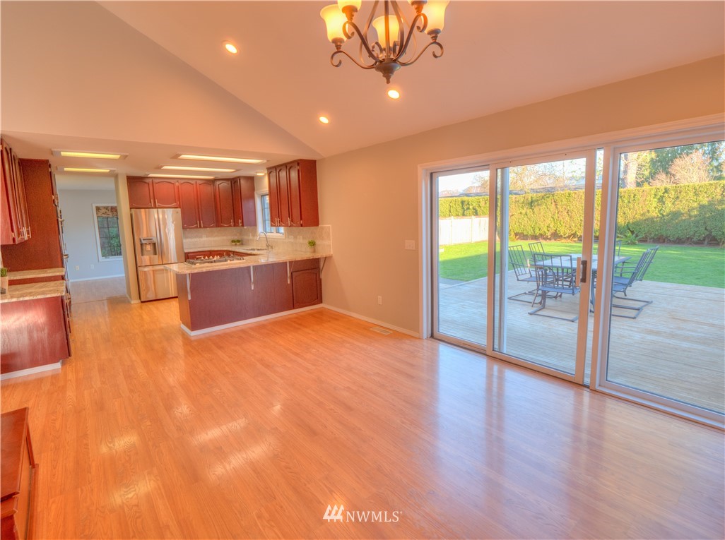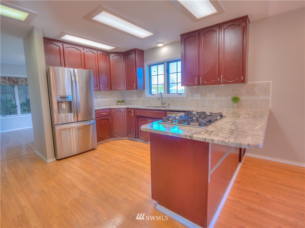 4 bedroom, 2.5 bath home in the heart of Enumclaw. The entry opens up to large family room w/ vaulted ceilings. Updated kitchen w/ vaulted ceilings, granite countertops, abundant cabinetry, SS appliances, & walk-in pantry. Office/dining space adjacent to kitchen. Large, vaulted family room w/ gas fireplace & sliding glass door to the fully fenced backyard, large deck, patio & garden space. Spacious primary bedroom w/ private full bath. Tile .5 bath downstairs w/ granite tile vanity. Upper full bath w/ tile floors. Utility room w/ mud sink next to 2-car garage. Forced air gas heat-AC ready. Newer washer/dryer, new gas water heater.