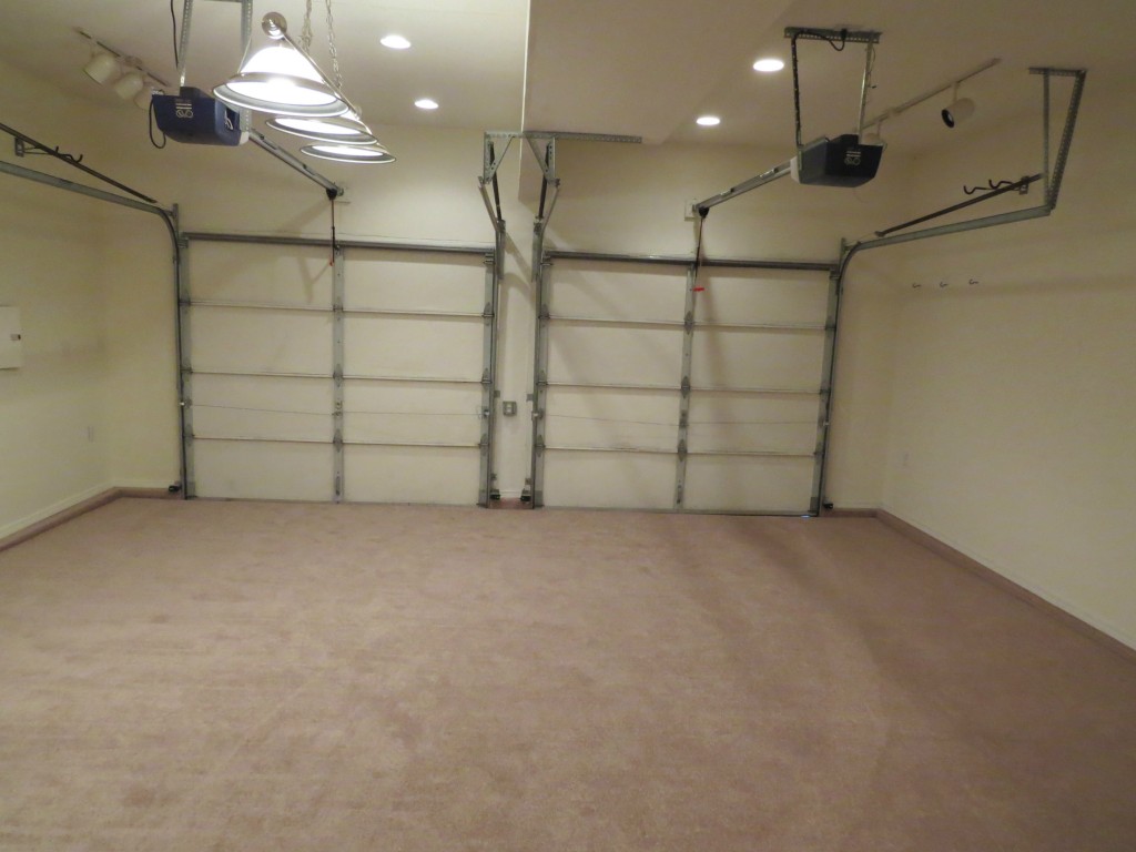 carpeted garage has overhead light fixtures & would be perfect for a game room if desired.