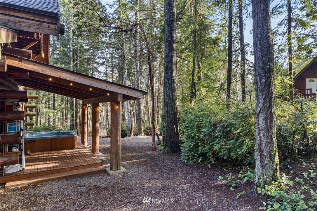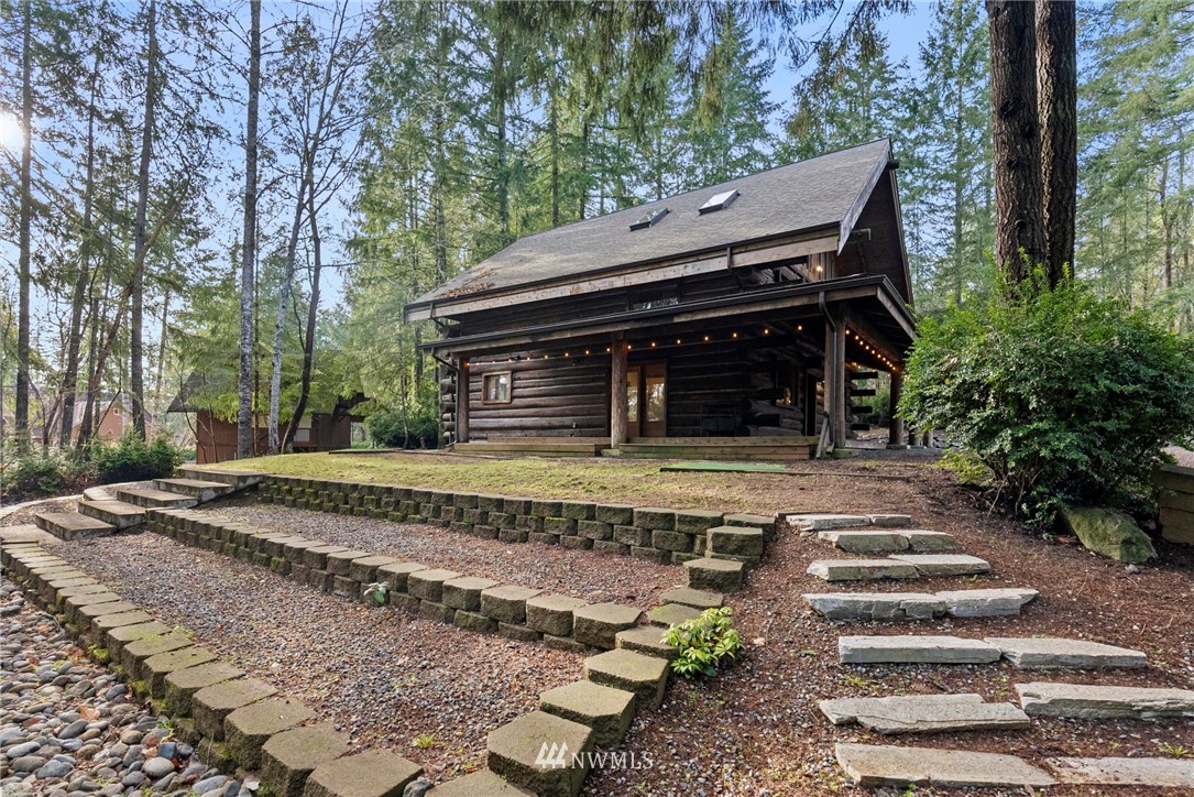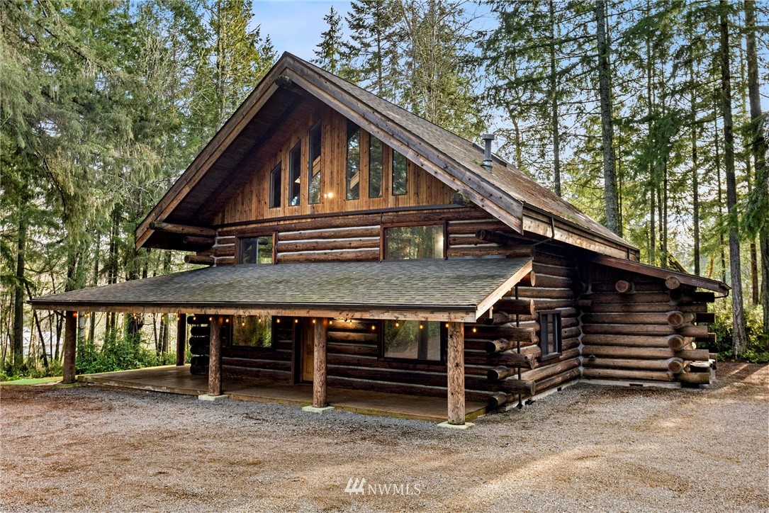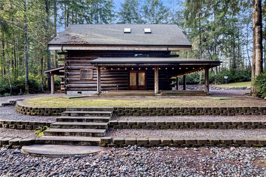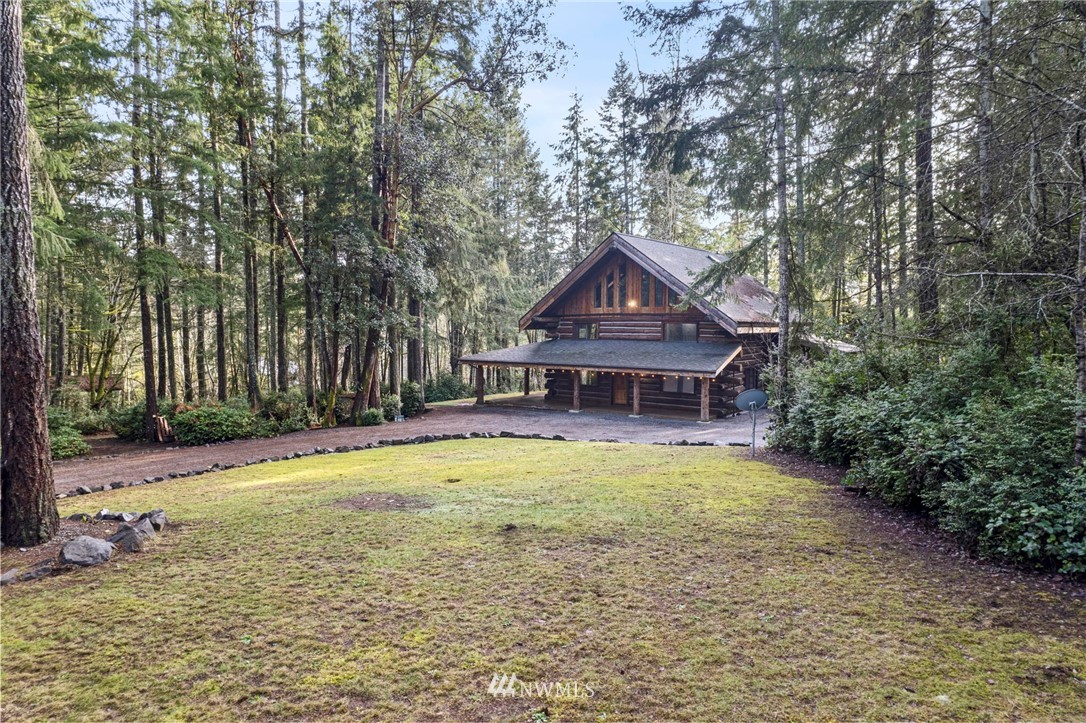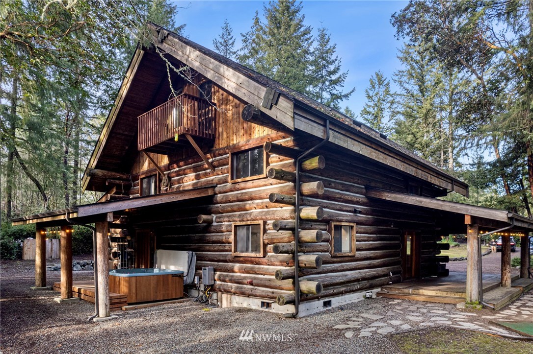Unique Property Alert! This award winning Hand Hewn log home features an estate style layout w/ large lawn areas, chipping green, wrap-around covered decks, fenced sport court, tri-level permitted recreational outbuilding perfect (not ADU) for a home gym, office, school room, or storage- All nestled on 2.5 private acres. Primary bedroom on main features an over-sized walk-in closet & french doors lead to hot tub. Efficient ductless heat pump & gas (propane) fireplace for year round climate control. Kitchen has been beautifully updated w/stone counters, top of the line appliances, glass tile accents & stainless farm sink. Newer 50 year composition roof! Easy access to HWY 16 and Gig Harbor shopping. Peninsula School District.