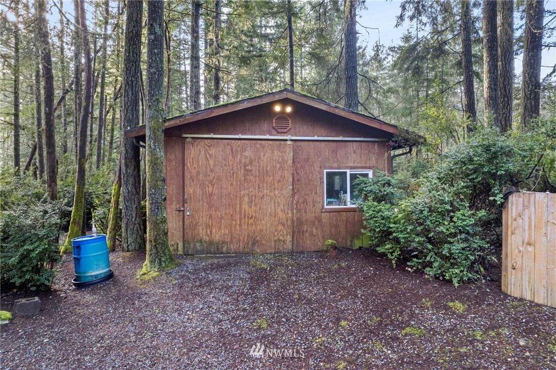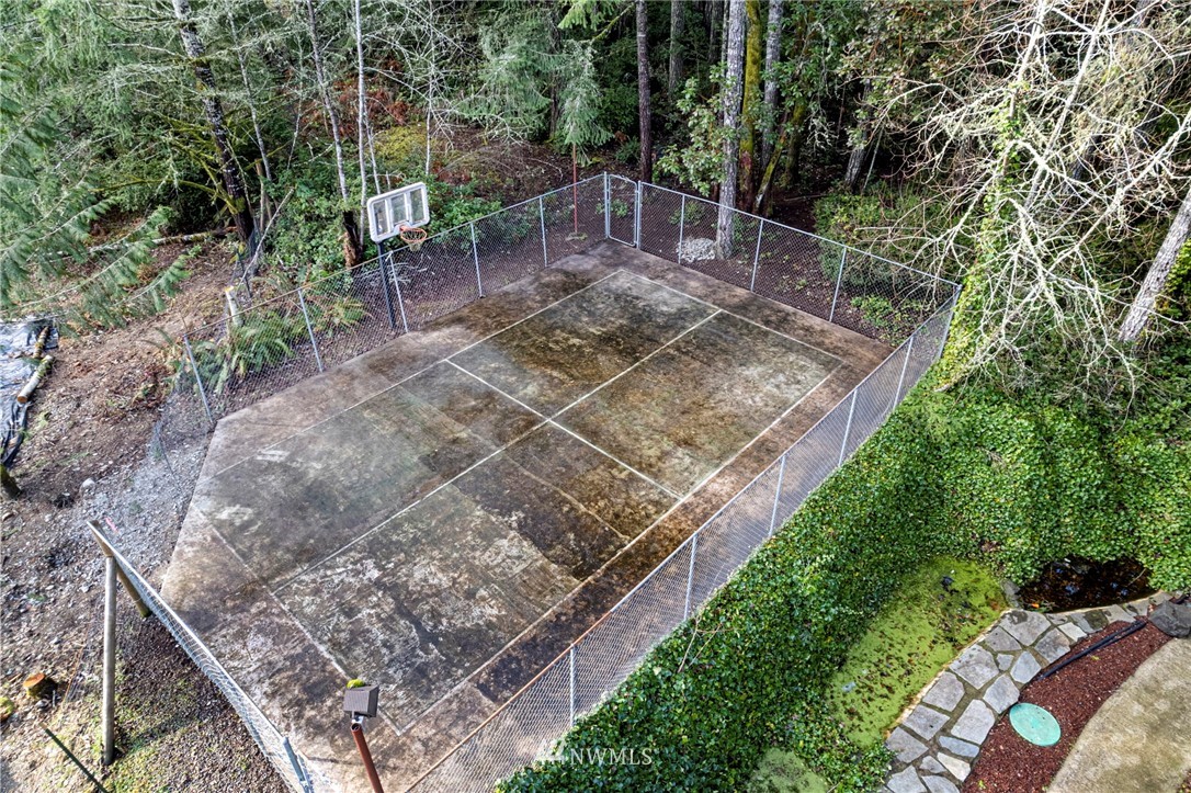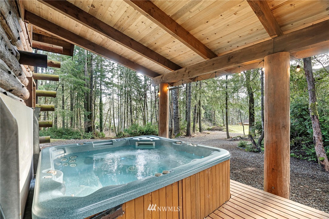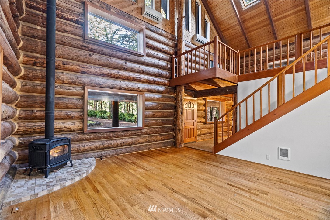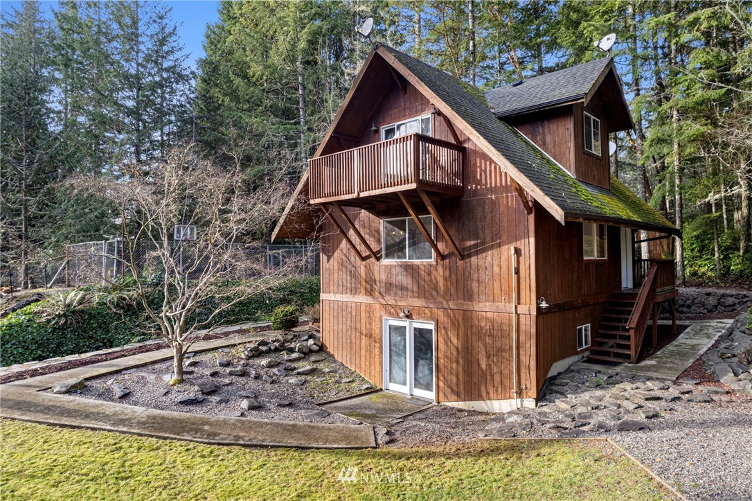Unique Property Alert! This award winning Hand Hewn log home features an estate style layout w/ large lawn areas, chipping green, wrap-around covered decks, fenced sport court, tri-level permitted recreational outbuilding perfect (not ADU) for a home gym, office, school room, or storage- All nestled on 2.5 private acres. Primary bedroom on main features an over-sized walk-in closet & french doors lead to hot tub. Efficient ductless heat pump & gas (propane) fireplace for year round climate control. Kitchen has been beautifully updated w/stone counters, top of the line appliances, glass tile accents & stainless farm sink. Newer 50 year composition roof! Easy access to HWY 16 and Gig Harbor shopping. Peninsula School District.