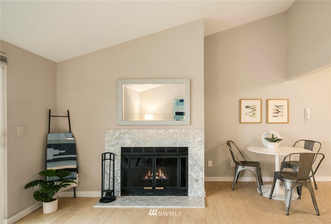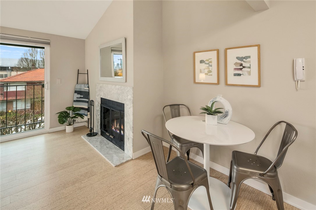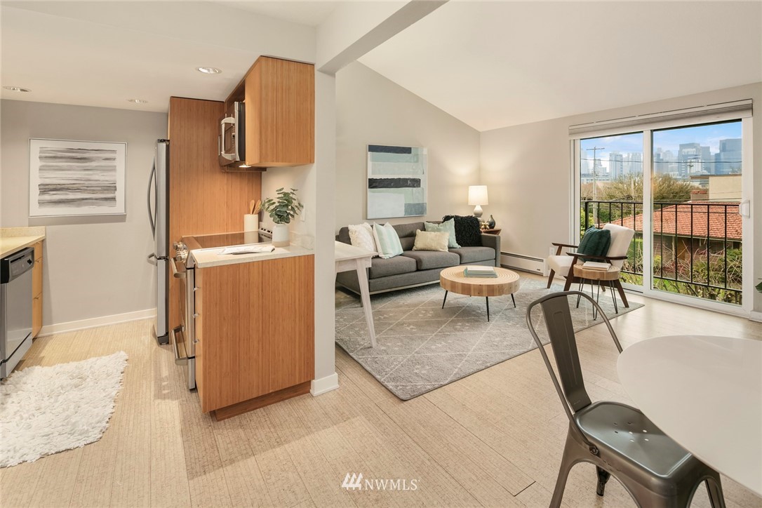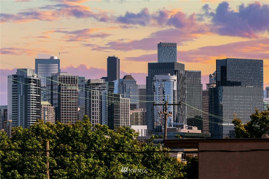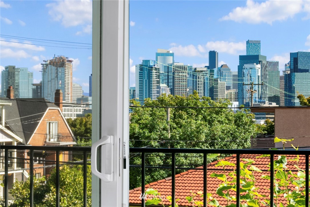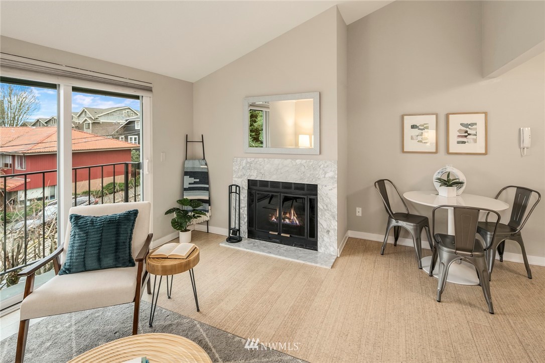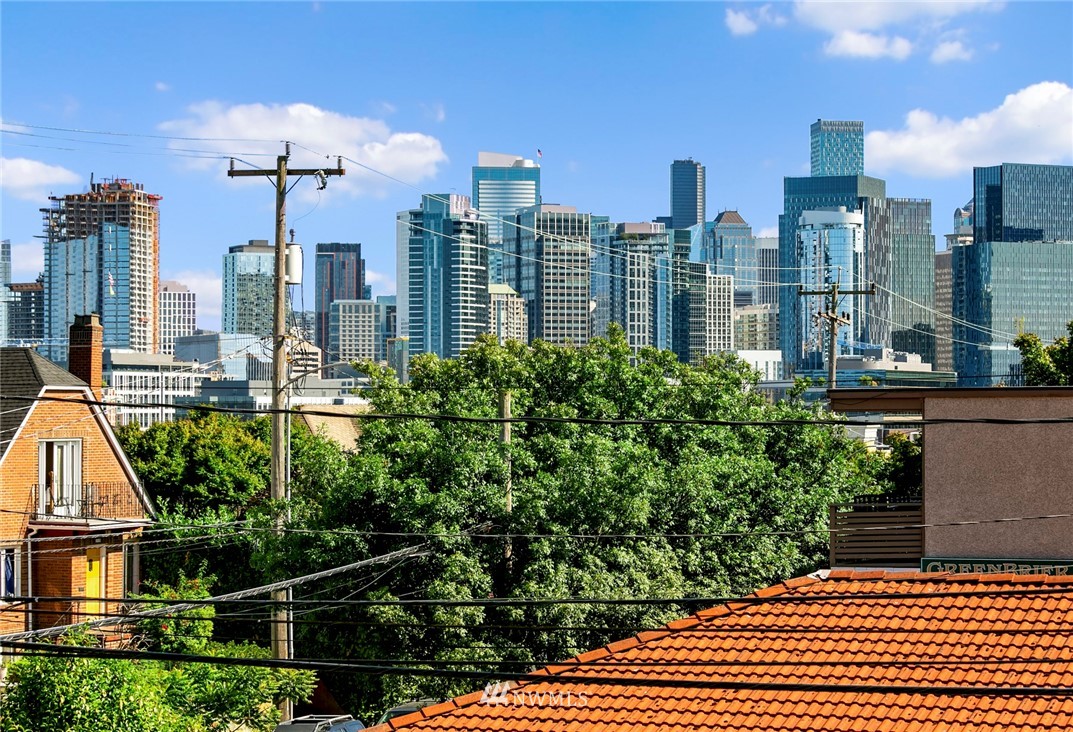 Life sparkles in this gorgeously updated, light & bright south facing top-floor condo on Queen Anne's coveted east slope. Quiet, pet friendly unit boasts vaulted ceilings, stunning city views, wood burning fireplace, in-unit washer/dryer & custom designed eco-friendly finishes including: Novustone recycled glass countertops, Lutron lighting & blinds, bamboo cabinetry, Wicanders cork floors & SS appliances. Self-managed 8 unit building has low dues, dedicated parking & storage. Bike, ride or walk everywhere - as you're just blocks from downtown, cafes, shops and the amazing variety of work & fun Seattle has to offer like Seattle Center, Kraken games at Climate Pledge Arena, South Lake Union, Amazon, Google & Meta.