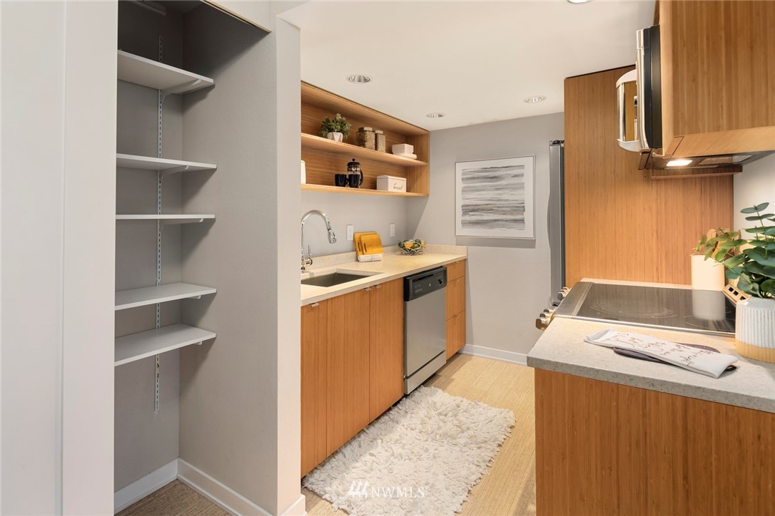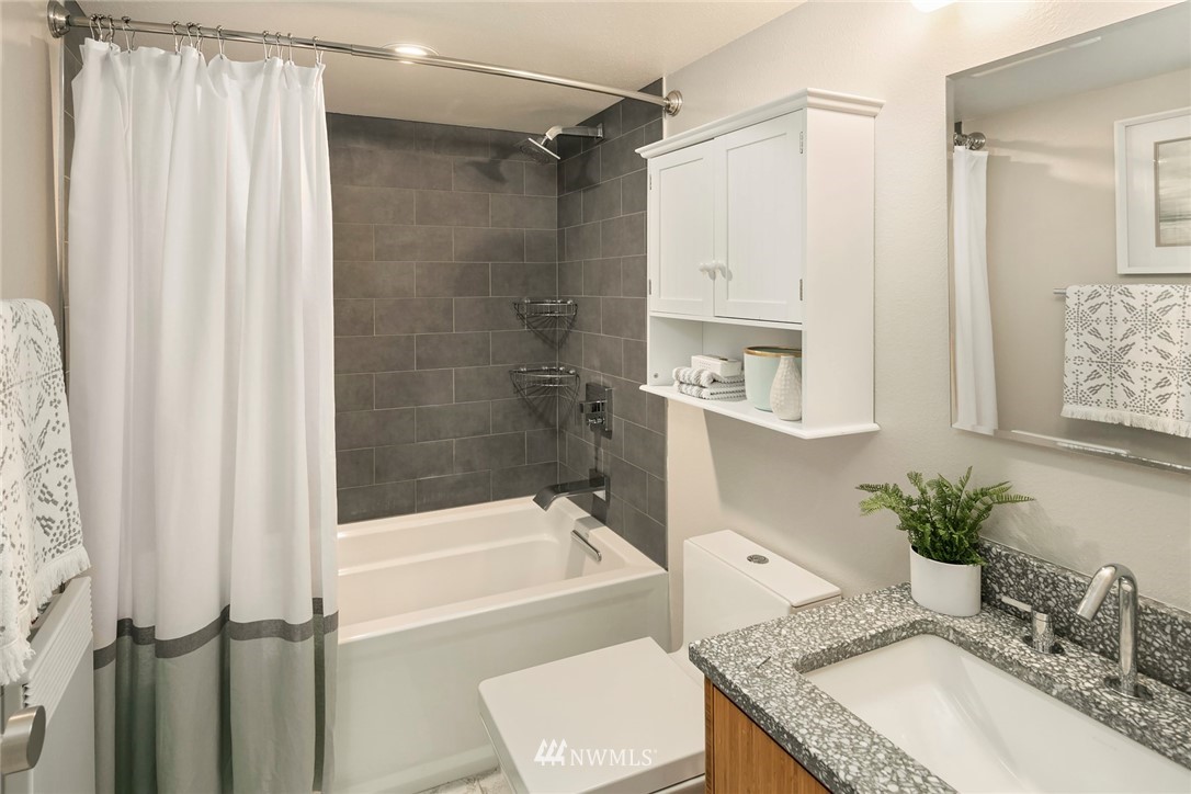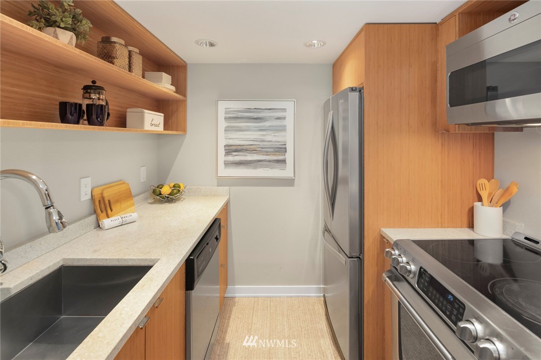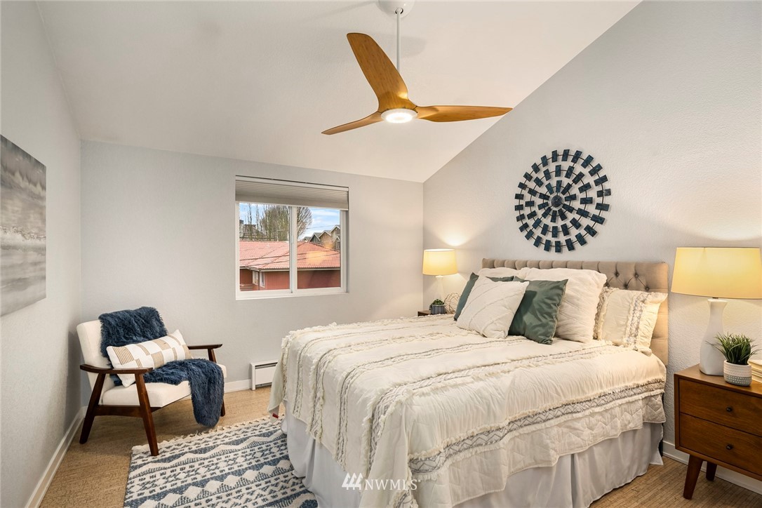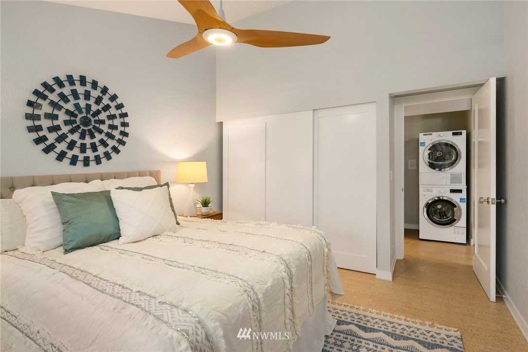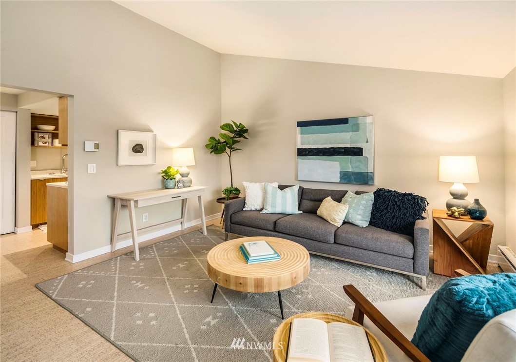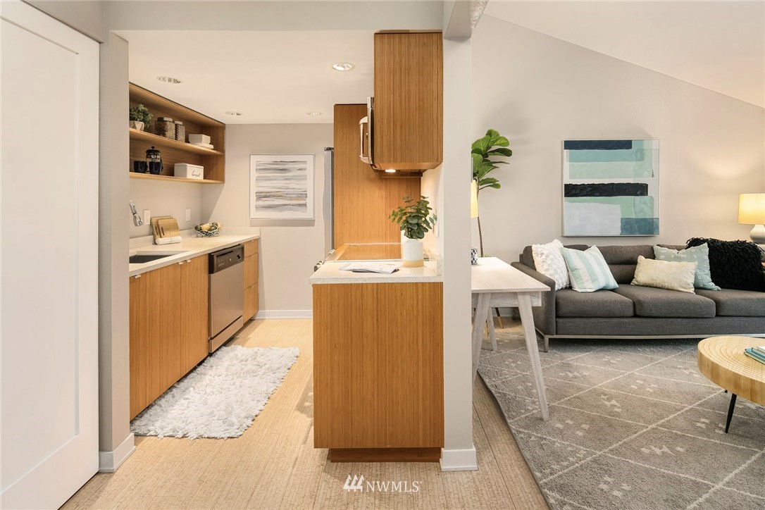 Life sparkles in this gorgeously updated, light & bright south facing top-floor condo on Queen Anne's coveted east slope. Quiet, pet friendly unit boasts vaulted ceilings, stunning city views, wood burning fireplace, in-unit washer/dryer & custom designed eco-friendly finishes including: Novustone recycled glass countertops, Lutron lighting & blinds, bamboo cabinetry, Wicanders cork floors & SS appliances. Self-managed 8 unit building has low dues, dedicated parking & storage. Bike, ride or walk everywhere - as you're just blocks from downtown, cafes, shops and the amazing variety of work & fun Seattle has to offer like Seattle Center, Kraken games at Climate Pledge Arena, South Lake Union, Amazon, Google & Meta.