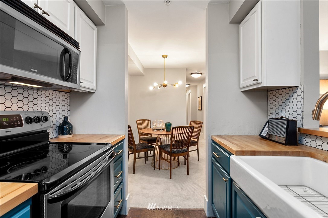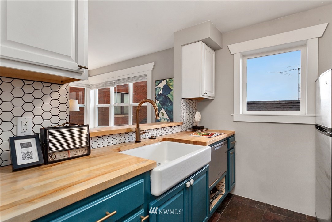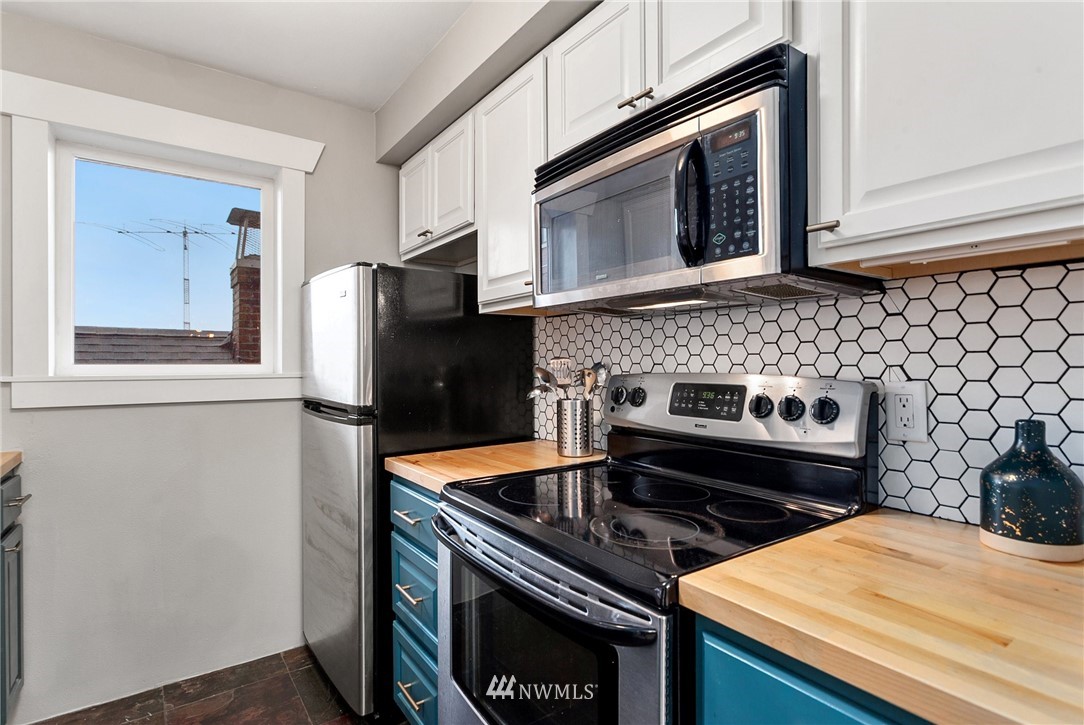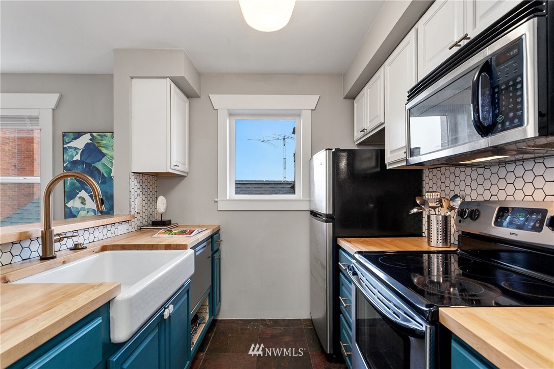 Welcome home! This corner unit is conveniently located near The Junction shops, plentiful recreation & public transit! Cooking can be delightful in this wonderfully updated kitchen with butcher block countertops and farmhouse style sink. Relax in the spacious living room boasting abundant windows with views of the Cascades over the rooftops. In-unit laundry and off street parking to further simplify your life. Don't miss this opportunity to enjoy maintenance-free living surrounded by city amenities!