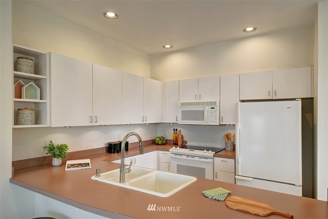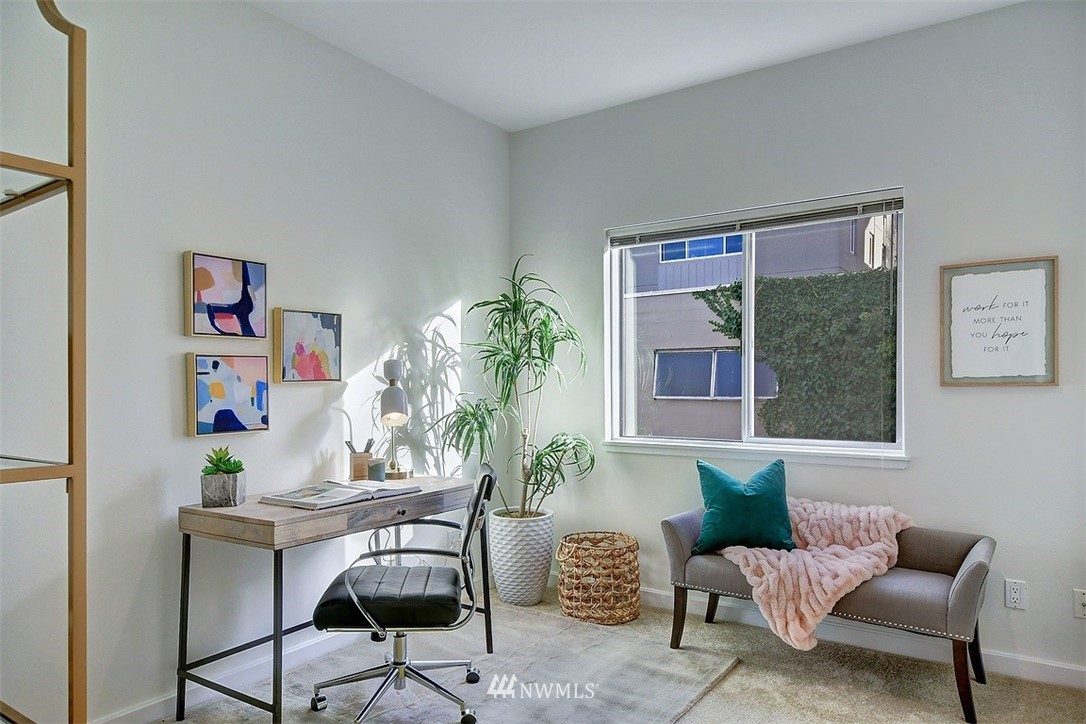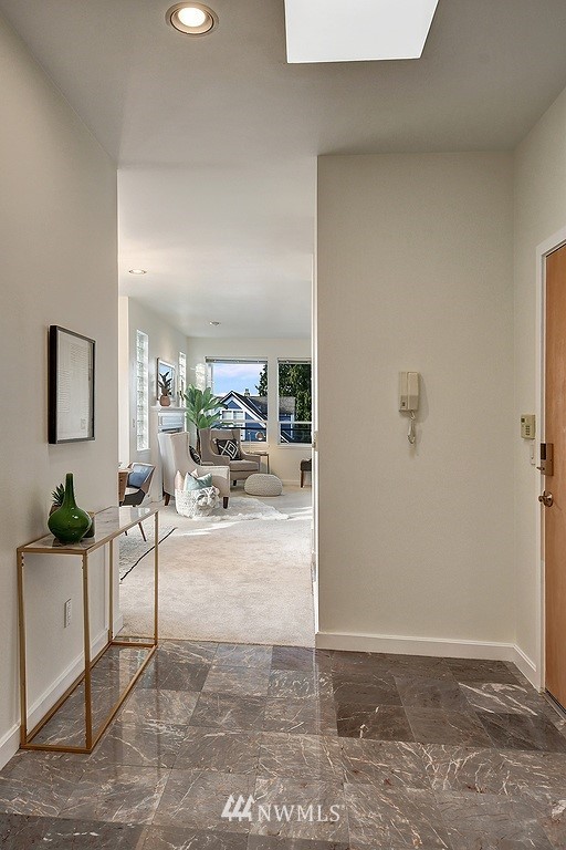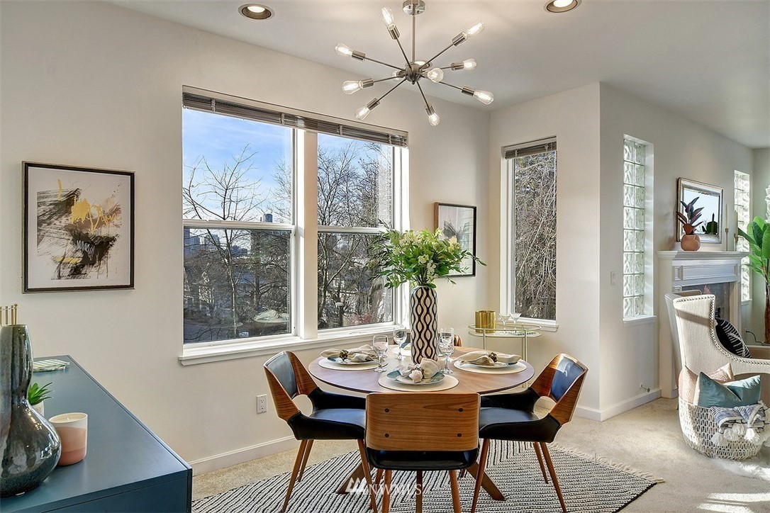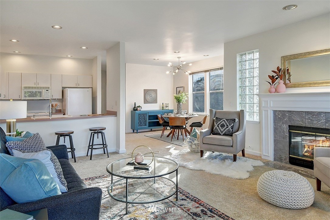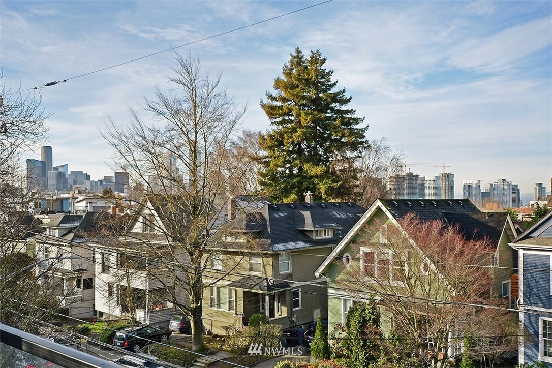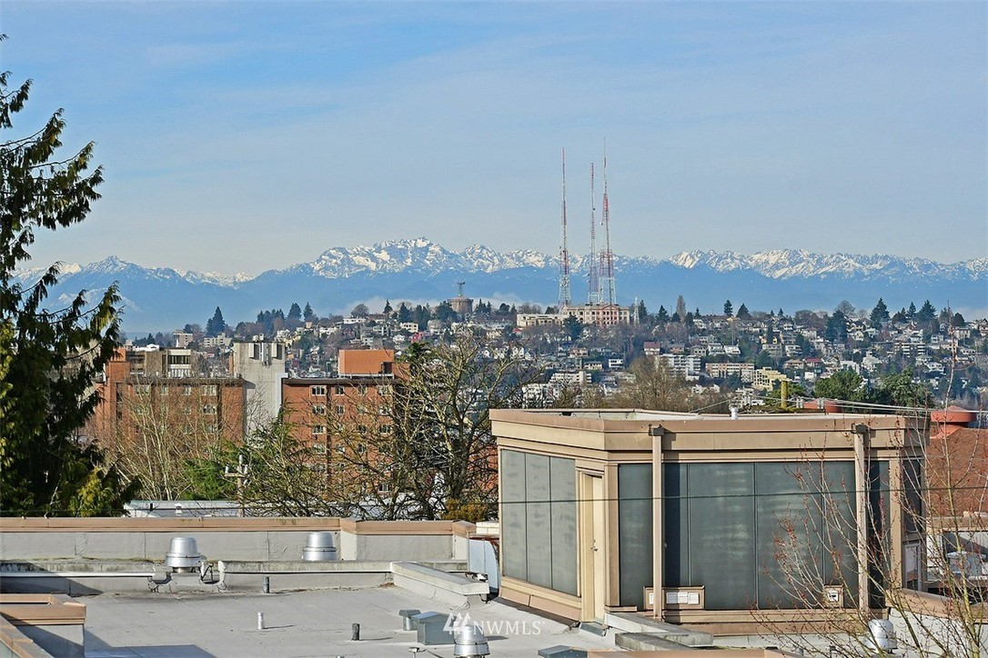 Beautiful, light-filled 1,394 sf penthouse style condo with city, mountain & Sound views offers an elegant lifestyle nestled in North Capitol Hill just blocks to Volunteer Park! One of only 8 units in this well-managed building. Entertain in style in this top floor, SW corner home with its own rooftop deck, 9 ft ceilings, marble entry w skylite & superb design. Open plan kitchen, dining, & living rm w/ frplc opens to sunny view deck. Extra spacious primary suite w/ 2 huge walk-in closets & dble vanity bath. Large utility room, new carpets and paint. Gated, secure parking, 2 spaces situated next to its 14x6 ft storage room & elevator. Low HOA dues, No Rental Cap & well-funded reserves make this a truly significant opportunity to call home.