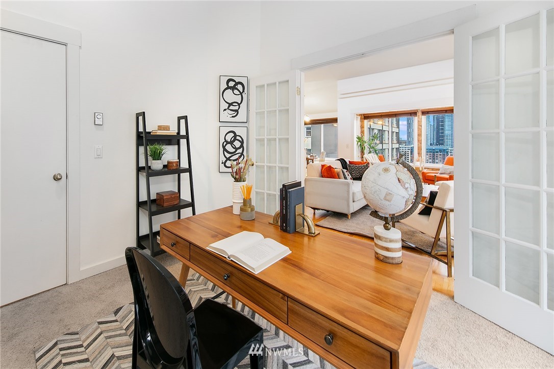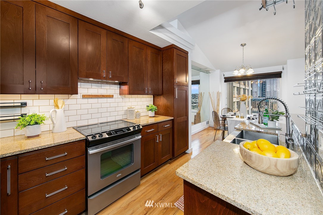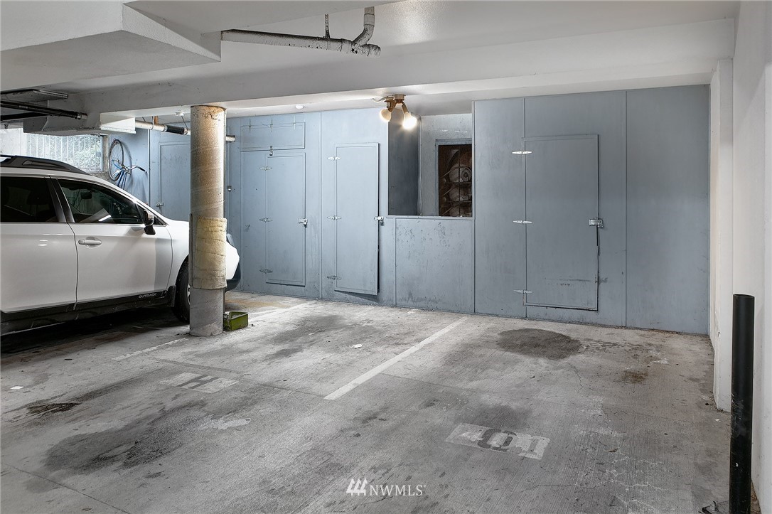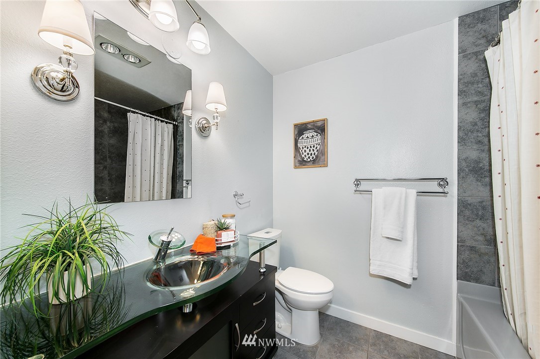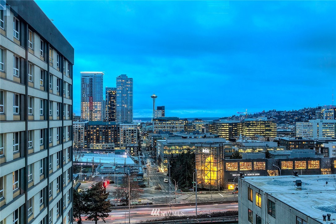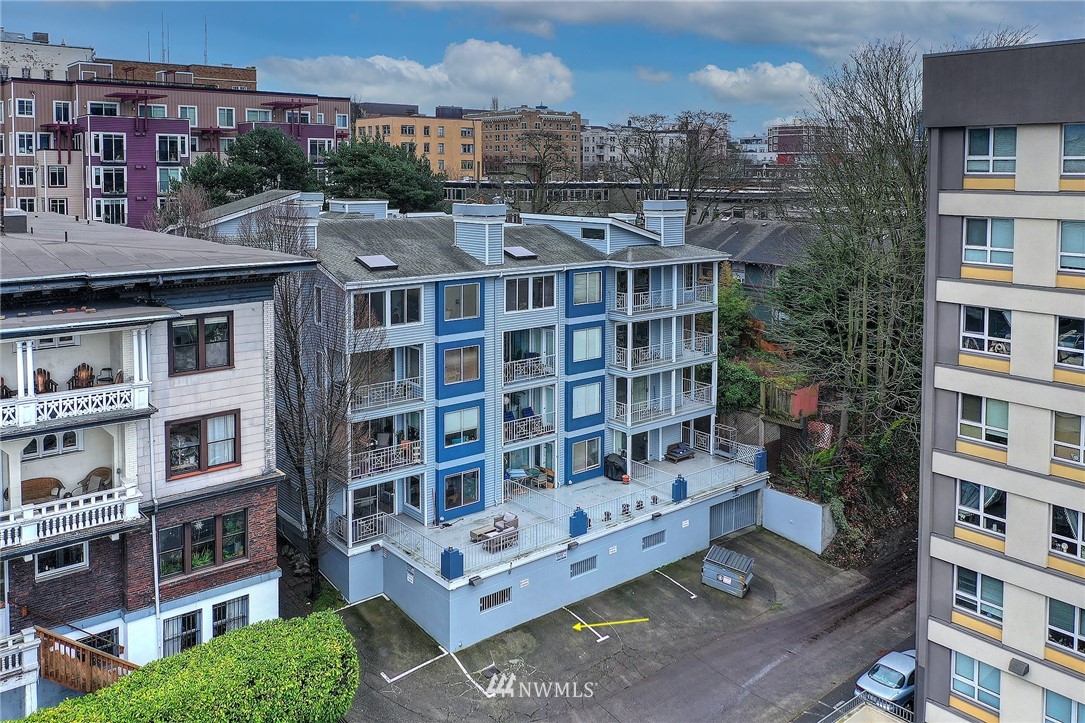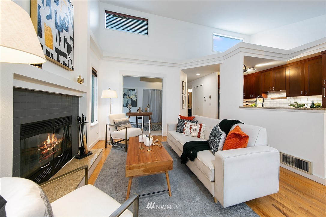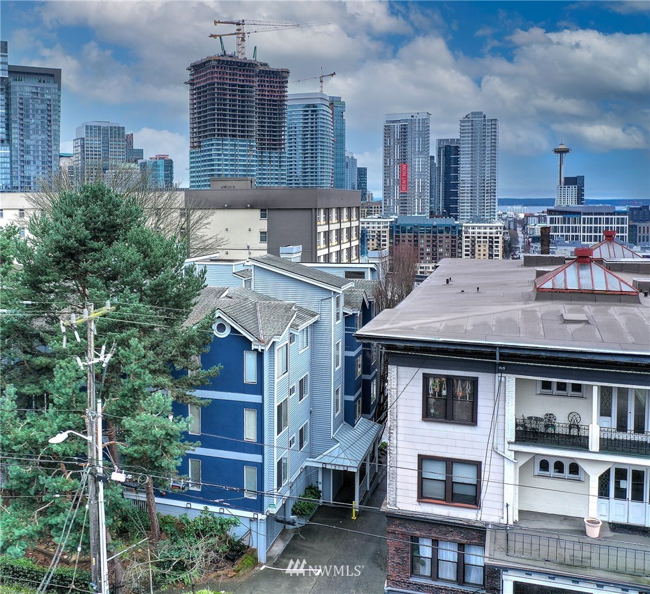 Top floor Capitol Hill Condo w/ expansive views of the Space Needle, Sound, and Olympics. This Western facing 2 bdrm 2 ba home will impress w/ its vaulted ceilings, wood burning fireplace, french doors, skylights and more. Open concept kitchen w/ SS appliances, granite countertops, beech cabinets, and a double sink. Dedicated dining nook and bonus space off living area boasting exceptional views. Primary bedroom w/ walk in closet and en-suite bath complete w/ dual vanity and large jetted tub. French doors offer flexibility for second bedroom - use as home office or enclose for guest bedroom. Two dedicated parking spots and storage unit. Prime location just steps away from Capitol Hill's top restaurants, bars, and cafes.