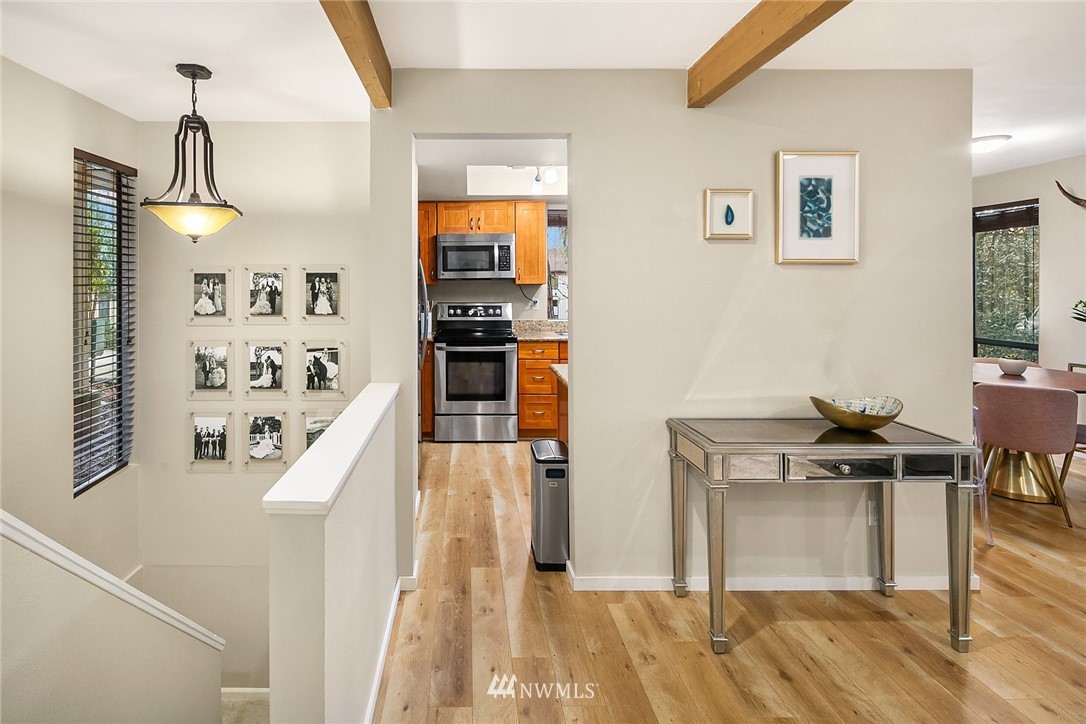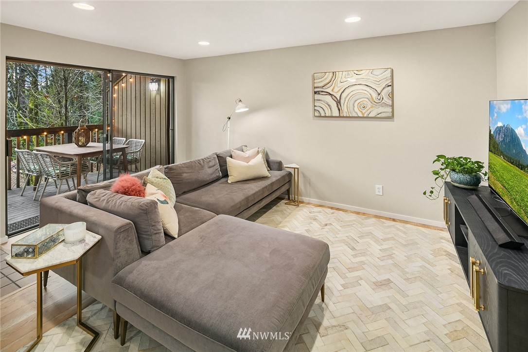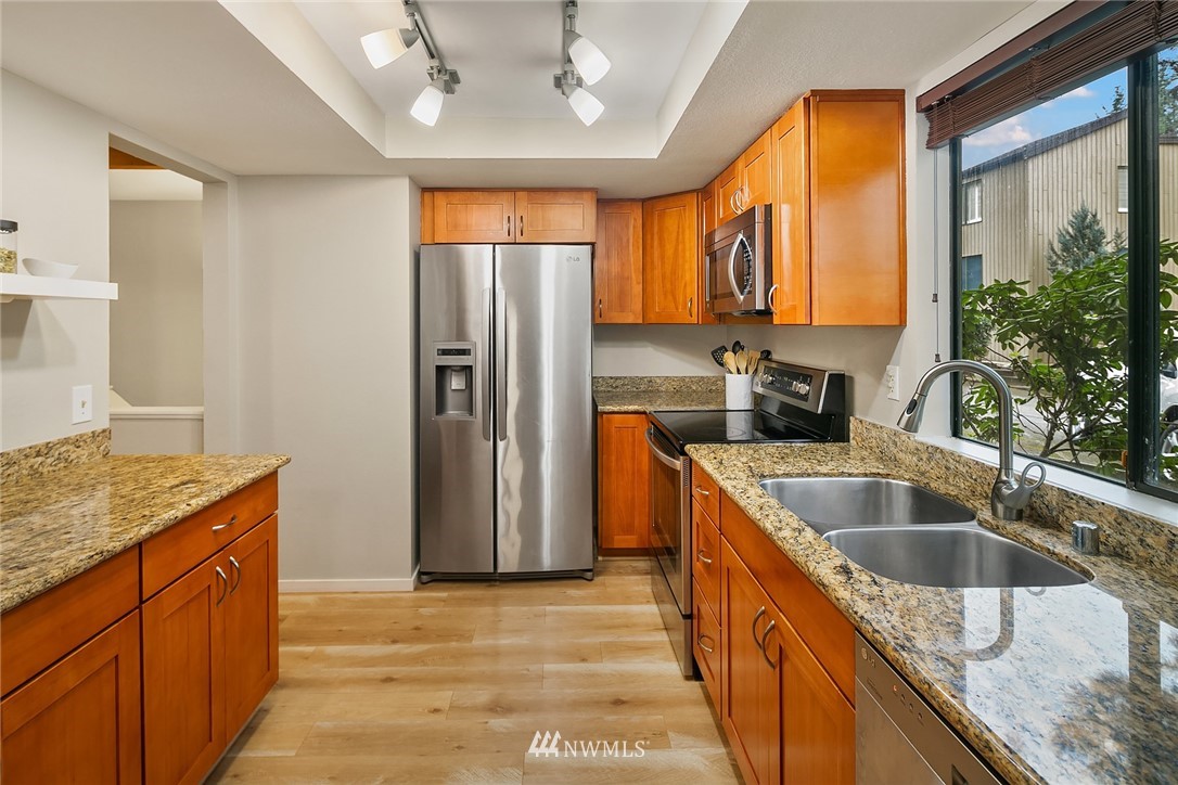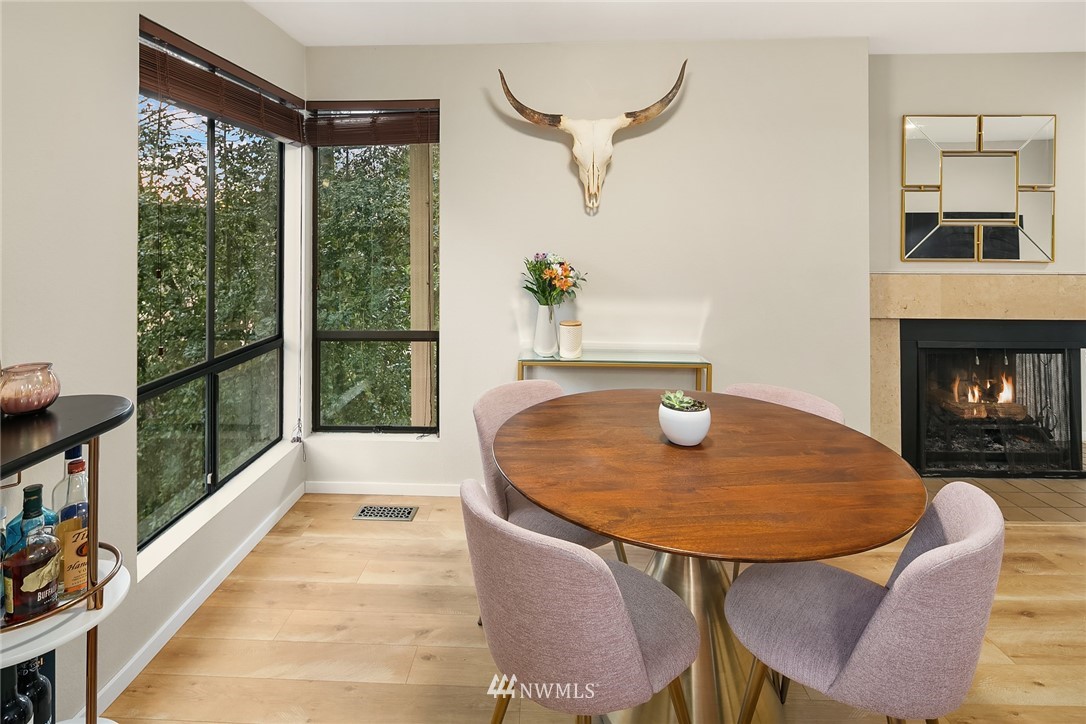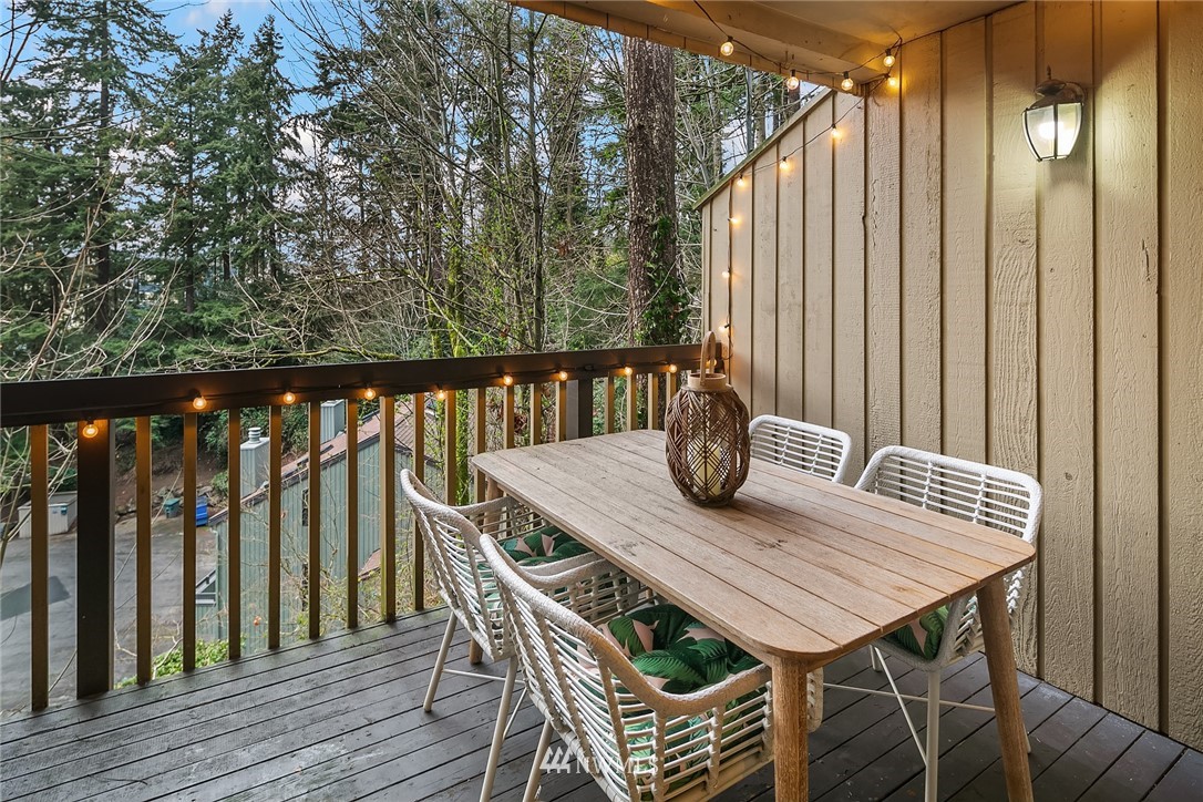 Bright and updated end unit condo with territorial views conveniently located on the border of Bellevue and Kirkland across the street from the South Kirkland P&R and trail connecting DT Bellevue, Google, DT Kirkland w/ future access to Woodinville, East rail, and Wilburton Light Rail Station. Granite counters in the open kitchen. Escape the rain in front of the wood-burning fireplace and impress your guests with your entertaining skills in the spacious living/dining areas. Primary bed access to the lower deck. Full sized in-unit W/D. Two parking spots, one covered! Well-maintained grounds with clubhouse, pool, athletic court and on-site manager. No rental cap, pet friendly, and excellent Lake Washington Schools make this condo a must see!