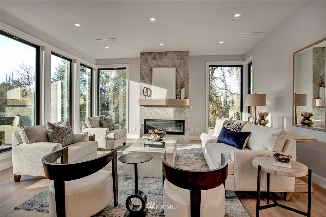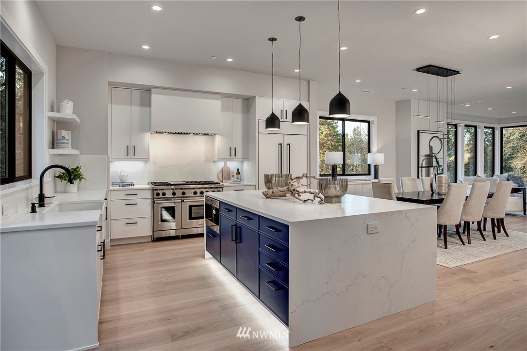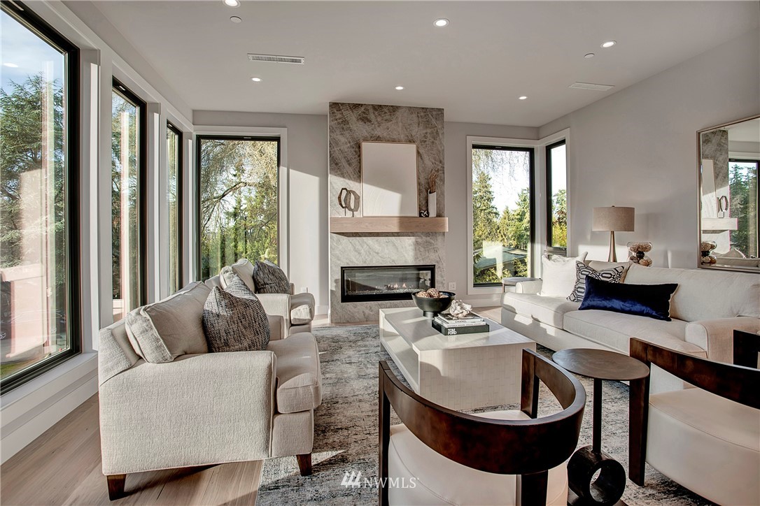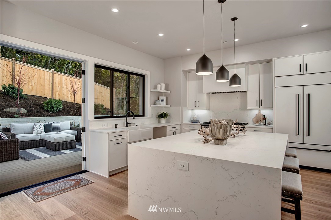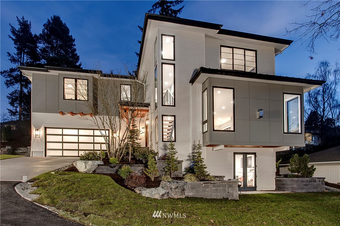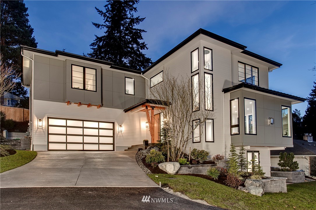 NW modern meets Scandinavian contemporary in this new construction 5BR/5 Bath + office. Great room is appointed with 10' ceilings, white oak floors, a large wall of windows for year-round natural light, and a striking floor-to-ceiling fireplace. Top of the line finishes from Signature Hardware, Moen Align, Kholer, Brizo Odin, and Nameeks. Modern kitchen with integrated appliances, giant white slab countertop for ample entertaining, 33" farmhouse sink, 48"-6 burner Wolf range, Subzero fridge. Designer finishes throughout, including a stylish powder room & primary bath. 4BRs together on the upper floor. Legal ADU/Guest Suite with 2nd kitchen -use as 5th BR, Bonus Rm, or visiting relatives or a rental. Near I-90, bike trail, JCC & Shore Club.