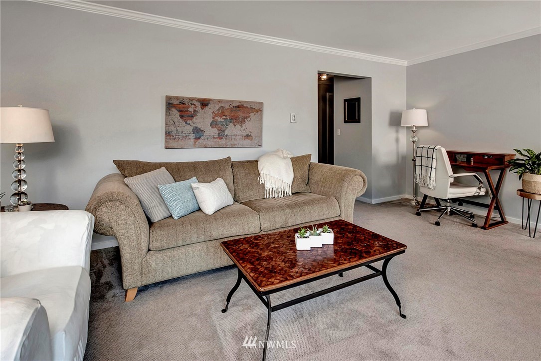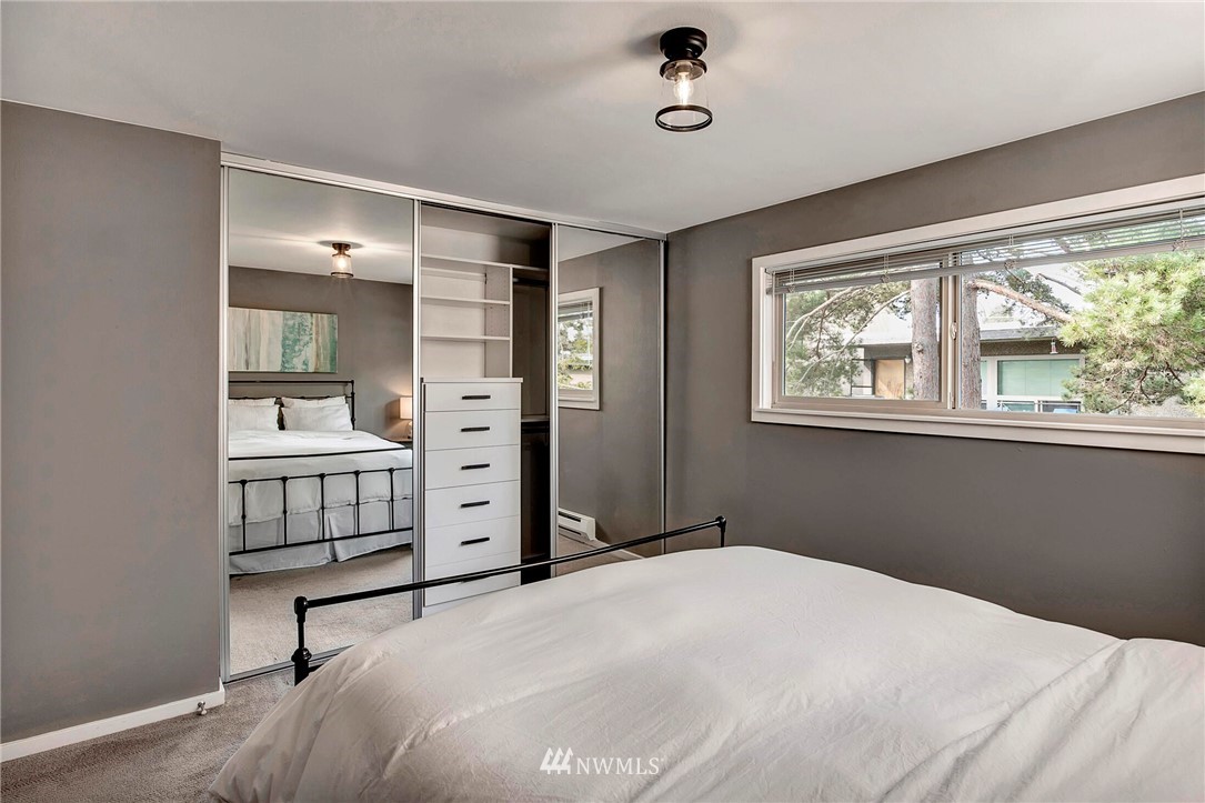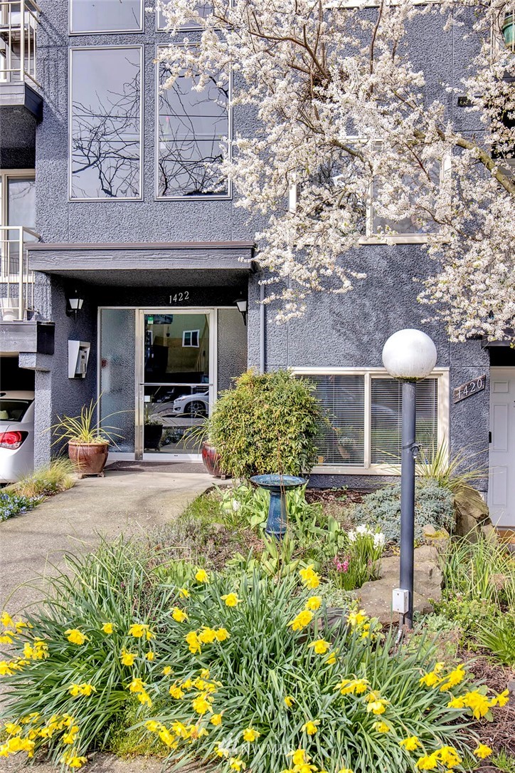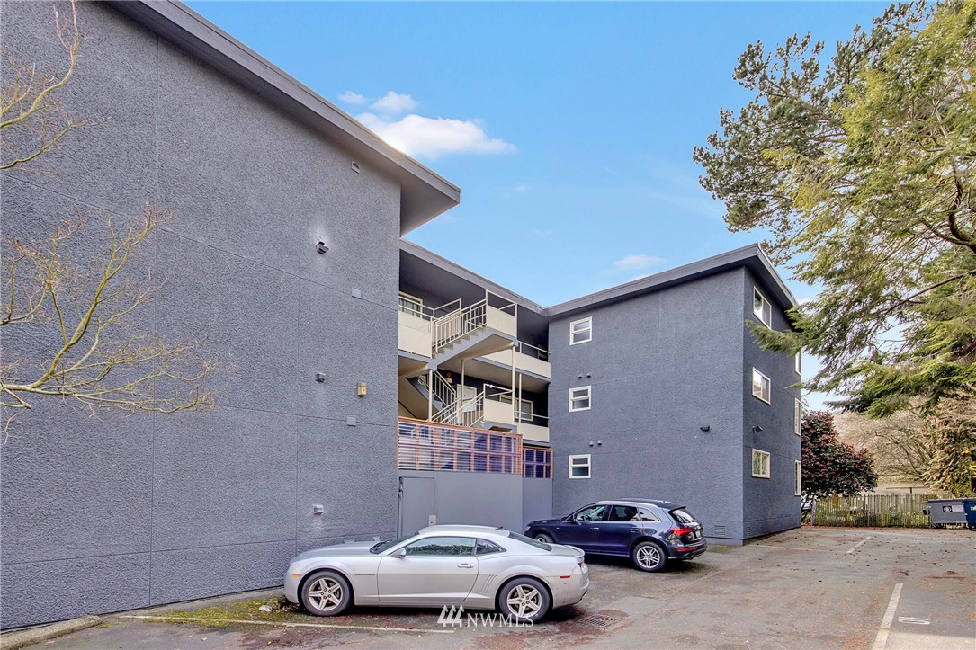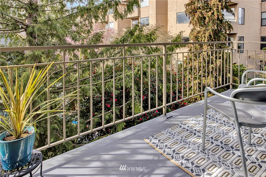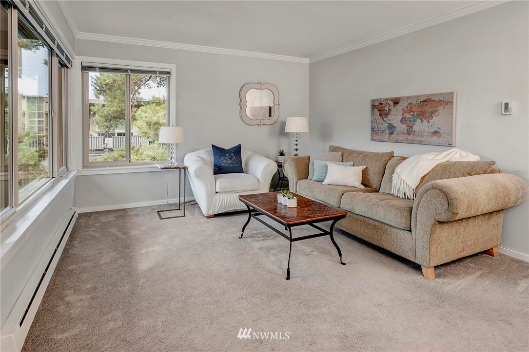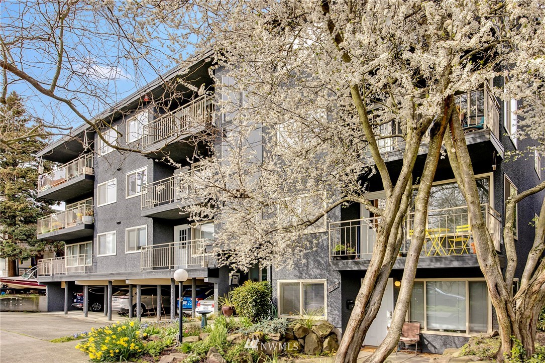 Soak up brightness and trees at Ballard Landing. Western-facing, top floor, corner unit offers tranquility and close-knit community. Delightful walk to premium grocery store, historical downtown, hip 65th street, breweries, endless restaurants. Park two blocks away (pup haven). 92 walk score! Come home to style, LOTS of light, spacious deck, crown molding, new light fixtures, in-unit Bosch washer/dryer, and four closets (including two California Closets). Dreamy layout. Secure storage unit and bike room in basement. One parking spot. Expert HOA with no special assessments to date – well-planned reserves to keep the mid-century modern building in shape. Majority owner-occupied, rent friendly. Relax and live the dream in beloved Ballard.