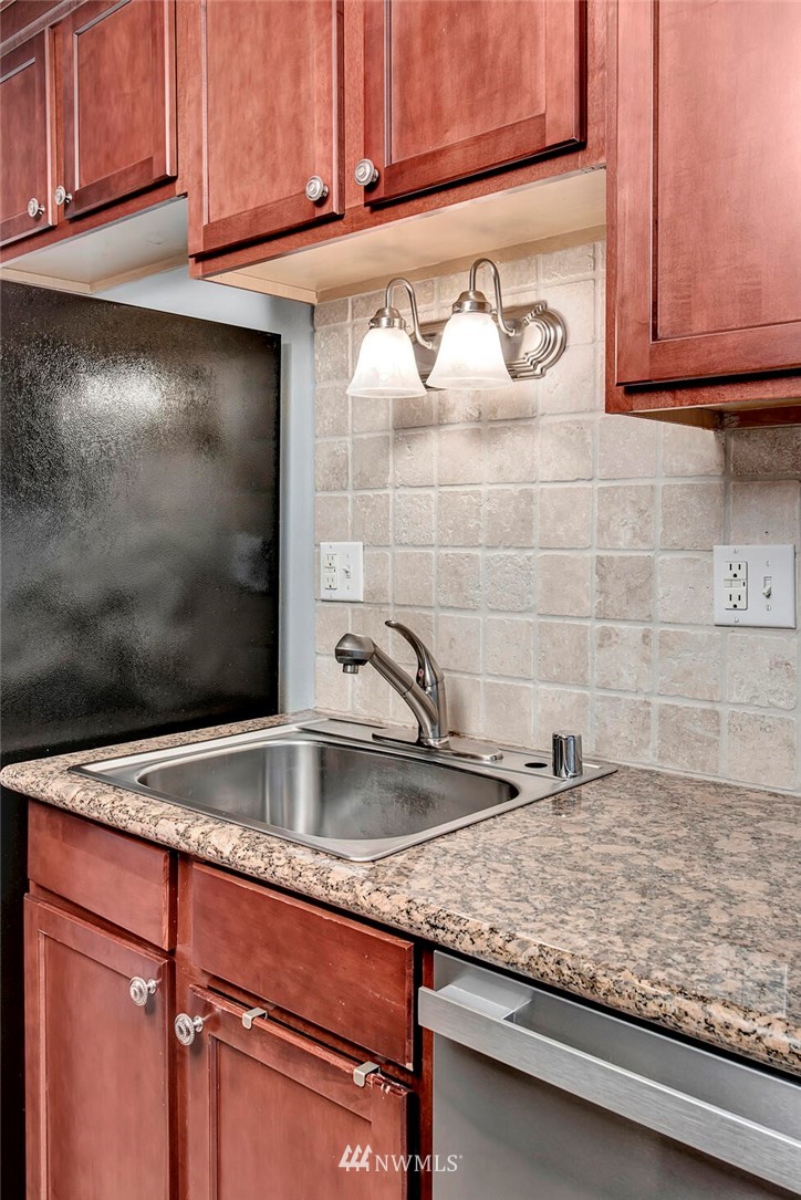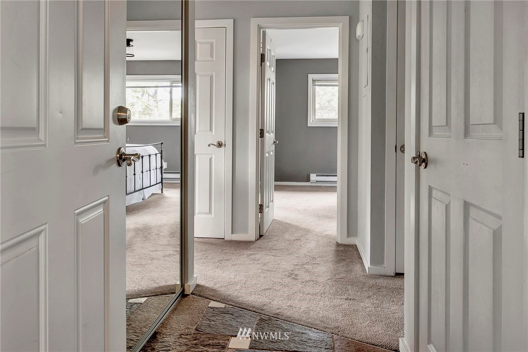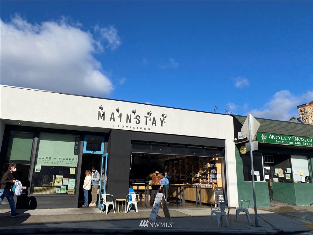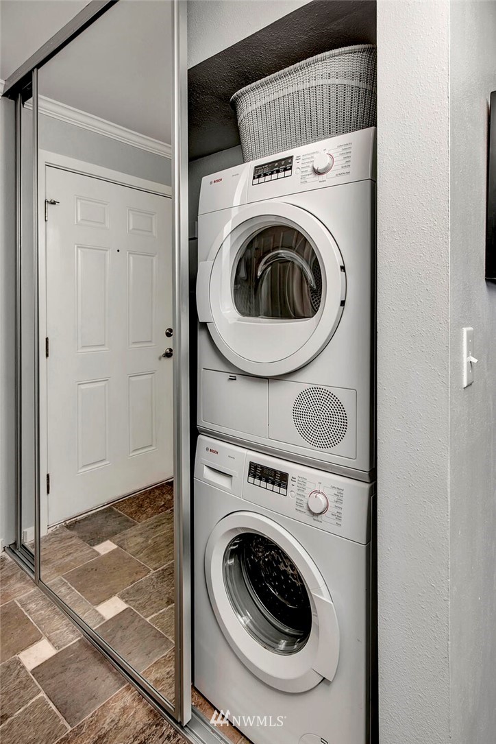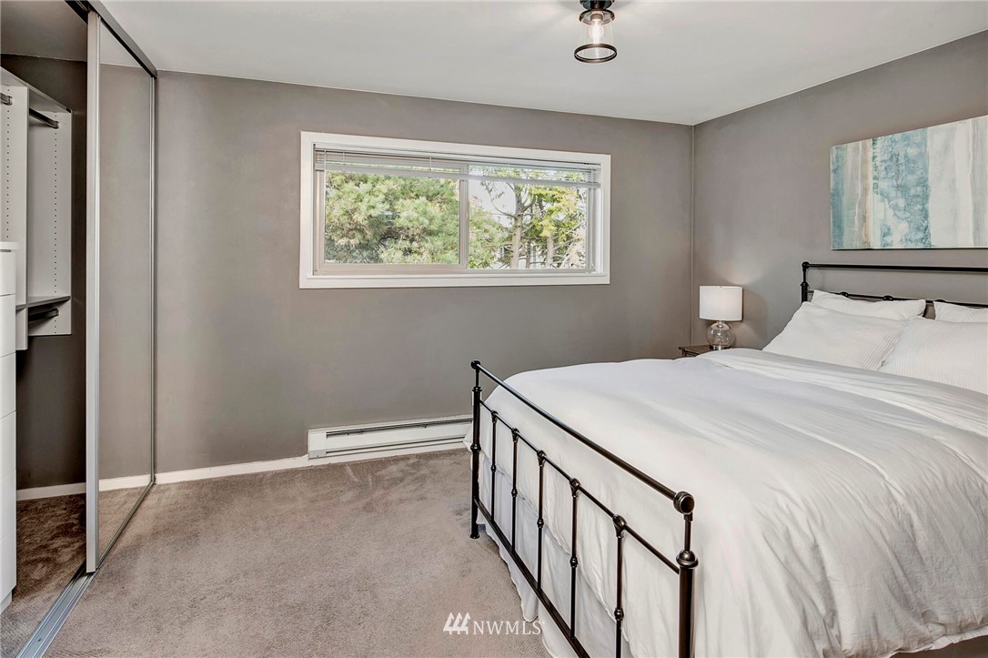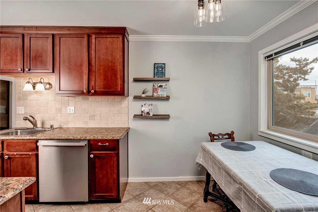Soak up brightness and trees at Ballard Landing. Western-facing, top floor, corner unit offers tranquility and close-knit community. Delightful walk to premium grocery store, historical downtown, hip 65th street, breweries, endless restaurants. Park two blocks away (pup haven). 92 walk score! Come home to style, LOTS of light, spacious deck, crown molding, new light fixtures, in-unit Bosch washer/dryer, and four closets (including two California Closets). Dreamy layout. Secure storage unit and bike room in basement. One parking spot. Expert HOA with no special assessments to date – well-planned reserves to keep the mid-century modern building in shape. Majority owner-occupied, rent friendly. Relax and live the dream in beloved Ballard.