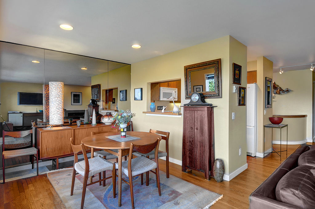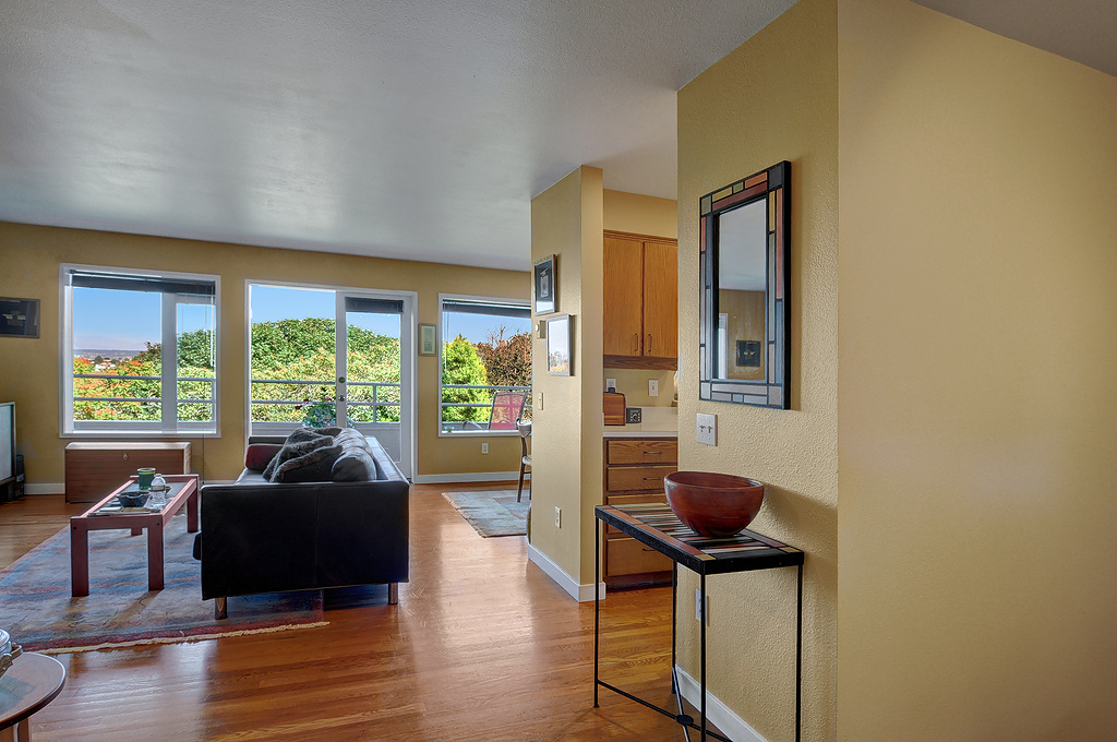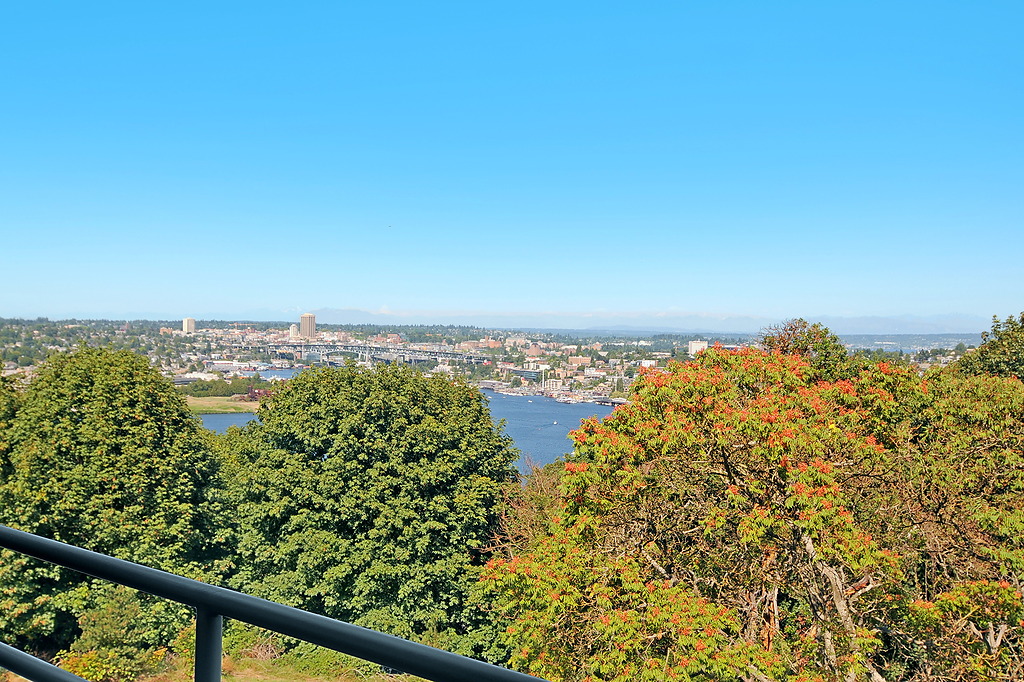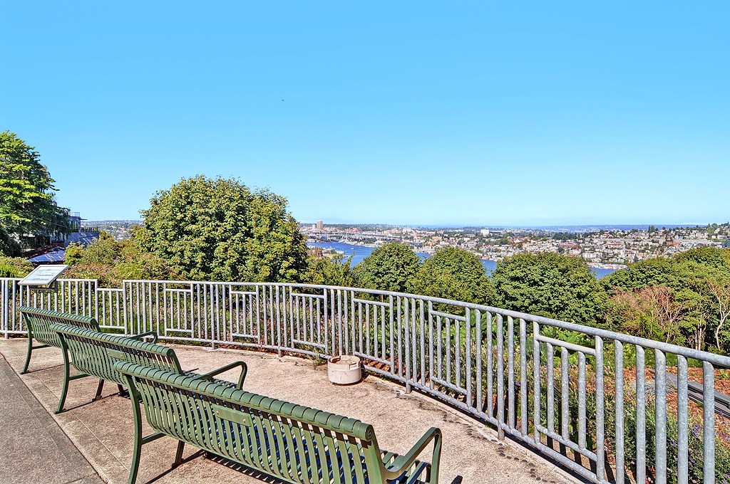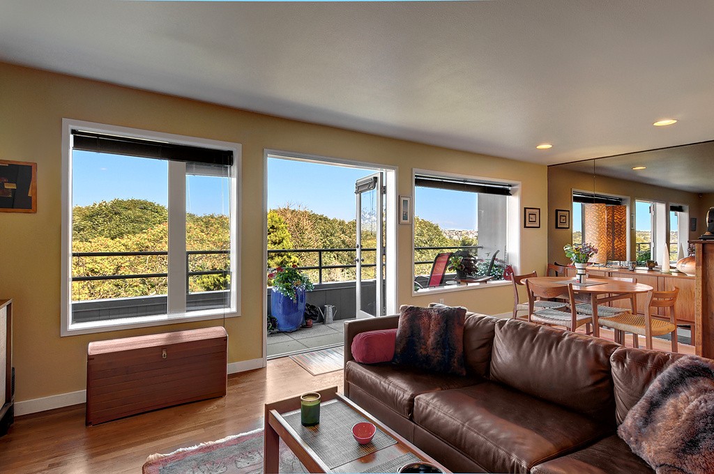 Delightful townhouse-style home in quality-built, stable, well-managed complex of just 10 units, EZ access to shopping, services, Q A Ave, Seattle Center, Fremont. Wall of windows across living & dining rooms allow for maximum light. Enjoy sunrise and moonrise over the Cascades, sailboats on Duck Dodge, fireworks on the 4th. Stable, solvent HOA, well-managed building. TWO garage parking spaces and FOUR storage areas! Quiet, 2-block section of Taylor, off the beaten track. Private and woodsy.