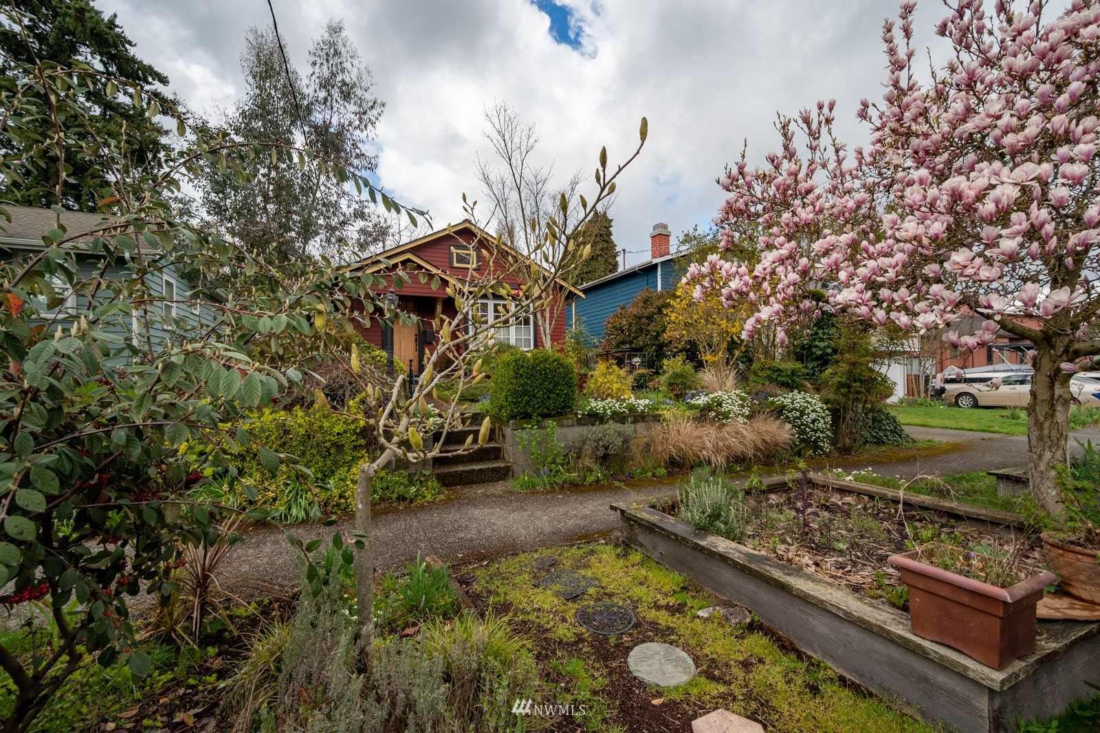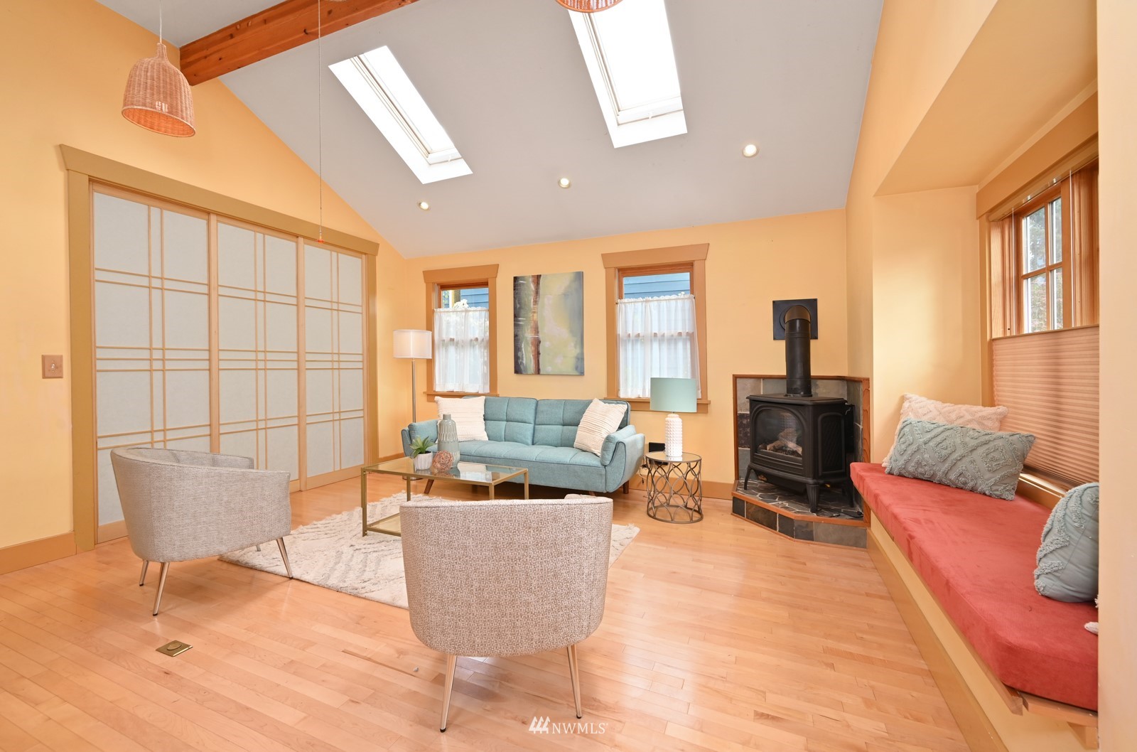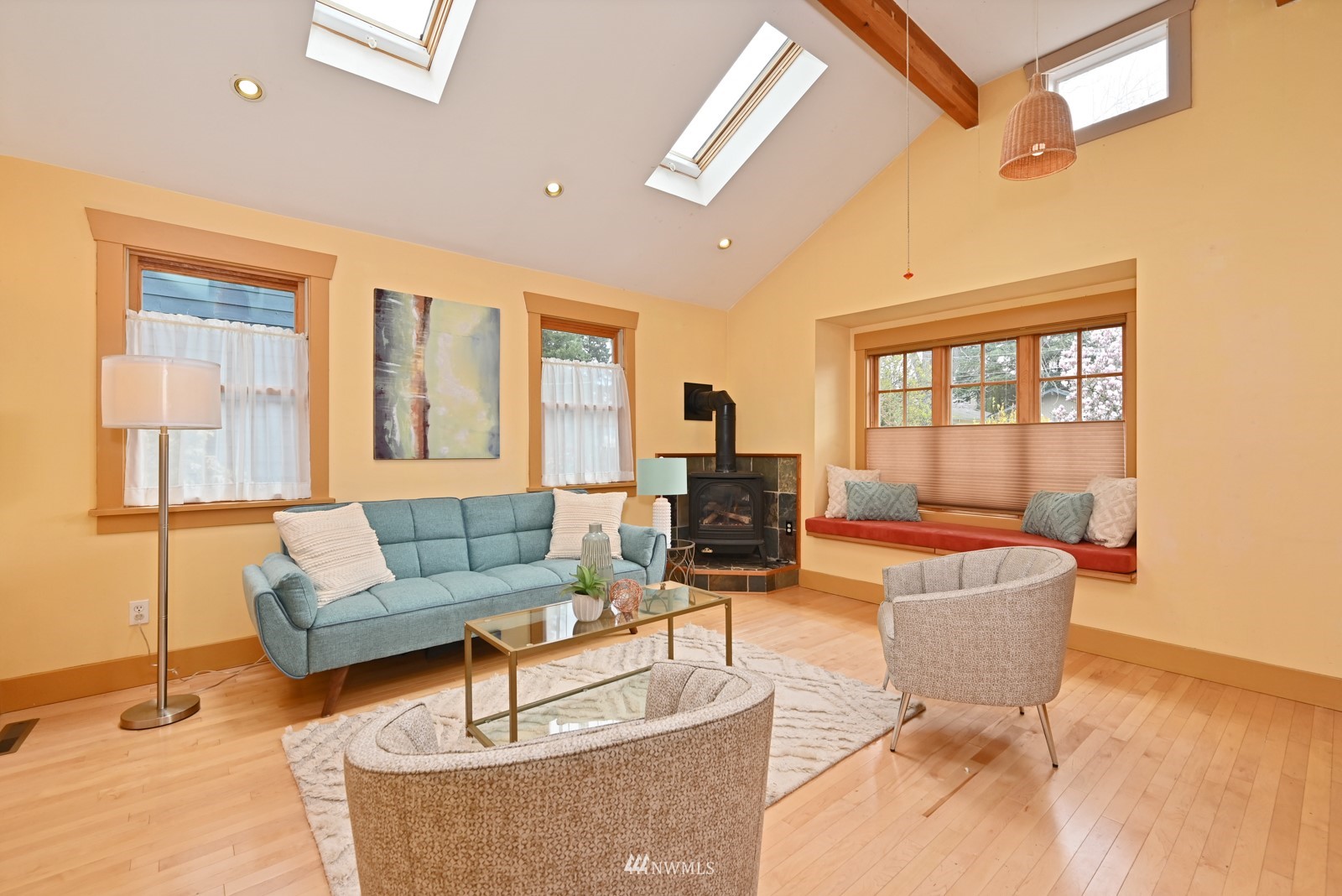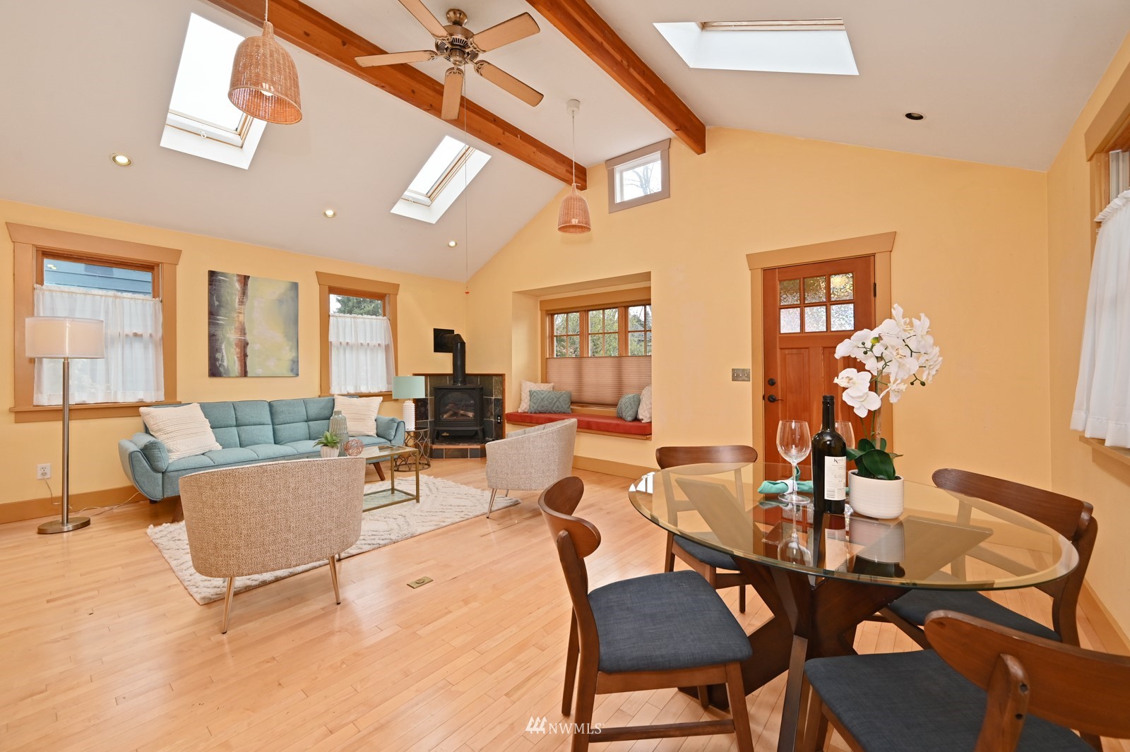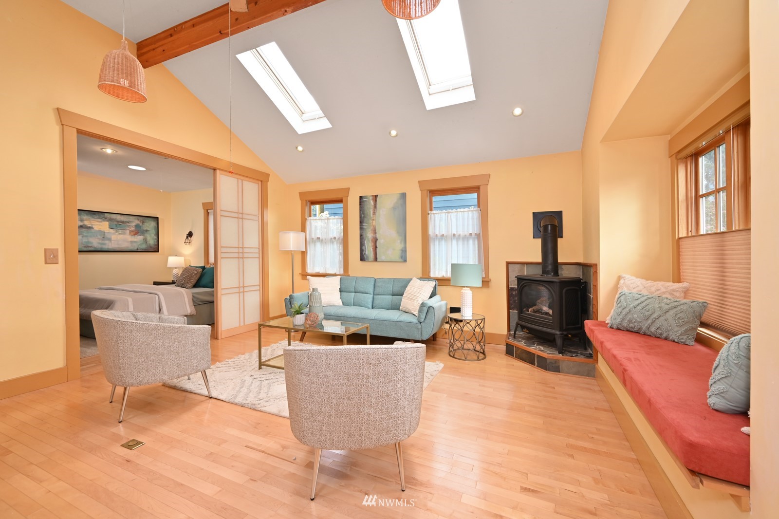 Much loved storybook contemporary “cottage” in lush, gardened setting. Small, home sweet home! Completely remodeled, feels spacious with cathedral ceilings, skylights, cozy wood-burning stove and beautiful Maple floors. Window seat overlooks front yard. Sliding doors open to chic primary bedroom with large closet. Bathroom has a beautiful bowl sink / walk-in rain shower. Bonus small office or mudroom overlooks backyard. Beautiful large lot with covered deck, garden shed and lots of space. Dry, low-ceiling storage basement. Great neighborhood with lush surroundings. Easy access to groceries, home baked goodies at local cafe, 1 mile to Light Rail, just 1.5 miles to Green Lake!