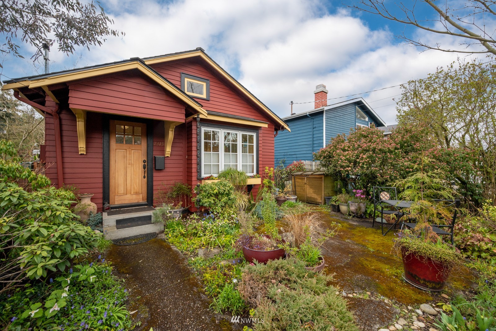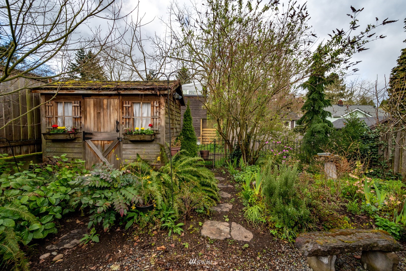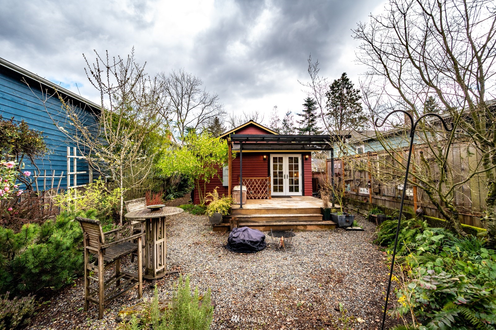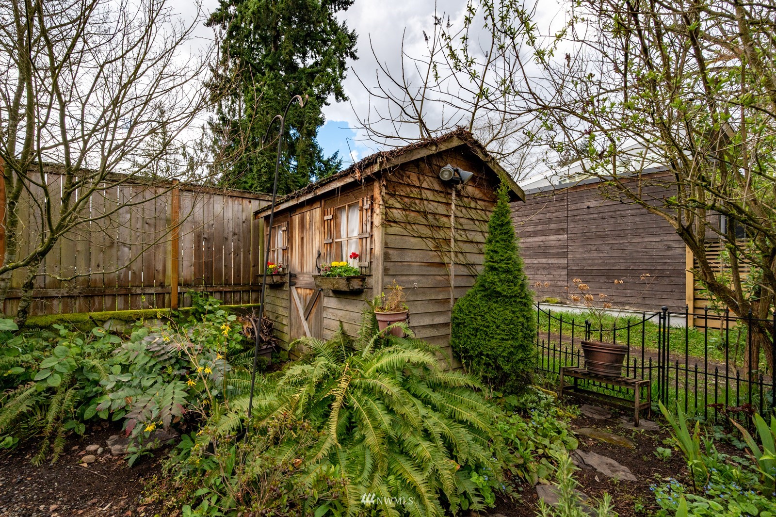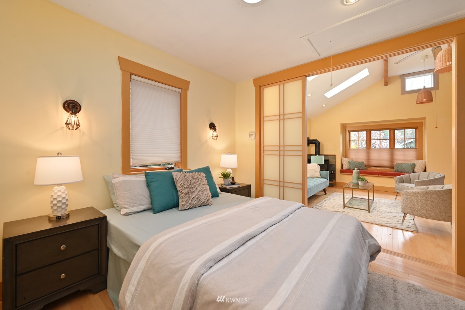 Much loved storybook contemporary “cottage” in lush, gardened setting. Small, home sweet home! Completely remodeled, feels spacious with cathedral ceilings, skylights, cozy wood-burning stove and beautiful Maple floors. Window seat overlooks front yard. Sliding doors open to chic primary bedroom with large closet. Bathroom has a beautiful bowl sink / walk-in rain shower. Bonus small office or mudroom overlooks backyard. Beautiful large lot with covered deck, garden shed and lots of space. Dry, low-ceiling storage basement. Great neighborhood with lush surroundings. Easy access to groceries, home baked goodies at local cafe, 1 mile to Light Rail, just 1.5 miles to Green Lake!
