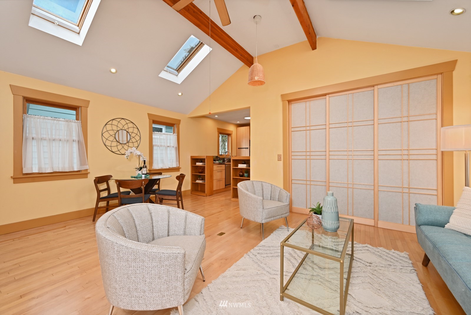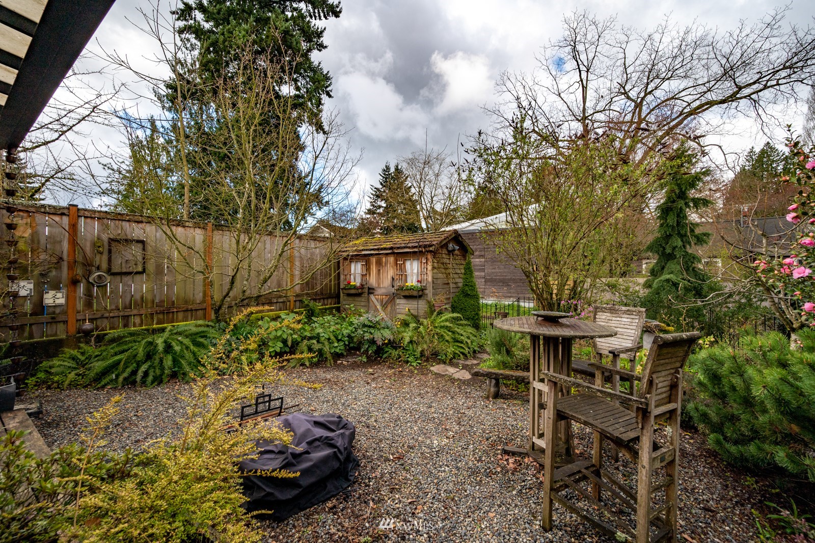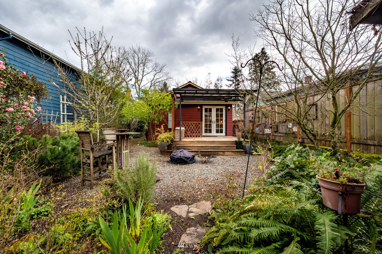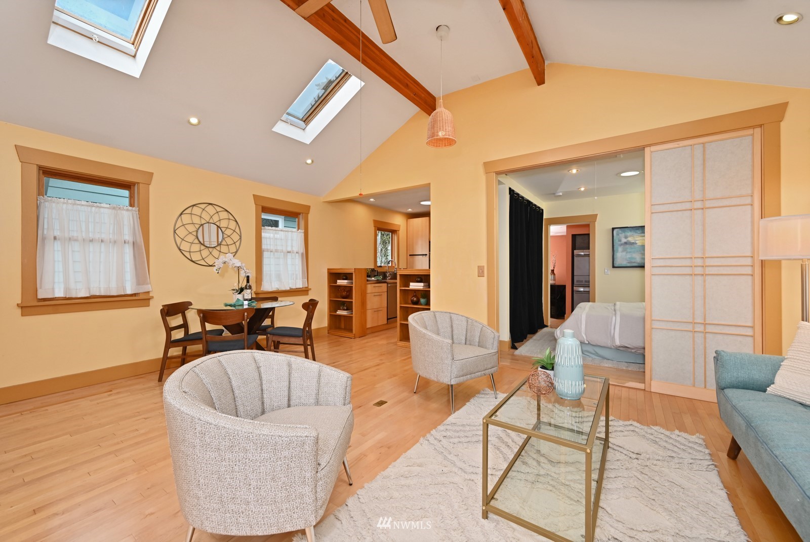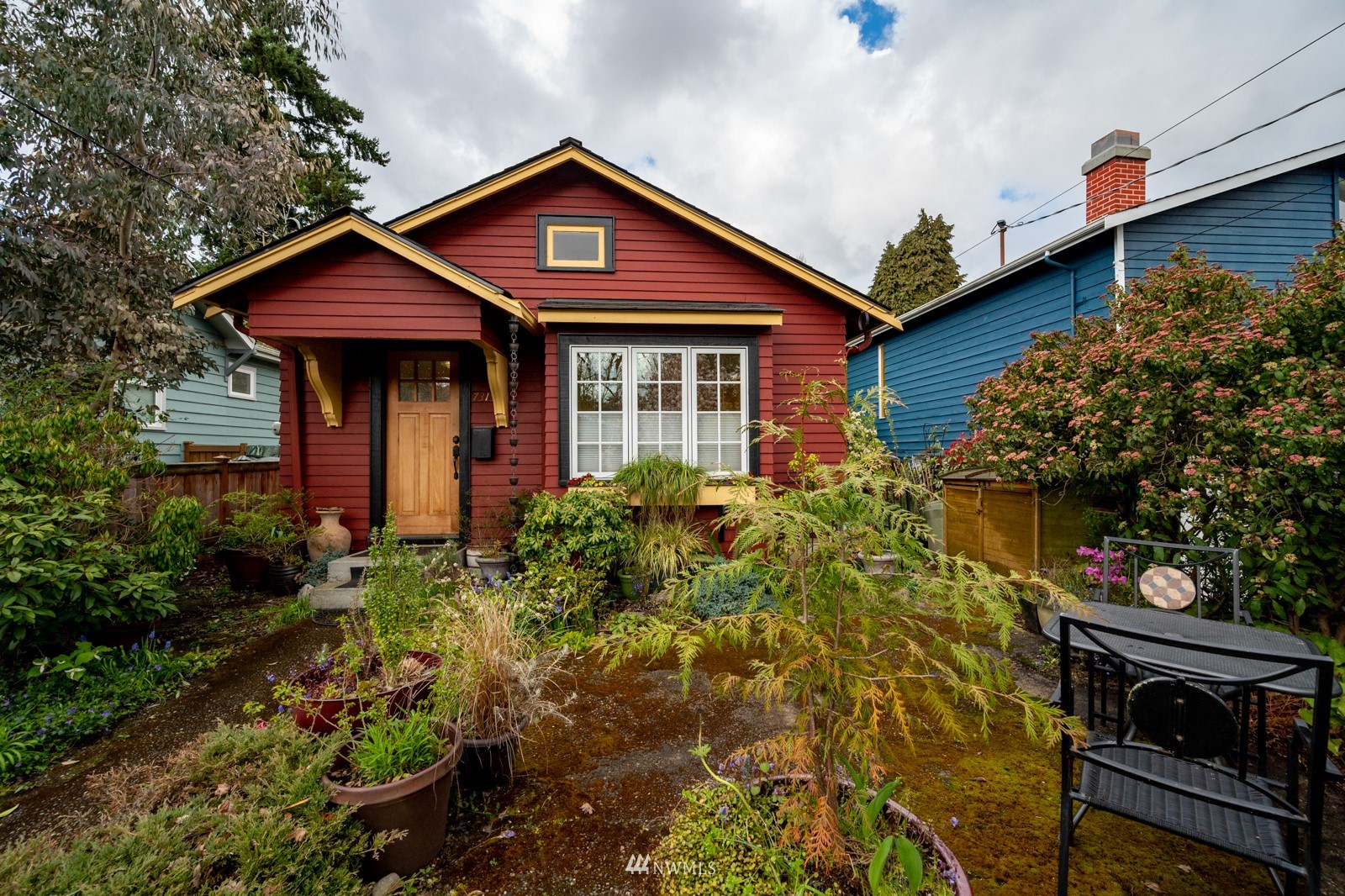 Much loved storybook contemporary “cottage” in lush, gardened setting. Small, home sweet home! Completely remodeled, feels spacious with cathedral ceilings, skylights, cozy wood-burning stove and beautiful Maple floors. Window seat overlooks front yard. Sliding doors open to chic primary bedroom with large closet. Bathroom has a beautiful bowl sink / walk-in rain shower. Bonus small office or mudroom overlooks backyard. Beautiful large lot with covered deck, garden shed and lots of space. Dry, low-ceiling storage basement. Great neighborhood with lush surroundings. Easy access to groceries, home baked goodies at local cafe, 1 mile to Light Rail, just 1.5 miles to Green Lake!