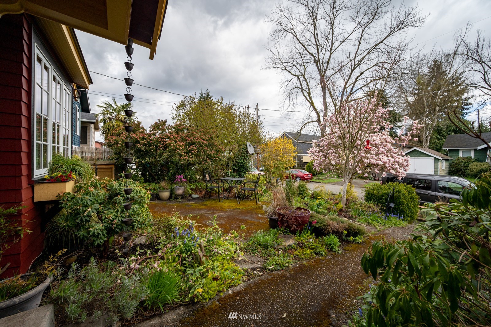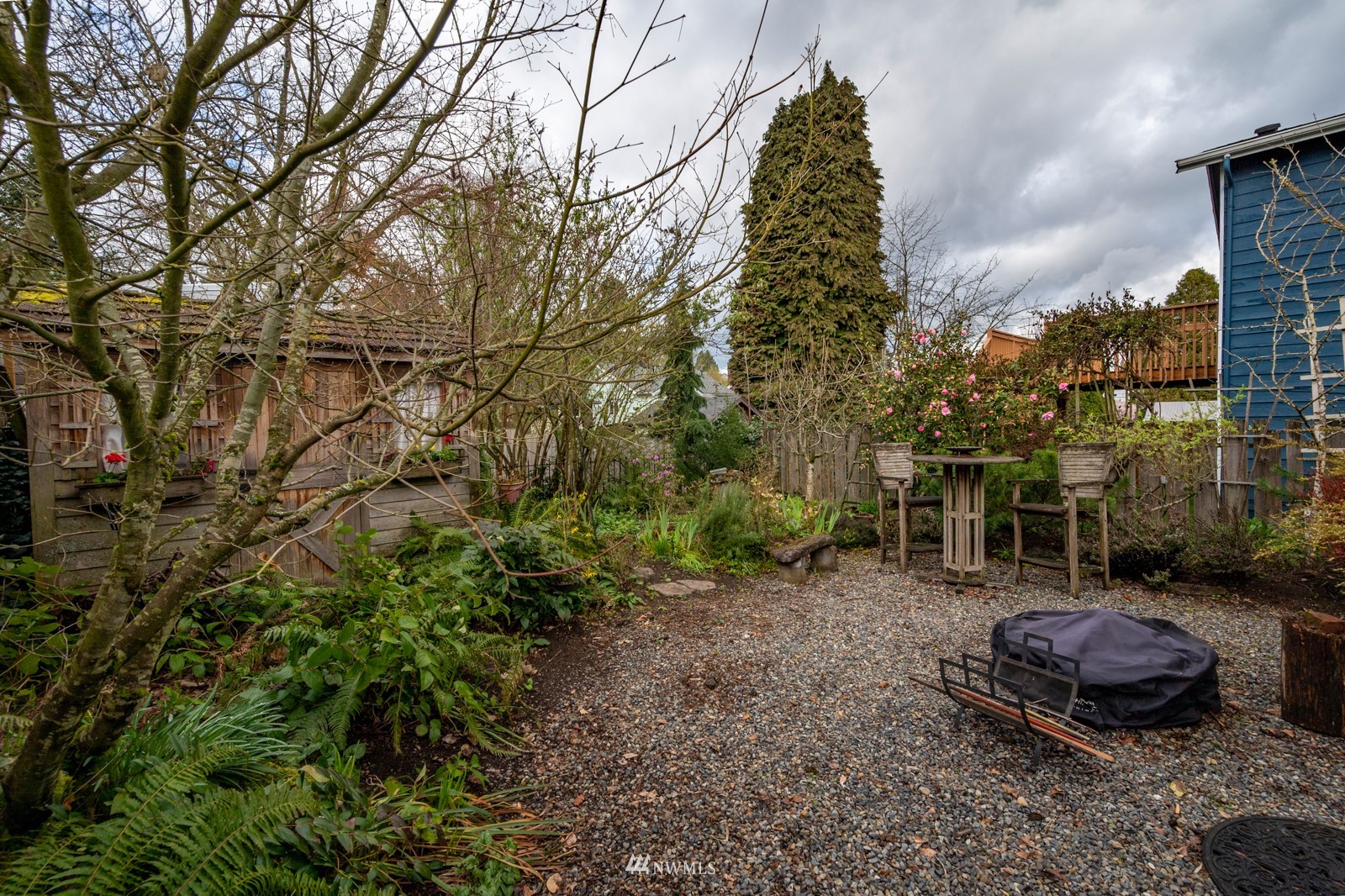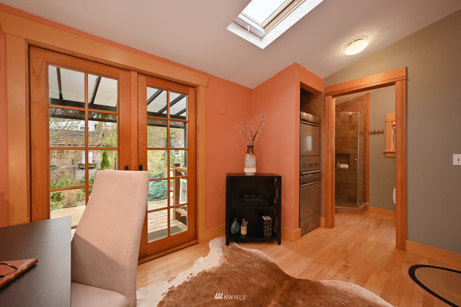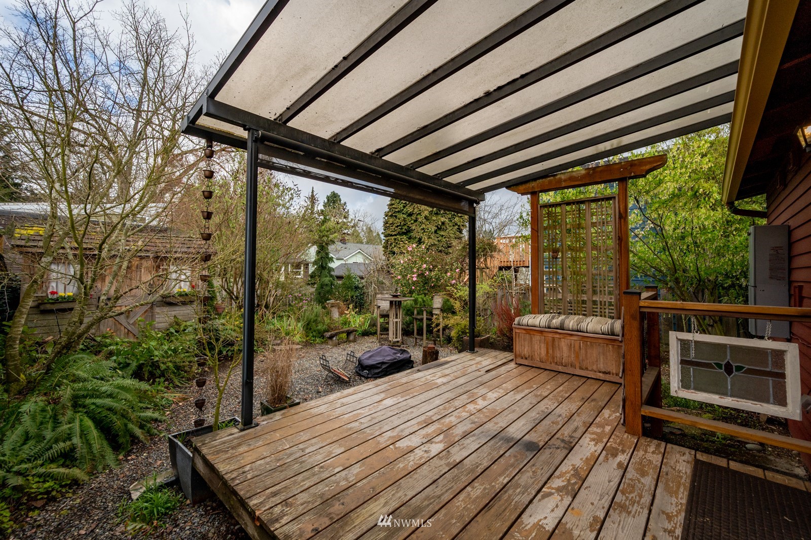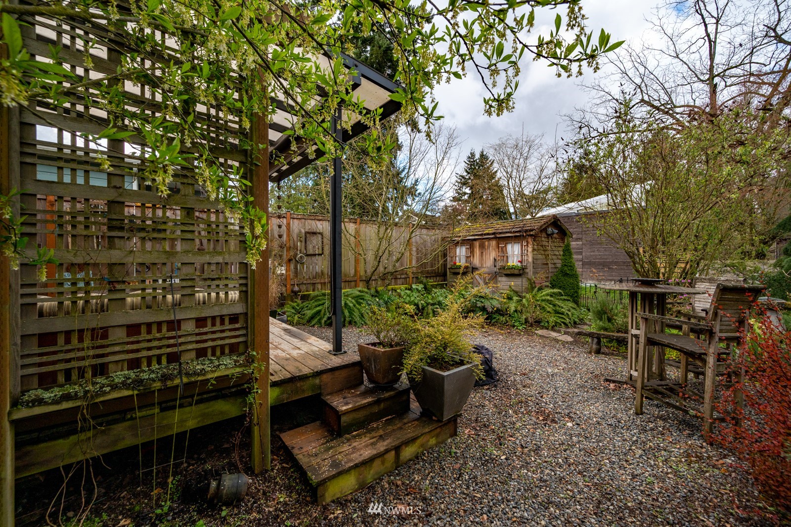 Much loved storybook contemporary “cottage” in lush, gardened setting. Small, home sweet home! Completely remodeled, feels spacious with cathedral ceilings, skylights, cozy wood-burning stove and beautiful Maple floors. Window seat overlooks front yard. Sliding doors open to chic primary bedroom with large closet. Bathroom has a beautiful bowl sink / walk-in rain shower. Bonus small office or mudroom overlooks backyard. Beautiful large lot with covered deck, garden shed and lots of space. Dry, low-ceiling storage basement. Great neighborhood with lush surroundings. Easy access to groceries, home baked goodies at local cafe, 1 mile to Light Rail, just 1.5 miles to Green Lake!