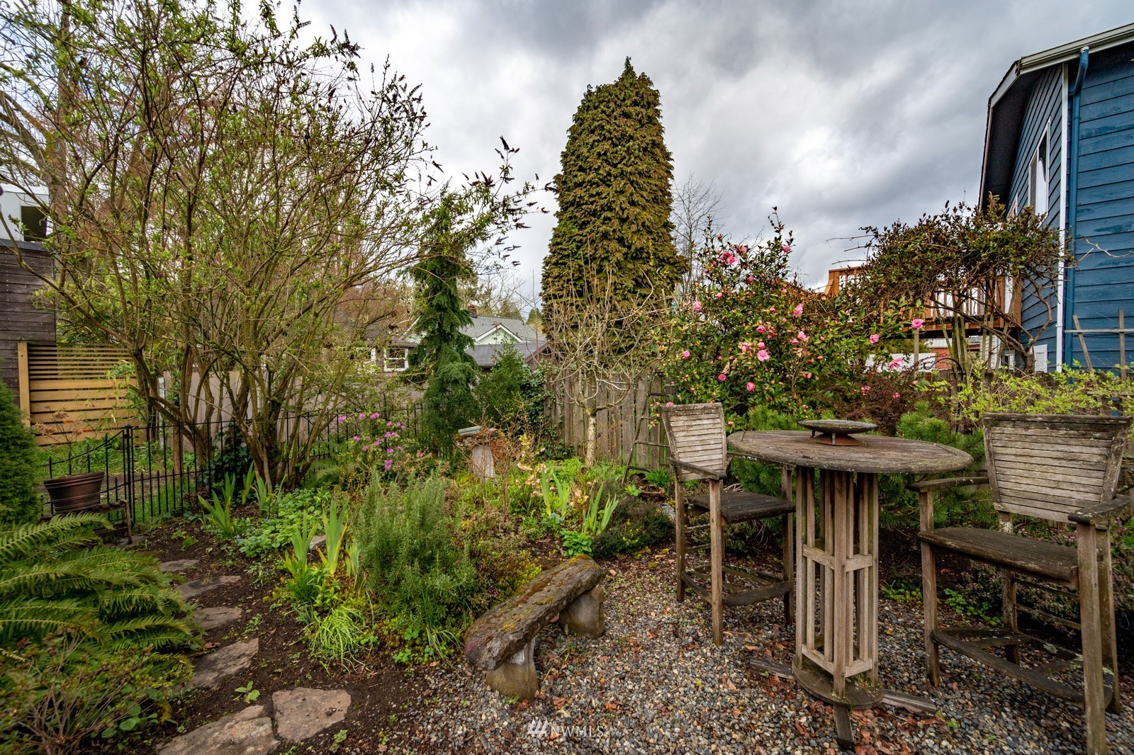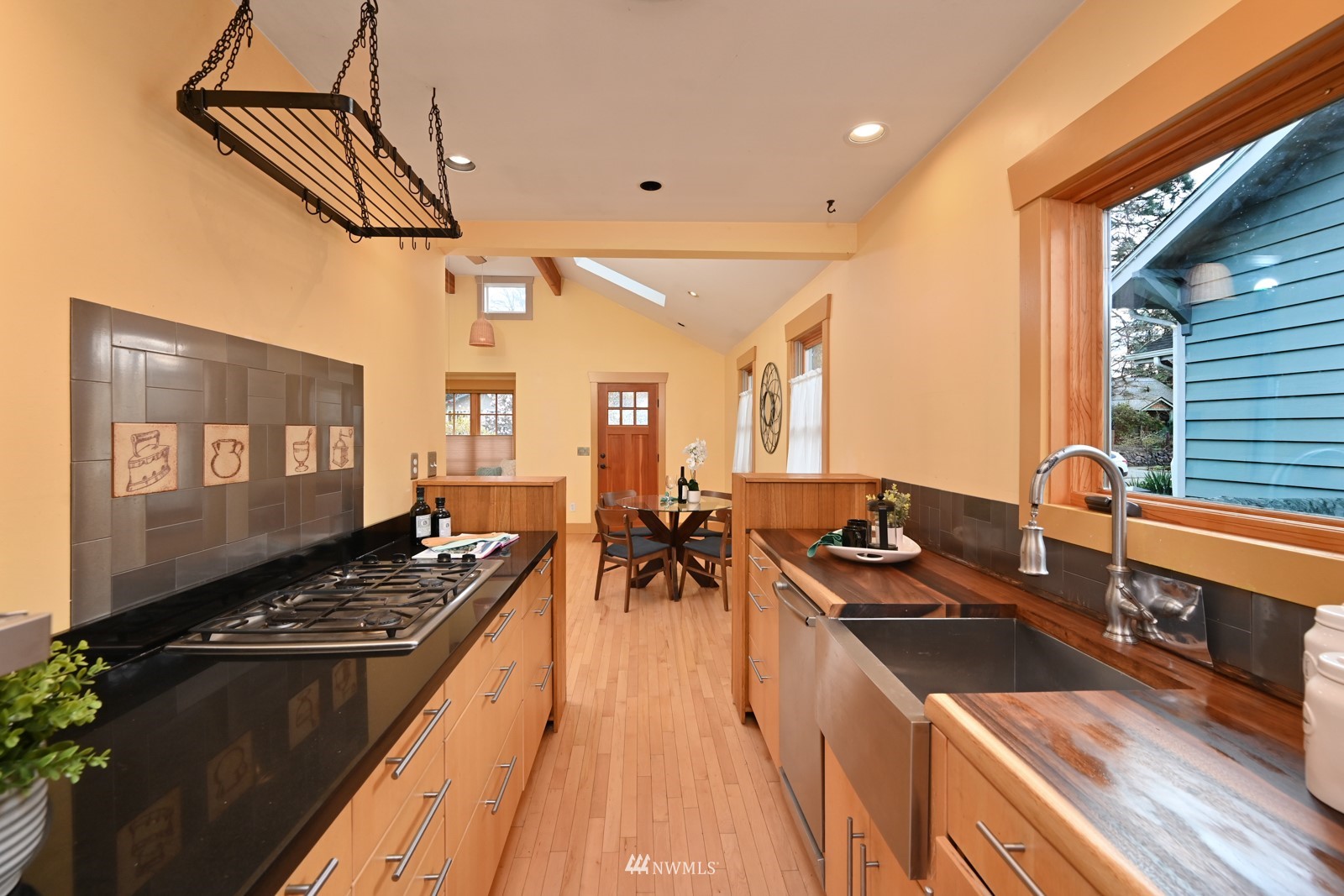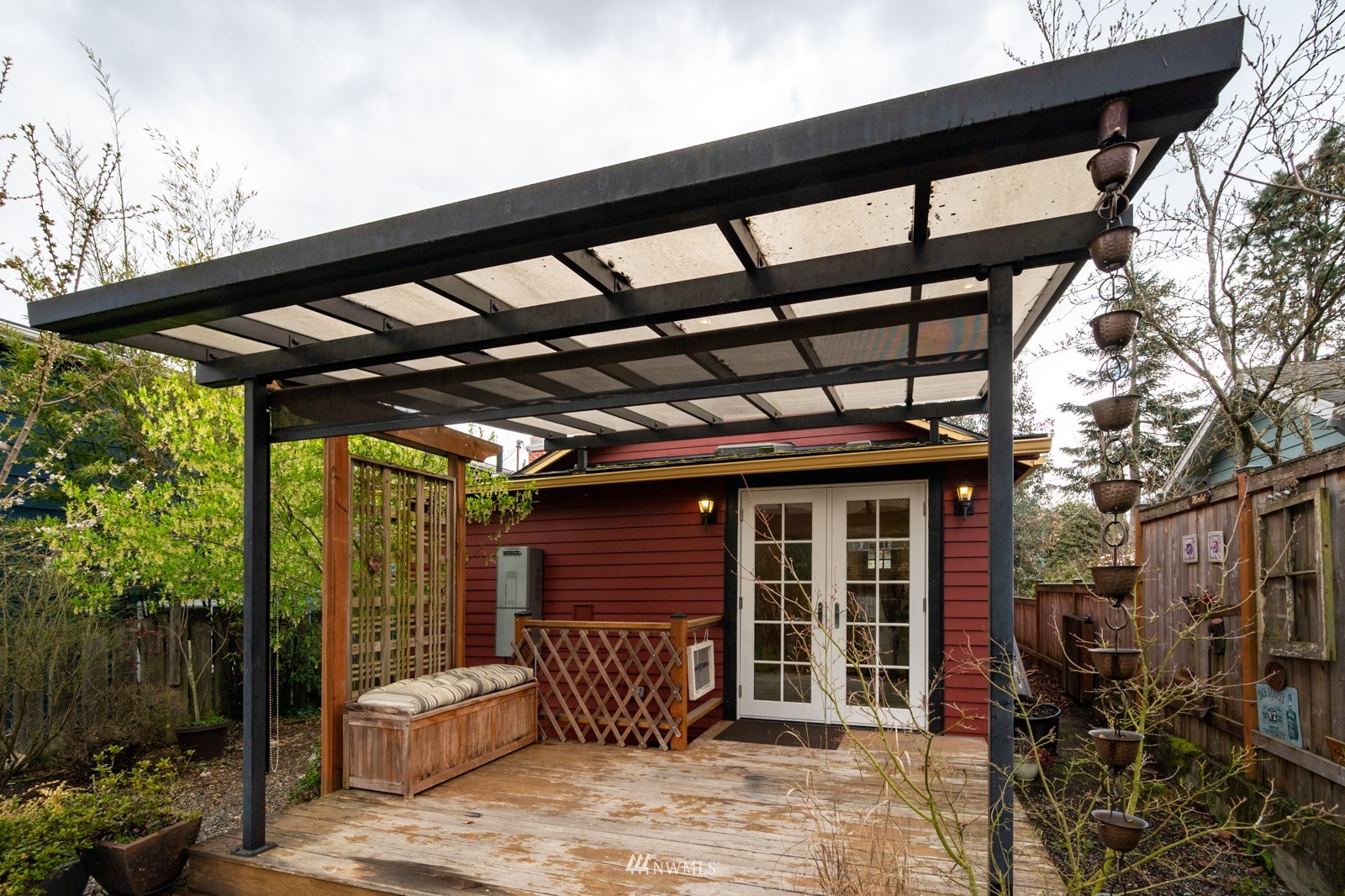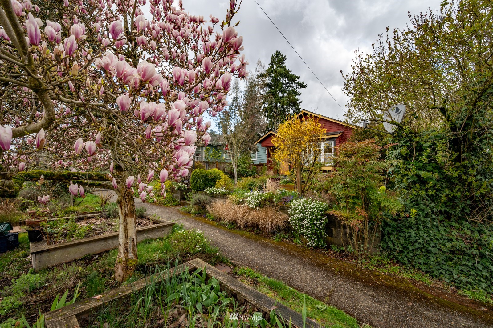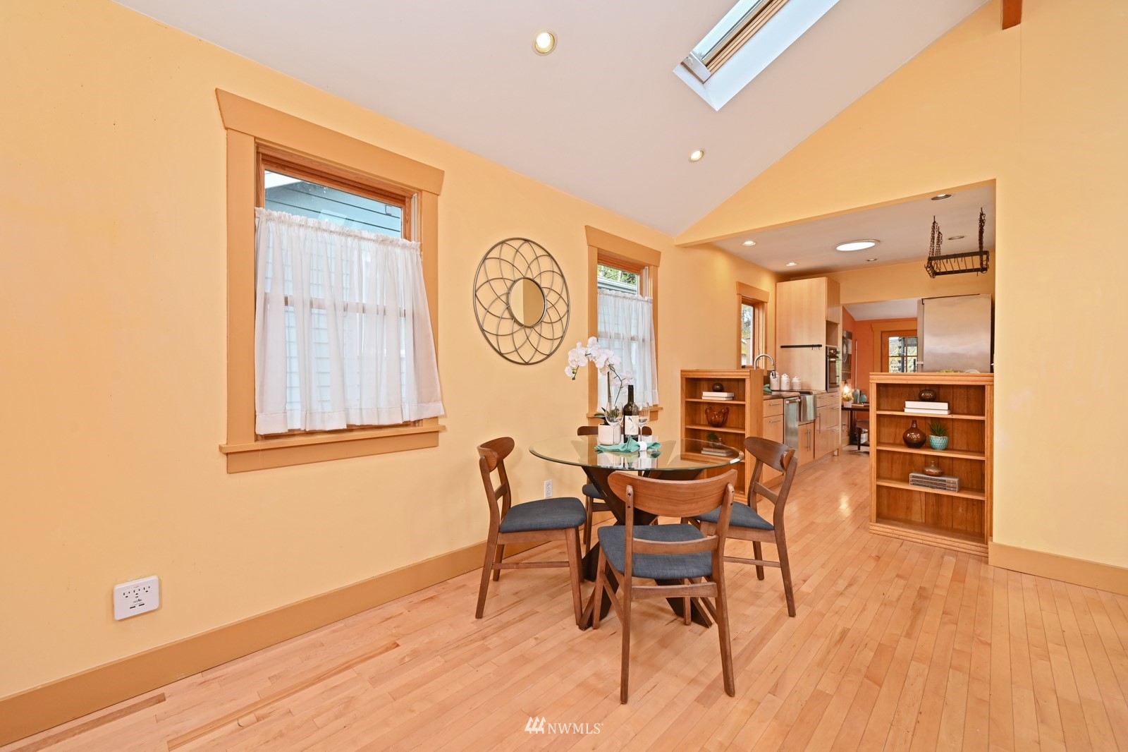 Much loved storybook contemporary “cottage” in lush, gardened setting. Small, home sweet home! Completely remodeled, feels spacious with cathedral ceilings, skylights, cozy wood-burning stove and beautiful Maple floors. Window seat overlooks front yard. Sliding doors open to chic primary bedroom with large closet. Bathroom has a beautiful bowl sink / walk-in rain shower. Bonus small office or mudroom overlooks backyard. Beautiful large lot with covered deck, garden shed and lots of space. Dry, low-ceiling storage basement. Great neighborhood with lush surroundings. Easy access to groceries, home baked goodies at local cafe, 1 mile to Light Rail, just 1.5 miles to Green Lake!