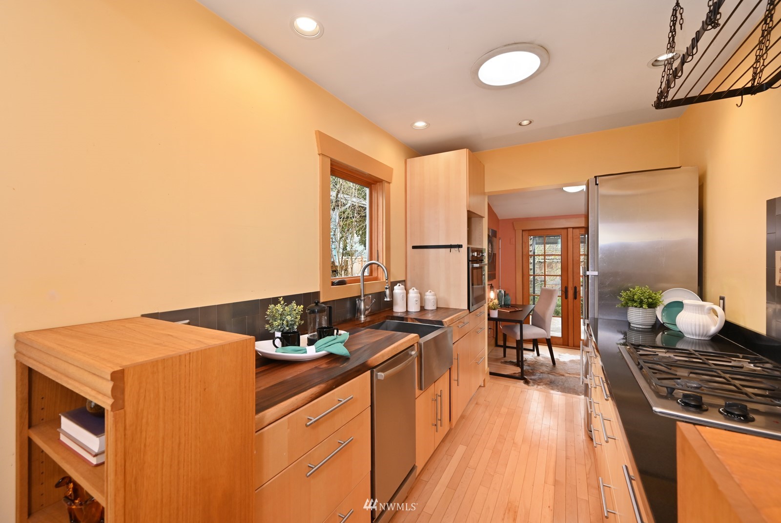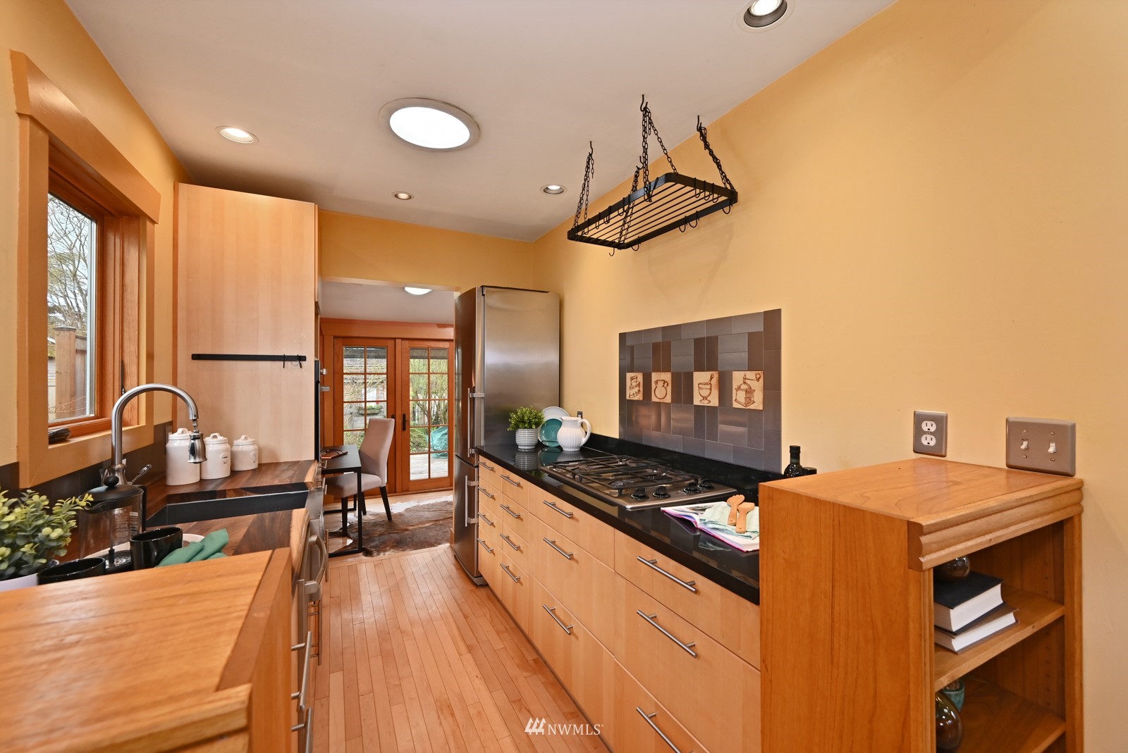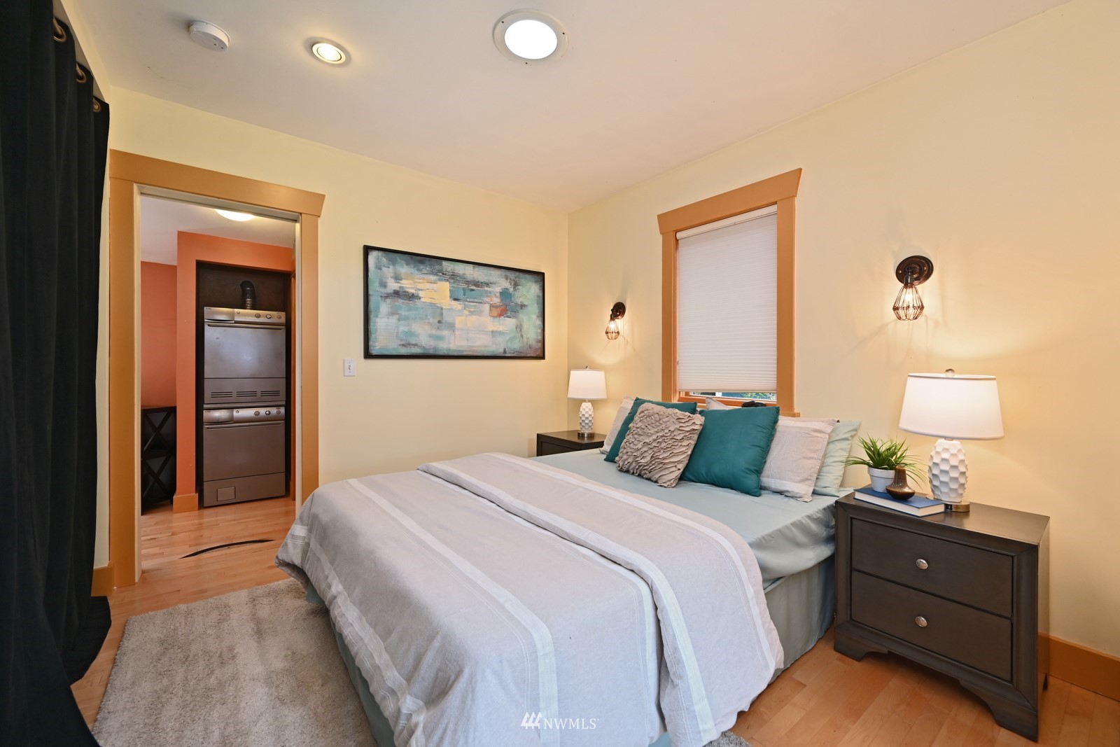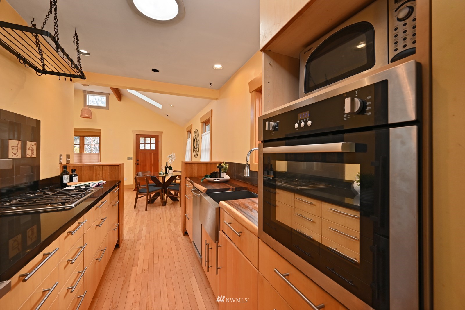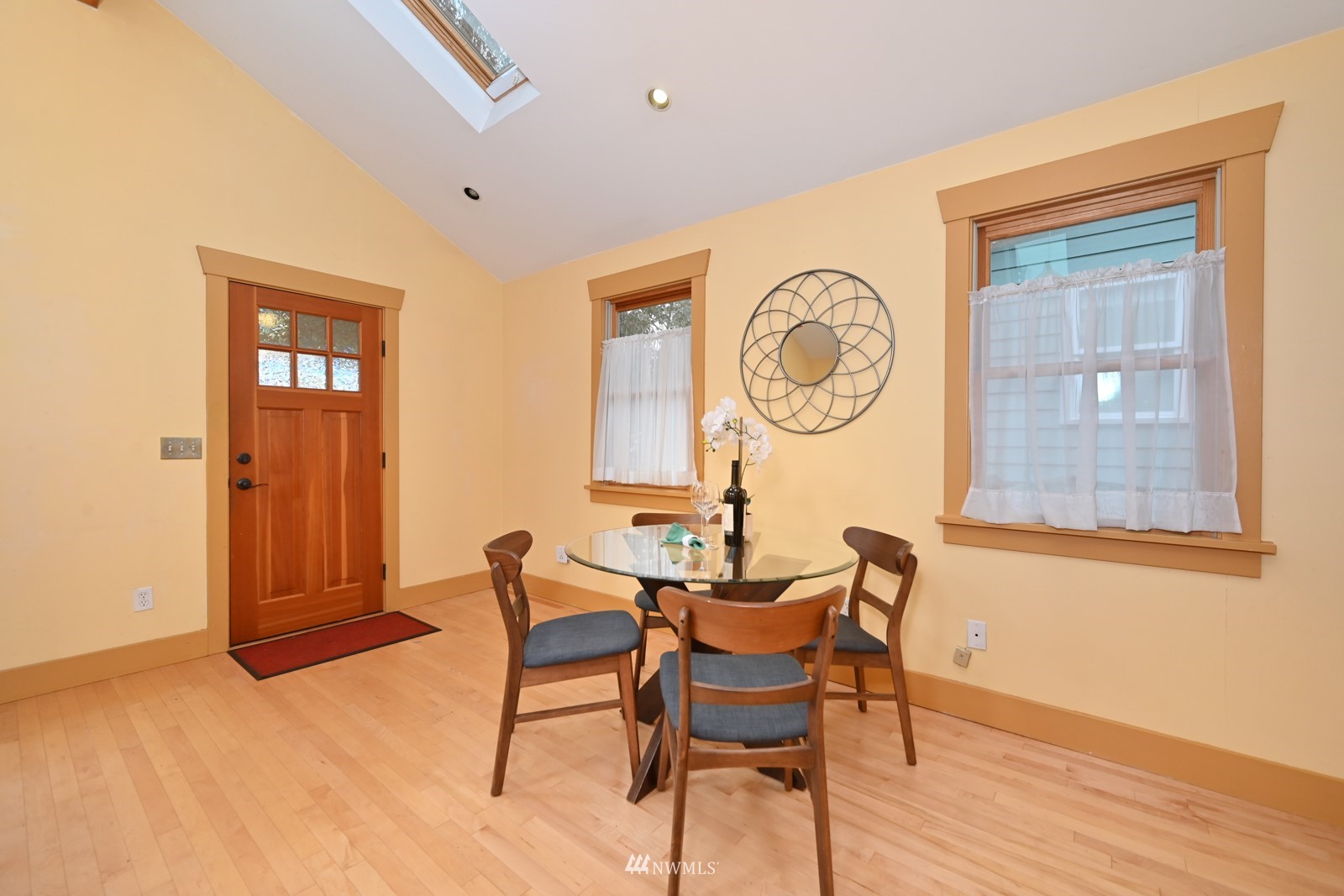 Much loved storybook contemporary “cottage” in lush, gardened setting. Small, home sweet home! Completely remodeled, feels spacious with cathedral ceilings, skylights, cozy wood-burning stove and beautiful Maple floors. Window seat overlooks front yard. Sliding doors open to chic primary bedroom with large closet. Bathroom has a beautiful bowl sink / walk-in rain shower. Bonus small office or mudroom overlooks backyard. Beautiful large lot with covered deck, garden shed and lots of space. Dry, low-ceiling storage basement. Great neighborhood with lush surroundings. Easy access to groceries, home baked goodies at local cafe, 1 mile to Light Rail, just 1.5 miles to Green Lake!